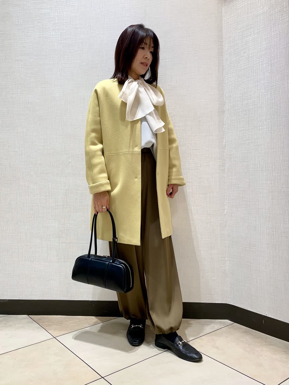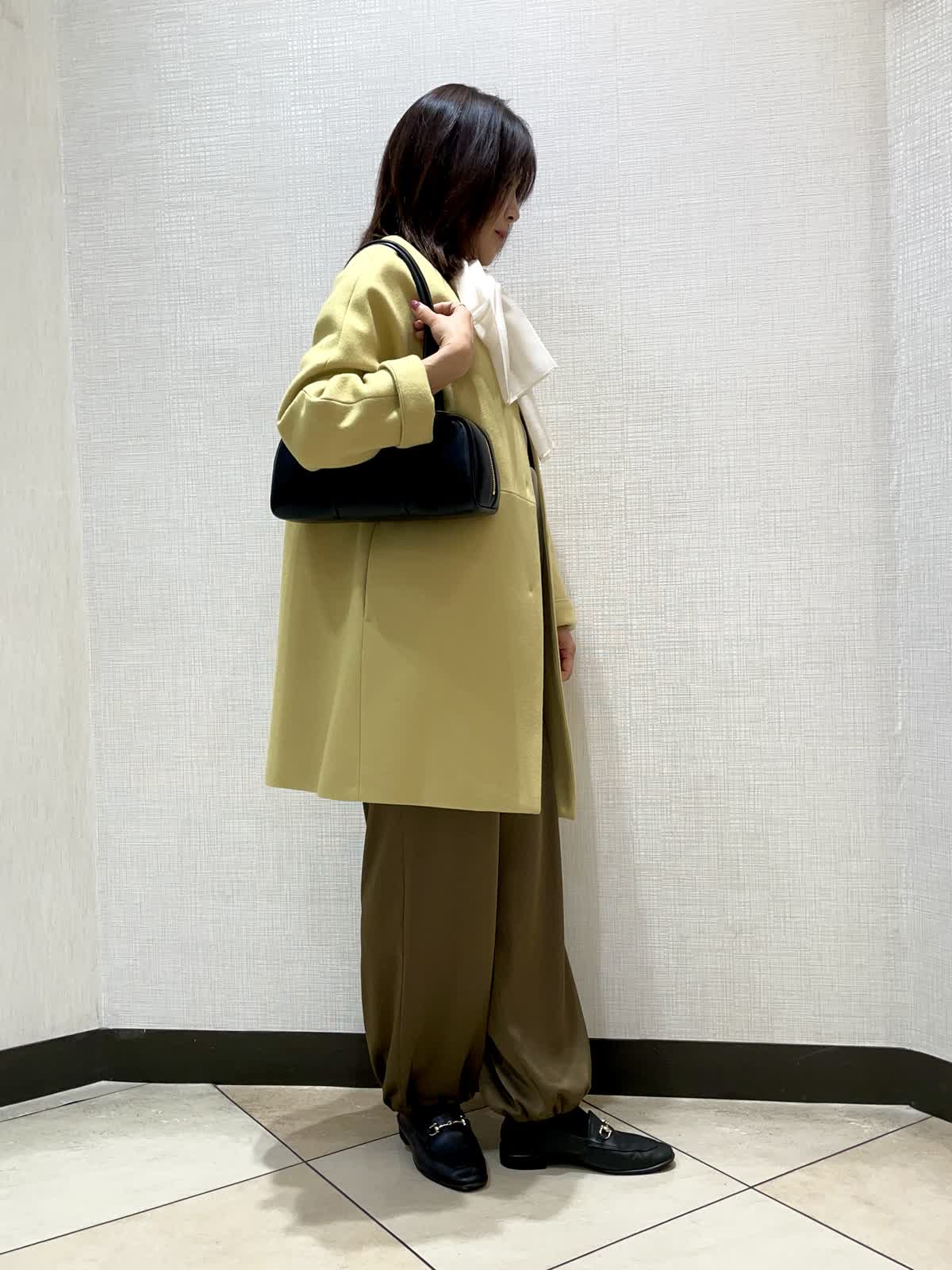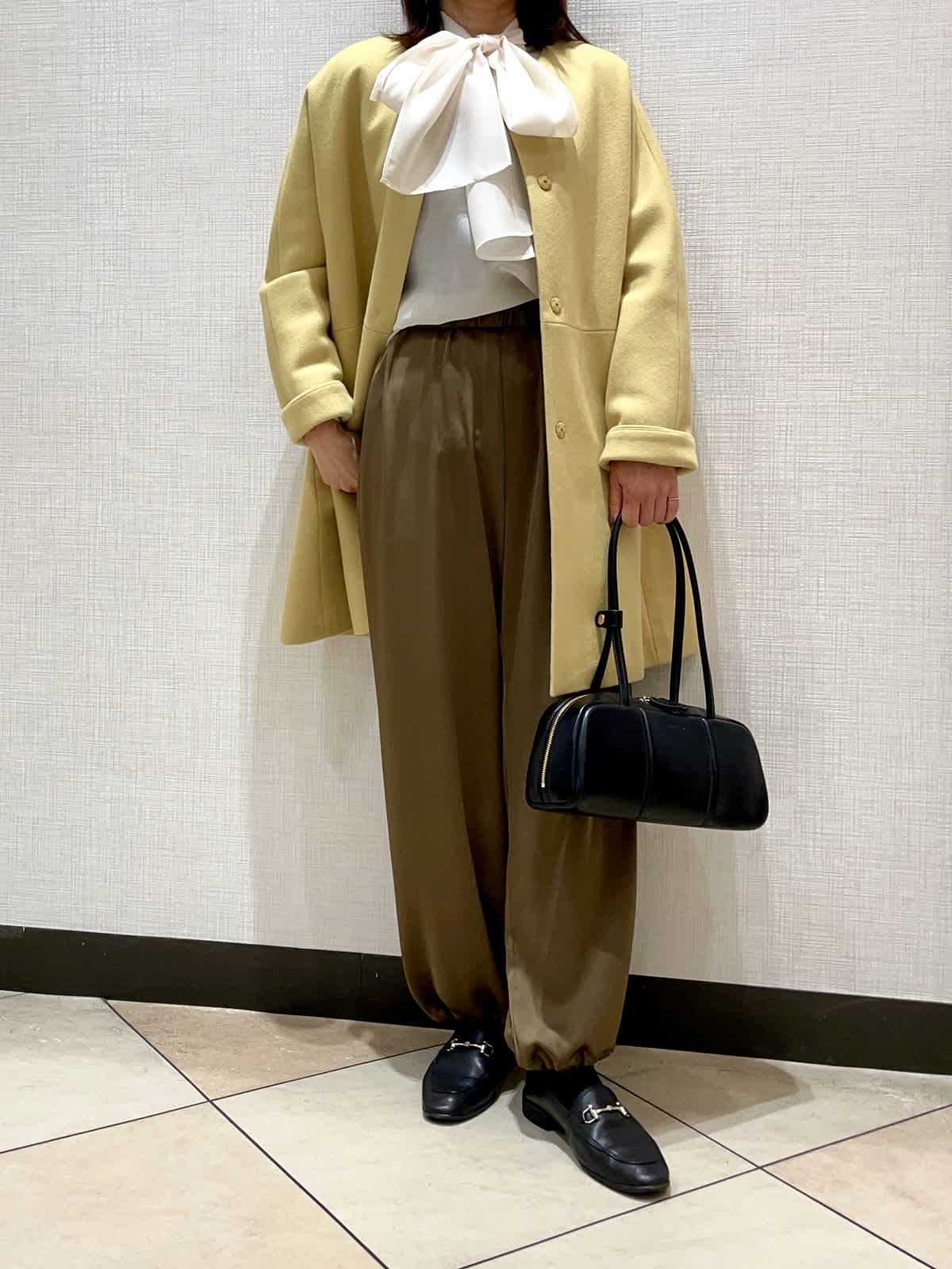 【着用サイズ】ブラウス:9号、パンツ:フリー、コート:9号【着用カラー】ブラウス:ネイビー パンツ:カーキ コート:イエローキレイめお出かけスタイル。きれいな色のコートにインナーをリボンタイのブラウスを合わせて華やかなお出かけスタル。パンツは適度にハリのある素材で落ち感があり甘くなりすぎないスタイリングにしてみました。