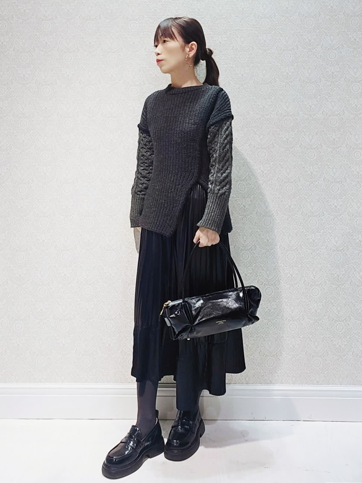 【着用サイズ】 ニット:9号 スカート:7号 バック:フリー 【着用カラー】 ニット:グレー スカート:スミクロ バック:ブラック デザイン性のあるバルキーニットはとても暖かくカラーブロッキングの袖やフロントに入ったスリットがポイント。 スリットから見えるボトムのカラーや素材で印象が変わり色々なスタイリングを楽しんで頂けます。