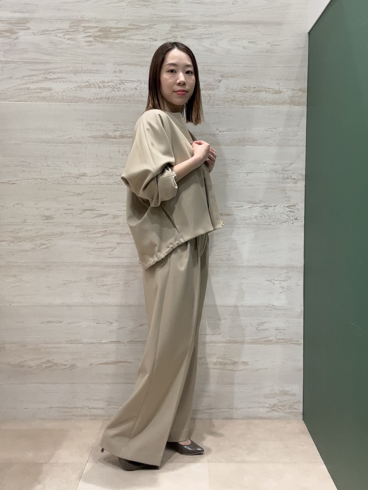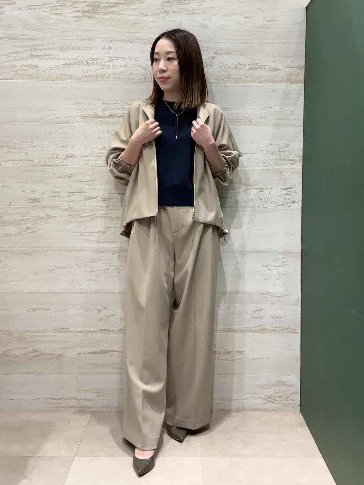 【着用カラー】ブルゾン・パンツ:キャメル ニット:ネイビー 【着用サイズ】ブルゾン・パンツ:9号 ニット:フリー ブルゾンはドルマンスリーブなのでゆったりしていて羽織りやすいです。ボリュームのあるデザイントップスでも袖が通しやすいです。 裾も絞れるようになっているのでこなれ感もあり、カジュアルでも楽しめます。