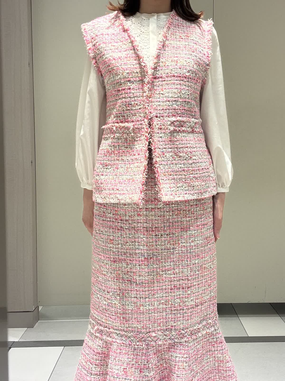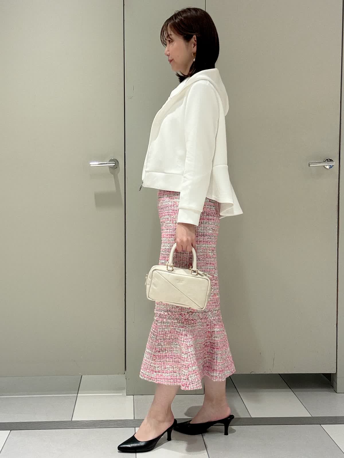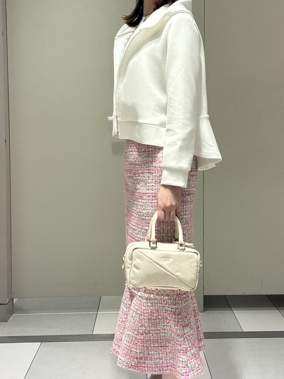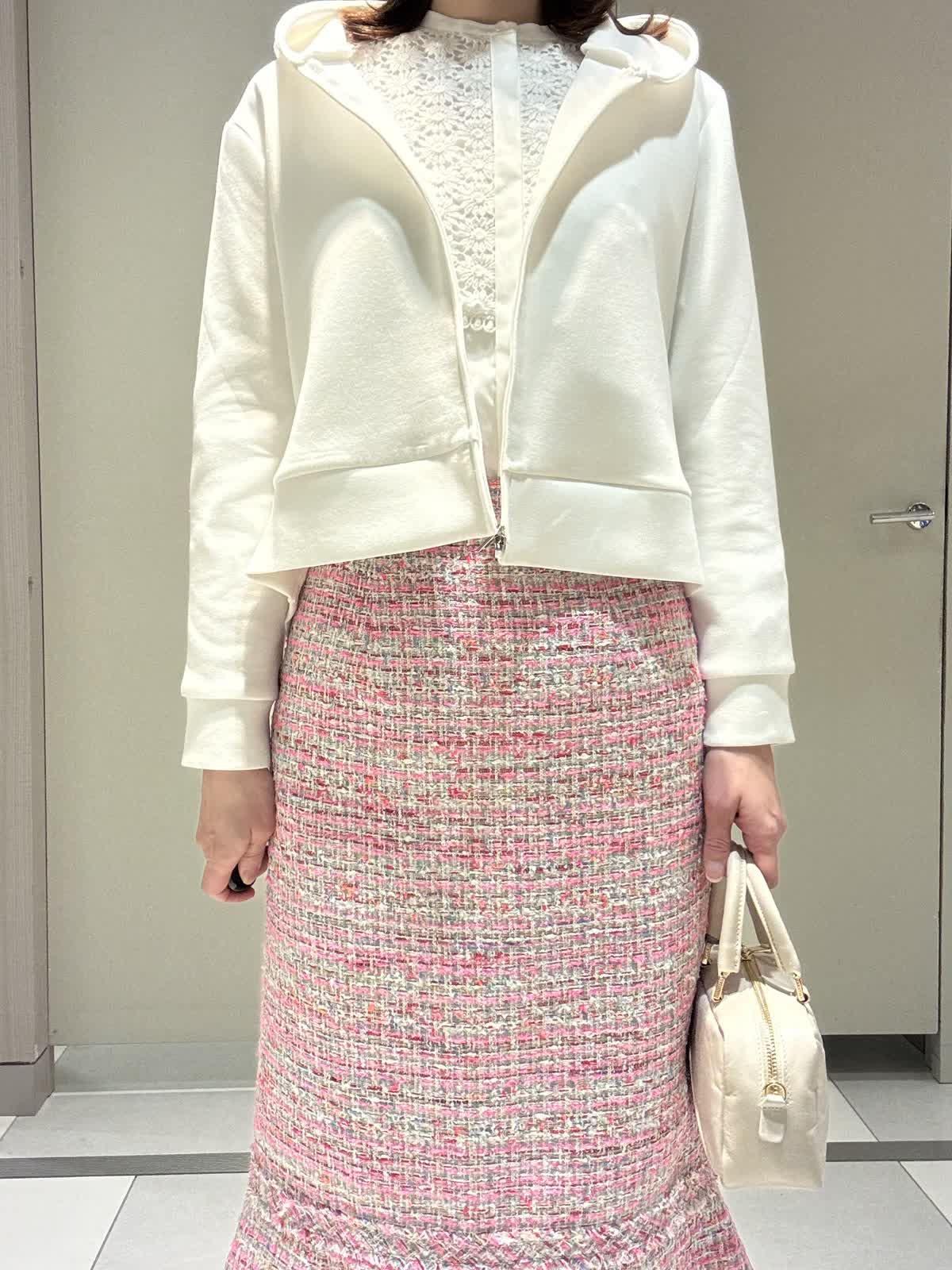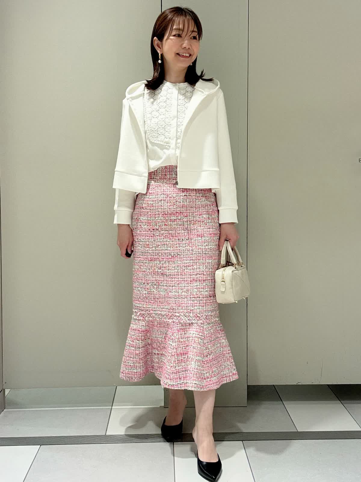 【着用サイズ/カラー】パーカー:9号/オフホワイト ブラウス:7号/オフホワイト スカート:7号/ピンク ジレ:7号/ピンク インポートのツィードスカートに少しカジュアルダウンしパーカーを合わせてみました。パーカーはダンボール素材でカジュアルすぎず、これからの季節の変わり目の羽織りに大活躍です。