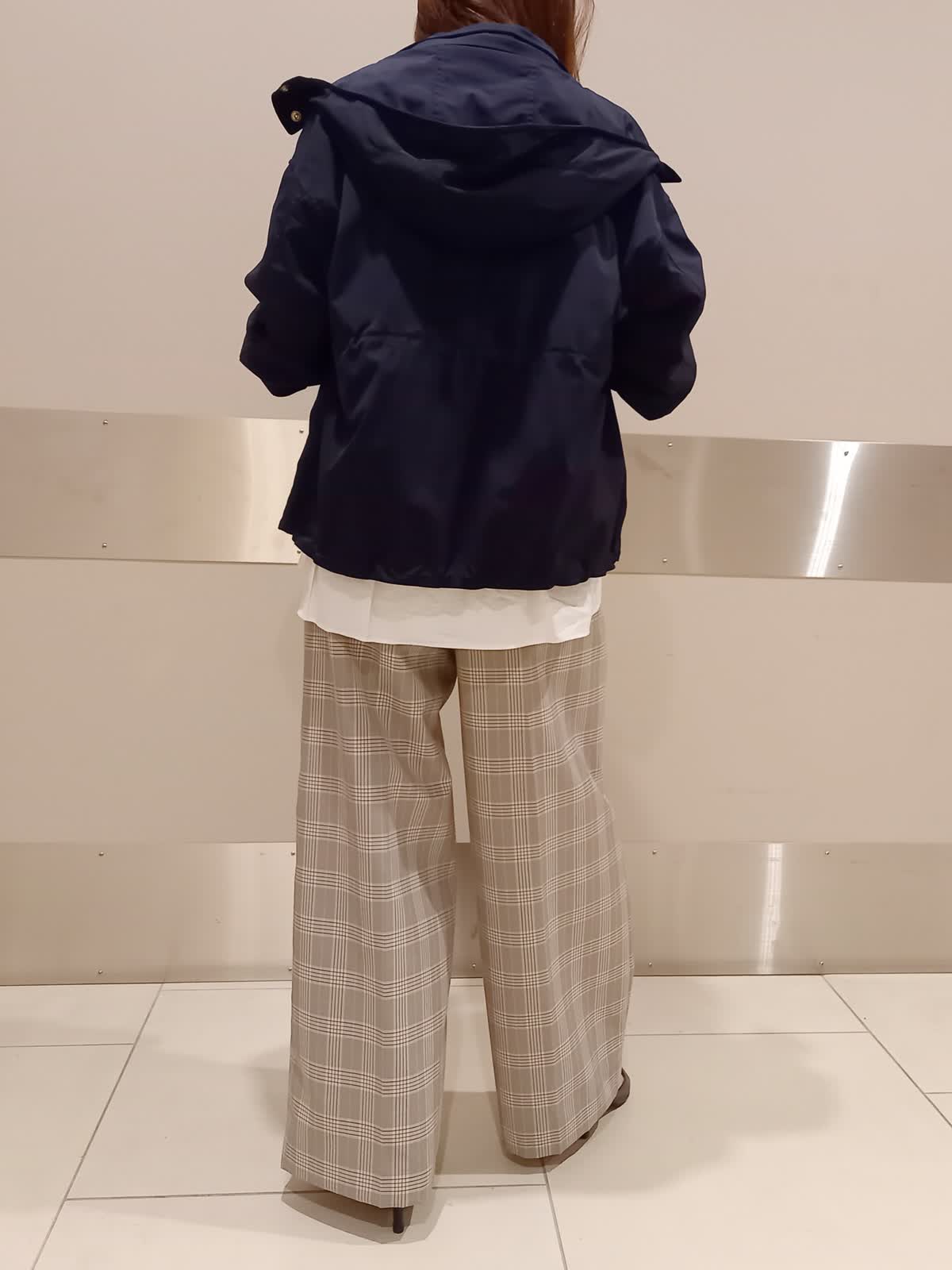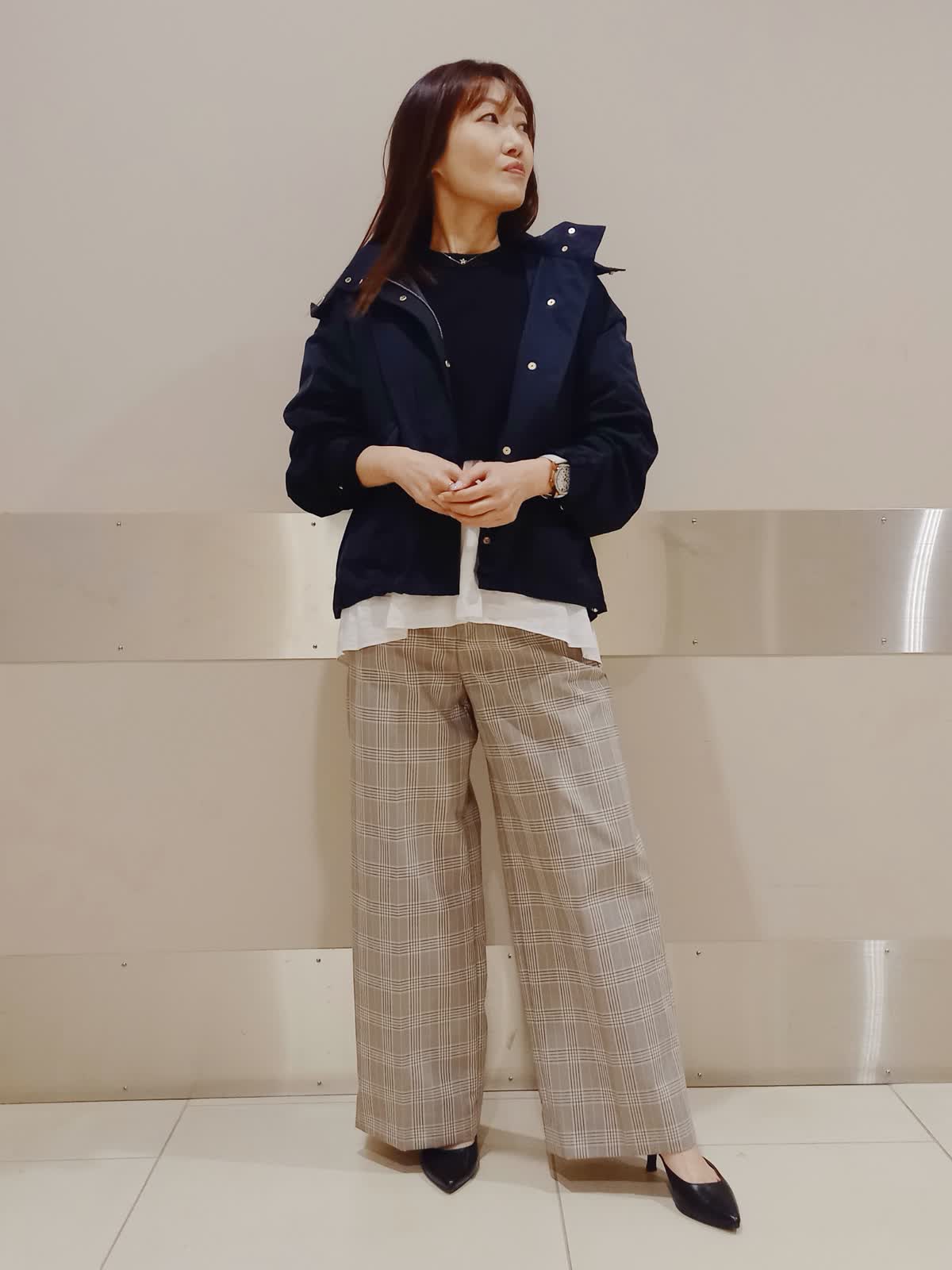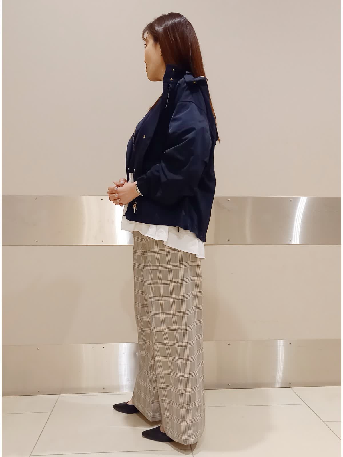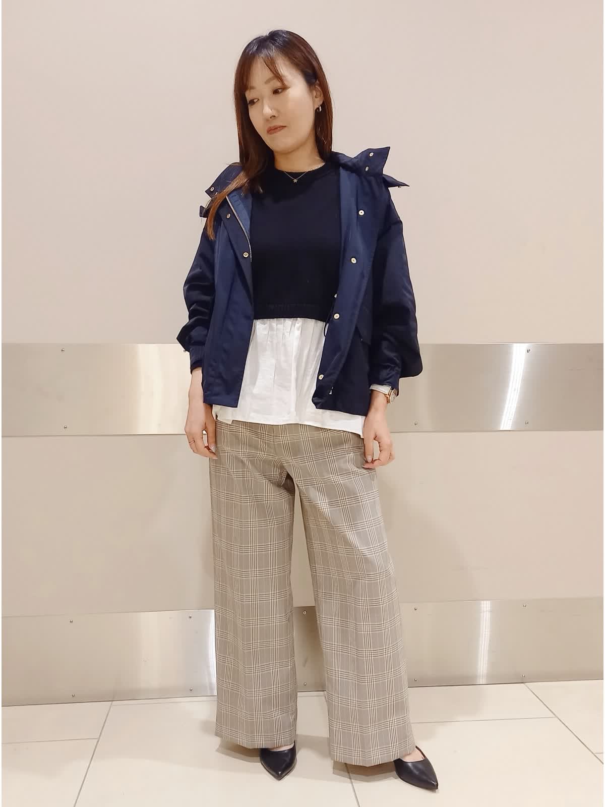 【着用サイズ】モッズコート:9号 ニット:9号 パンツ:7号【着用カラー】モッズコート:ネイビー ニット:ブラック パンツ:格子 お出掛けコーディネート。軽くてシワになりにくいモッズコートはキレイ目、カジュアルともに合わせやすくこれからの季節に大活躍です。ニットはデザインがしっかりあり1枚で着てもスタイリングが決まります。人気の美脚ワイドパンツと合わせました。
