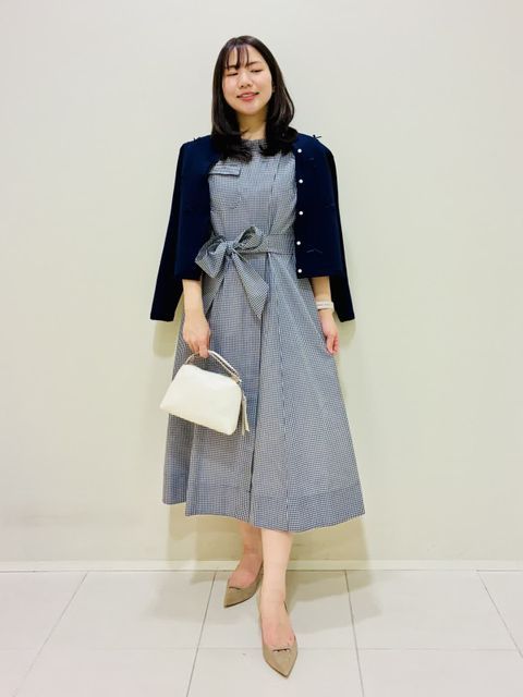 【着用アイテム】すべて9号 【着用カラー】ブルゾン:サックス カットソー:オフホワイト スカート:ネイビー 春のお出かけコーディネート。オリジナルのフラワージャガードのスカート。花柄は可愛すぎて避けていたけど、デニムライクな生地のジャガードスカートなら取り入れやすいです。桜のようなピンクのバッグをポイントに。お花見やテラスランチなど、暖かい日差しに映えるコーディネートです。