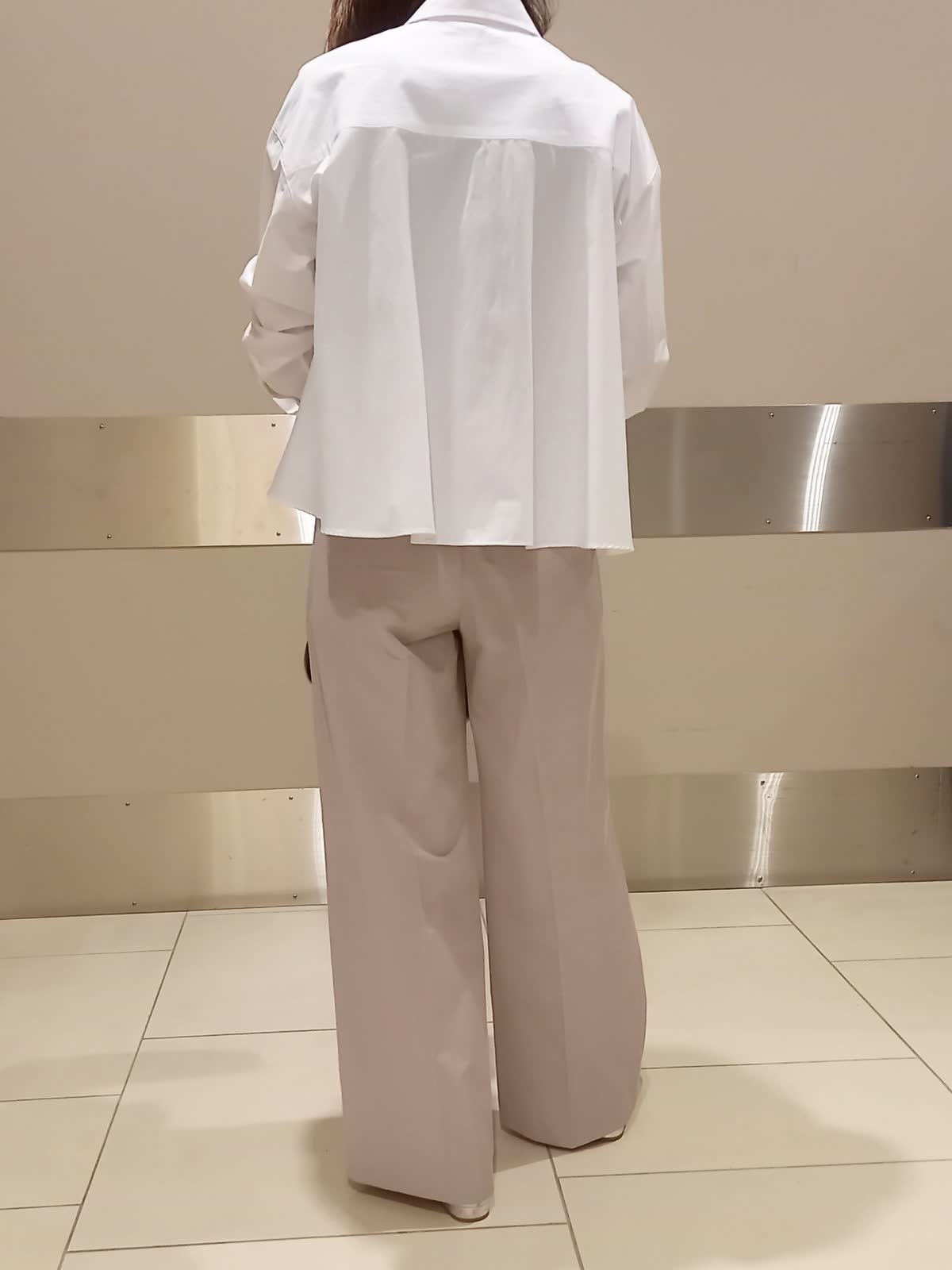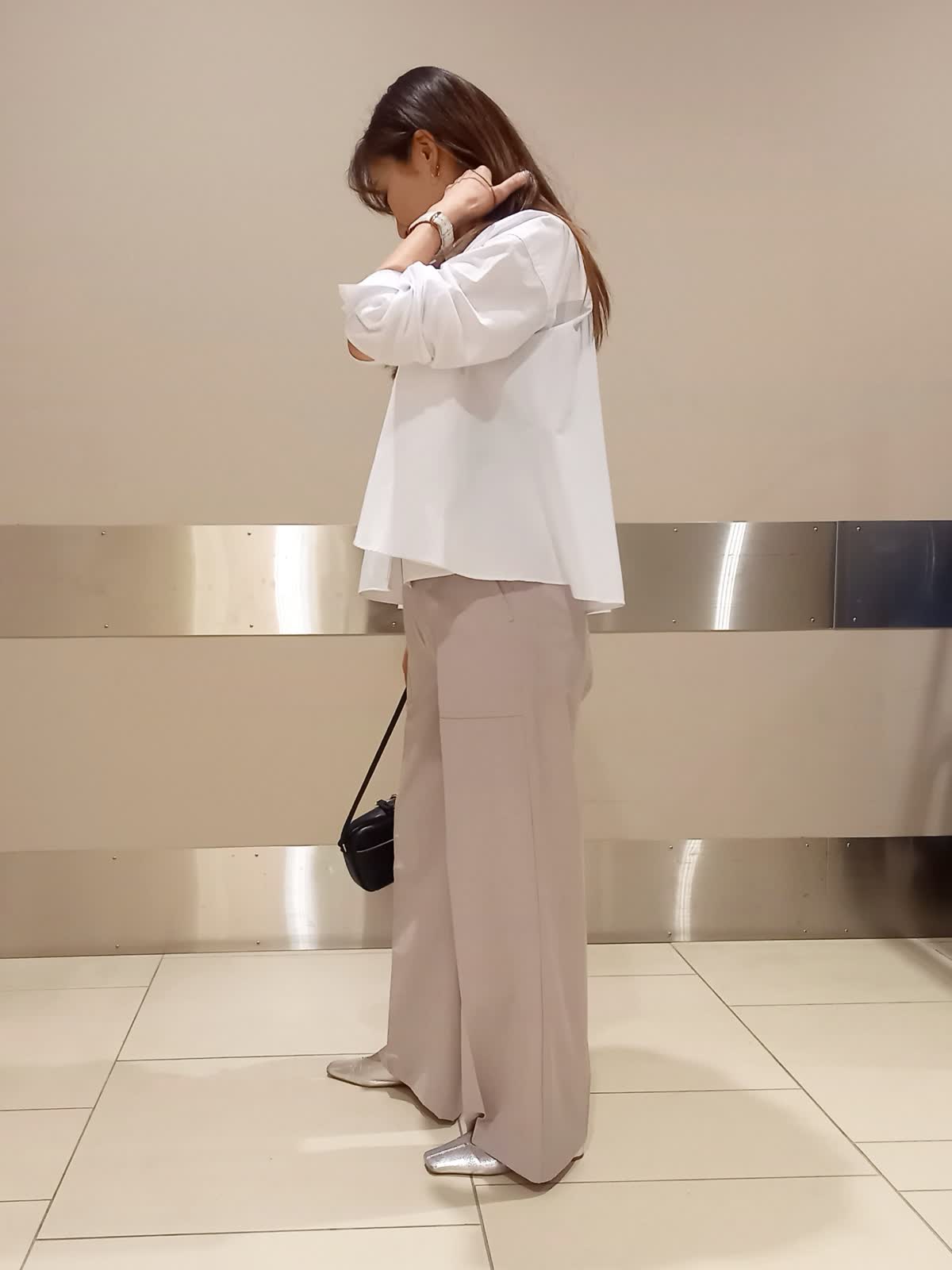 【着用サイズ】シャツ:9号 パンツ:9号【着用カラー】シャツ:オフホワイト パンツ:ピンク お出掛けコーディネート。キレイなデザインが目をひくシャツ。バックスタイルのフレアー感や全体的なシルエットが可愛いです。デザインパンツはサテン地で程よく光沢感がありカジュアル過ぎないスタイリングが決まります。春と夏のコーディネートにマストな1本です。