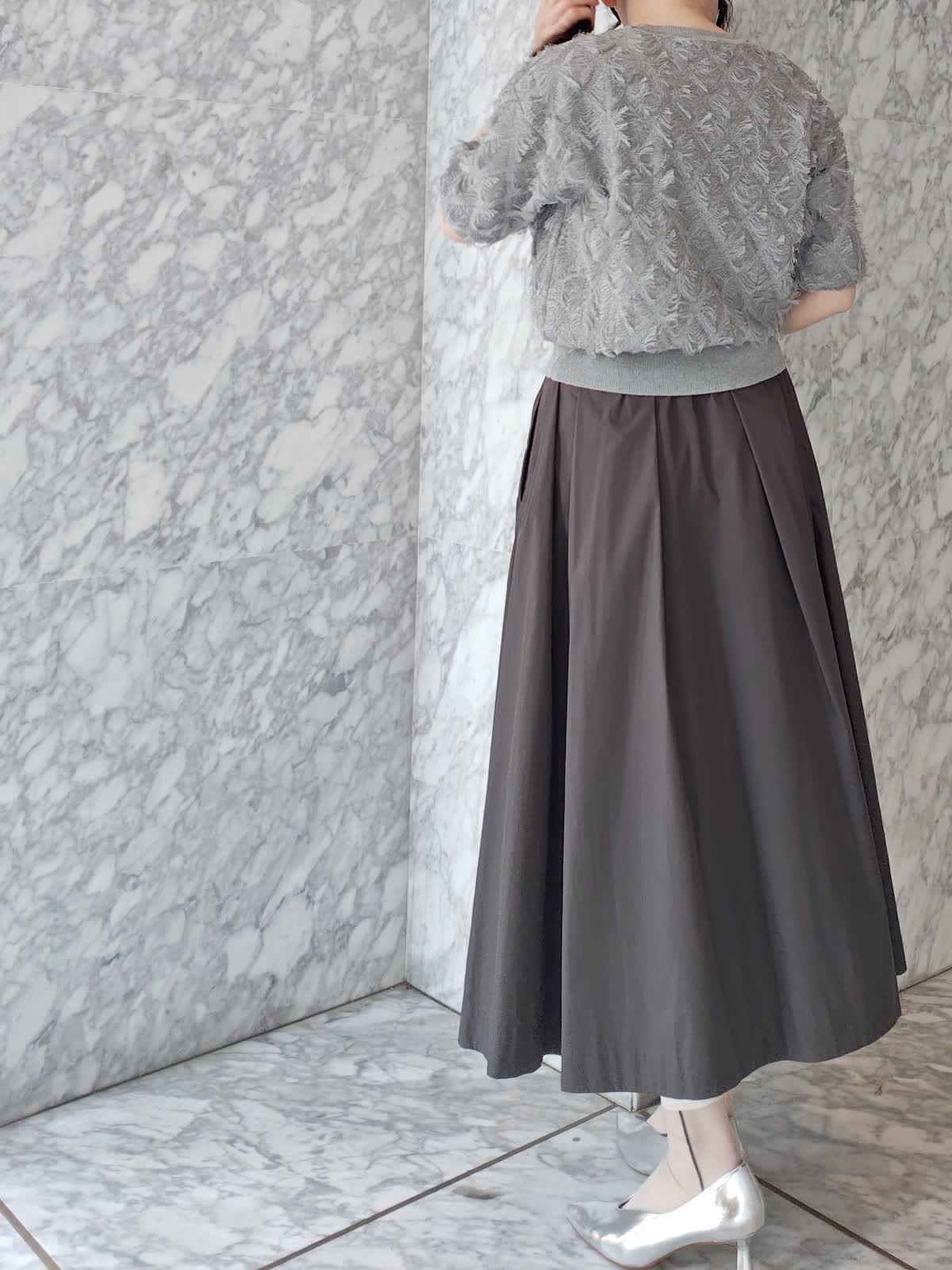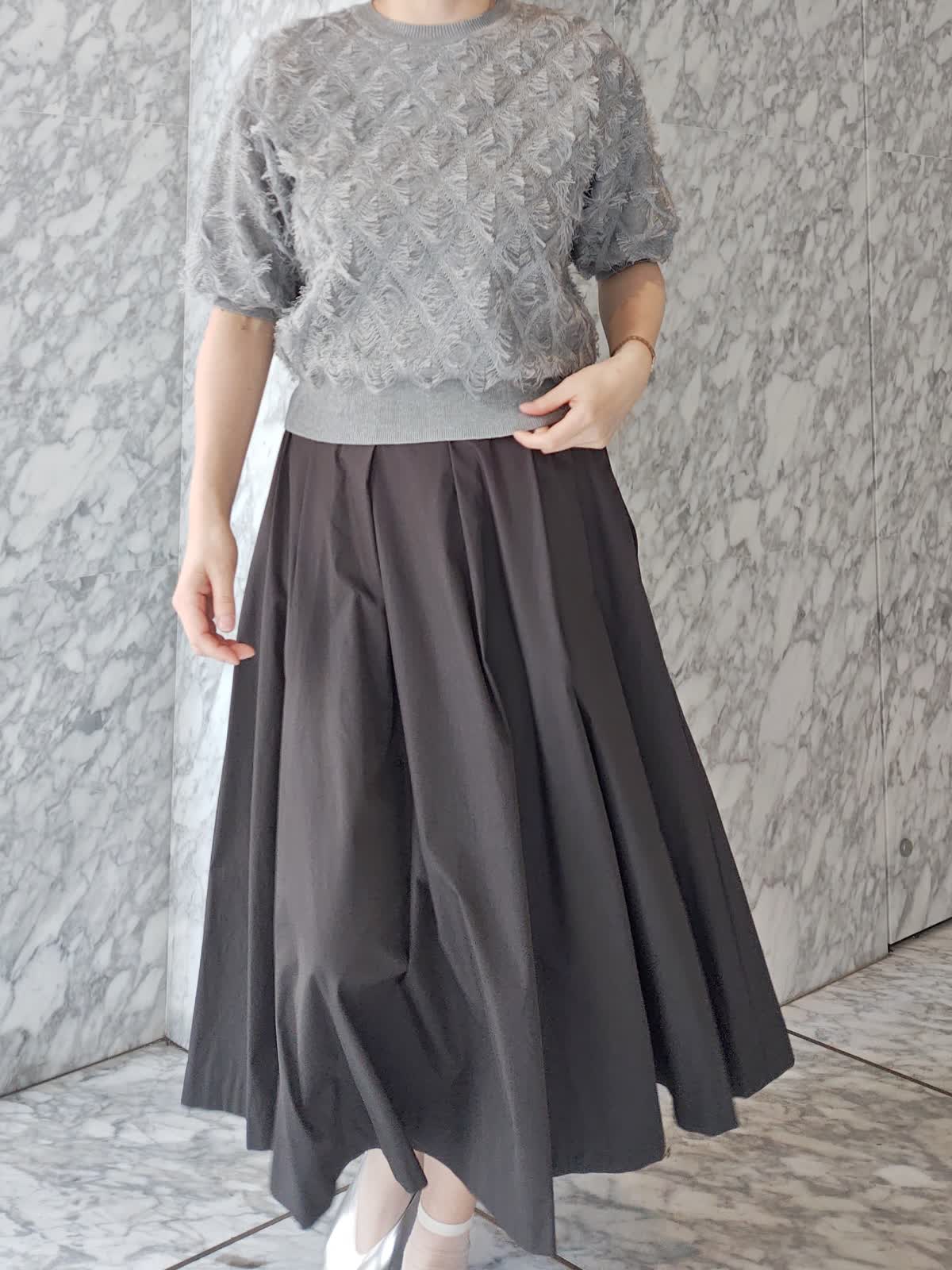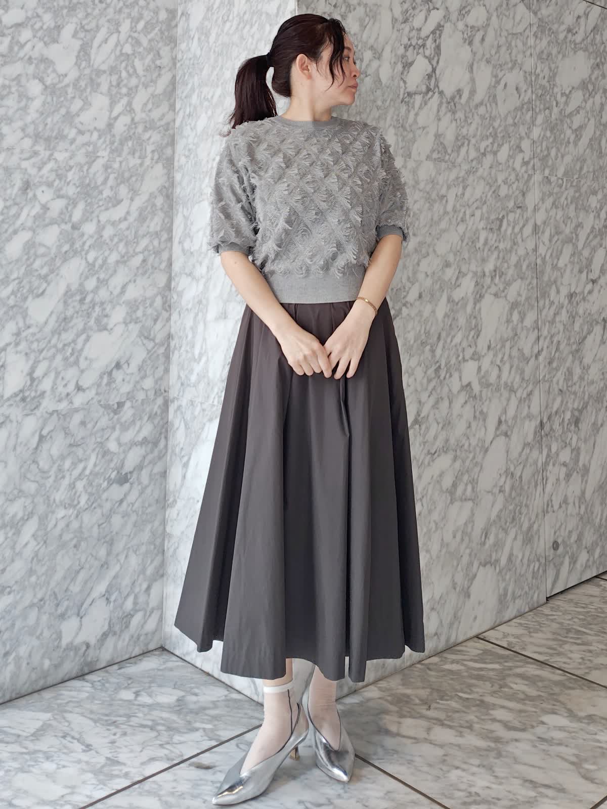 【着用サイズ】ニット : 9 ・スカート: 11 【着用カラー】ニット : グレー スカート : チャコールグレー グレーのグラデーションでコーディネートしたシックなキレイ目カジュアル 人気のフリンジニットは、5分袖で二の腕カバーもできるゆったり目シルエット。大人も使いやすいアイテム。タックプリーツスカートを合わせてオフィスでも着られるコーディネートに。