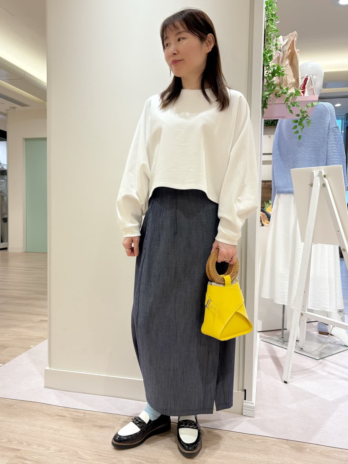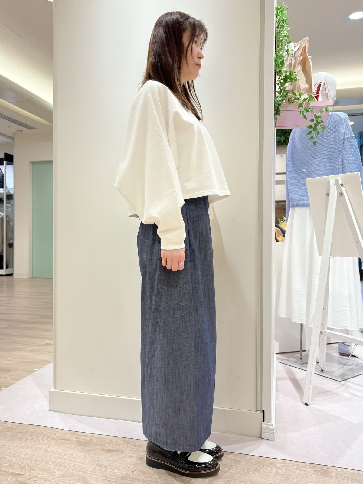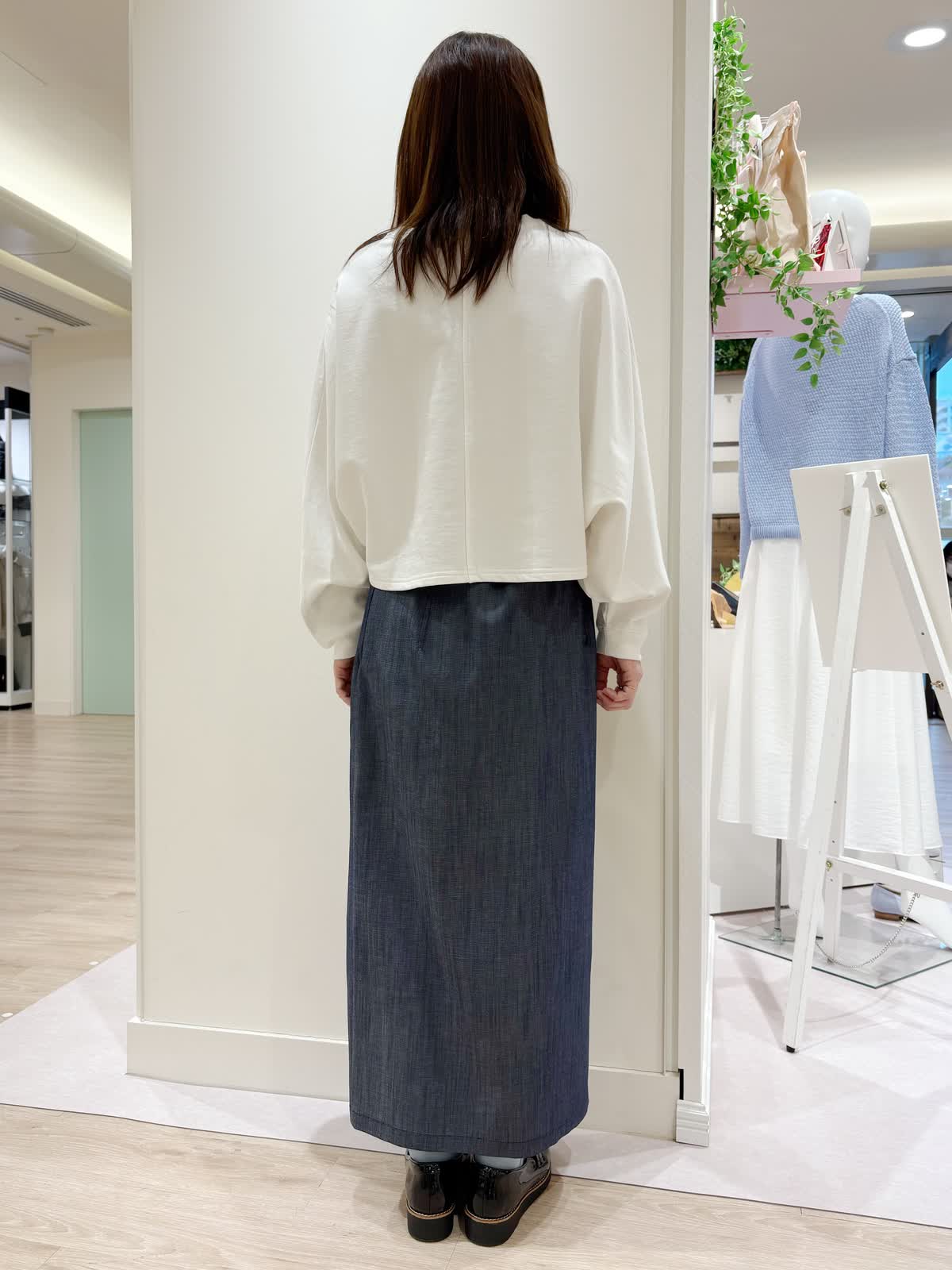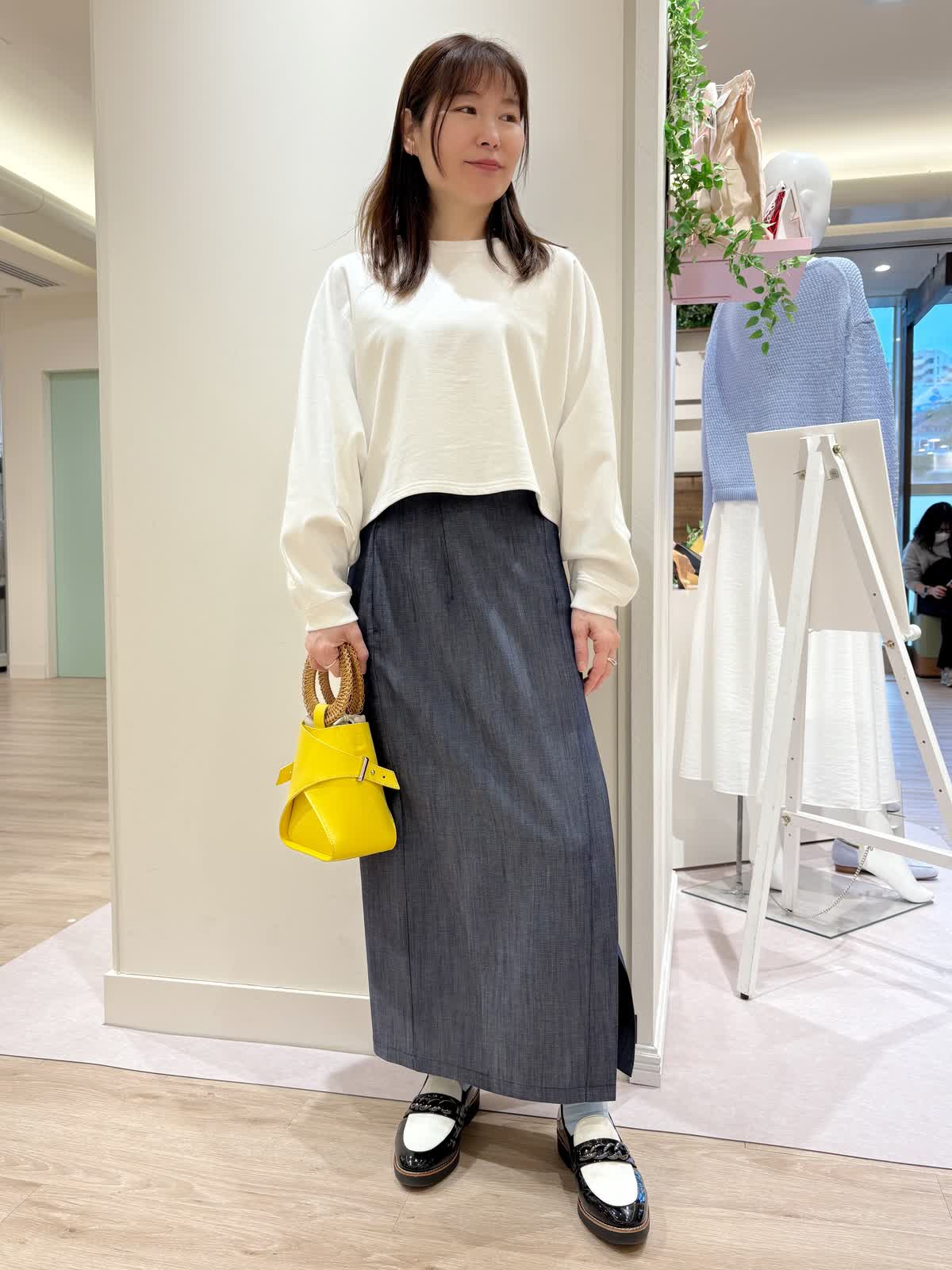 【着用サイズ】カットソー:9号スカート:9号【着用カラー】カットソー:ホワイト スカート:インディゴ 春の散策スタイリング。ドルマンスリーブのカットソーは着丈が短めなのでブラウスを重ね着して頂くのもオススメです。デニム風スカートは生地が柔らかく前にスリットも入っているのでタイトな形ですが動きやすいです。