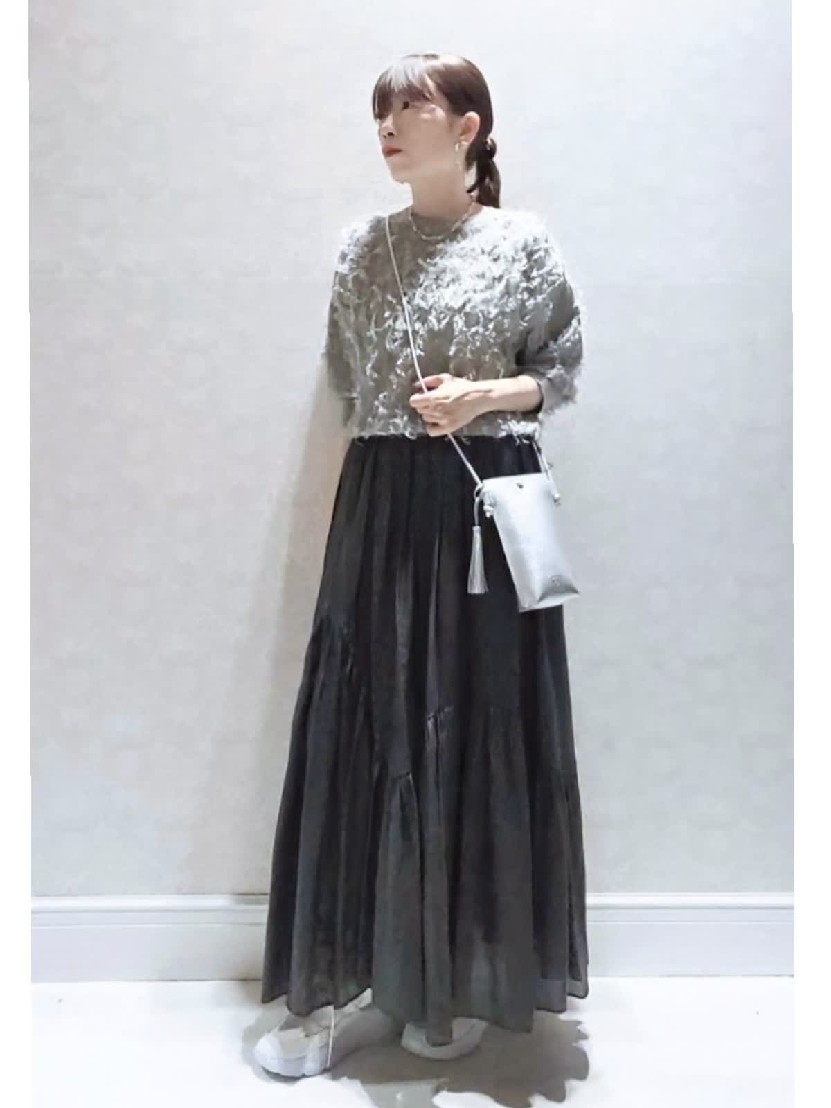 【着用サイズ】 ニット:9号 スカート:7号 バック:フリー 【着用カラー】 ニット:グレー スカート:チャコールグレー バック:シルバー ラメが入っているフリンジニットは1枚で華やかな印象に。 スカートはウエストゴムでストレスフリー。 とても軽い履き心地でお勧めです。