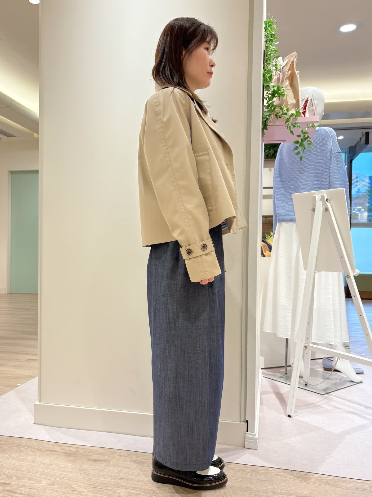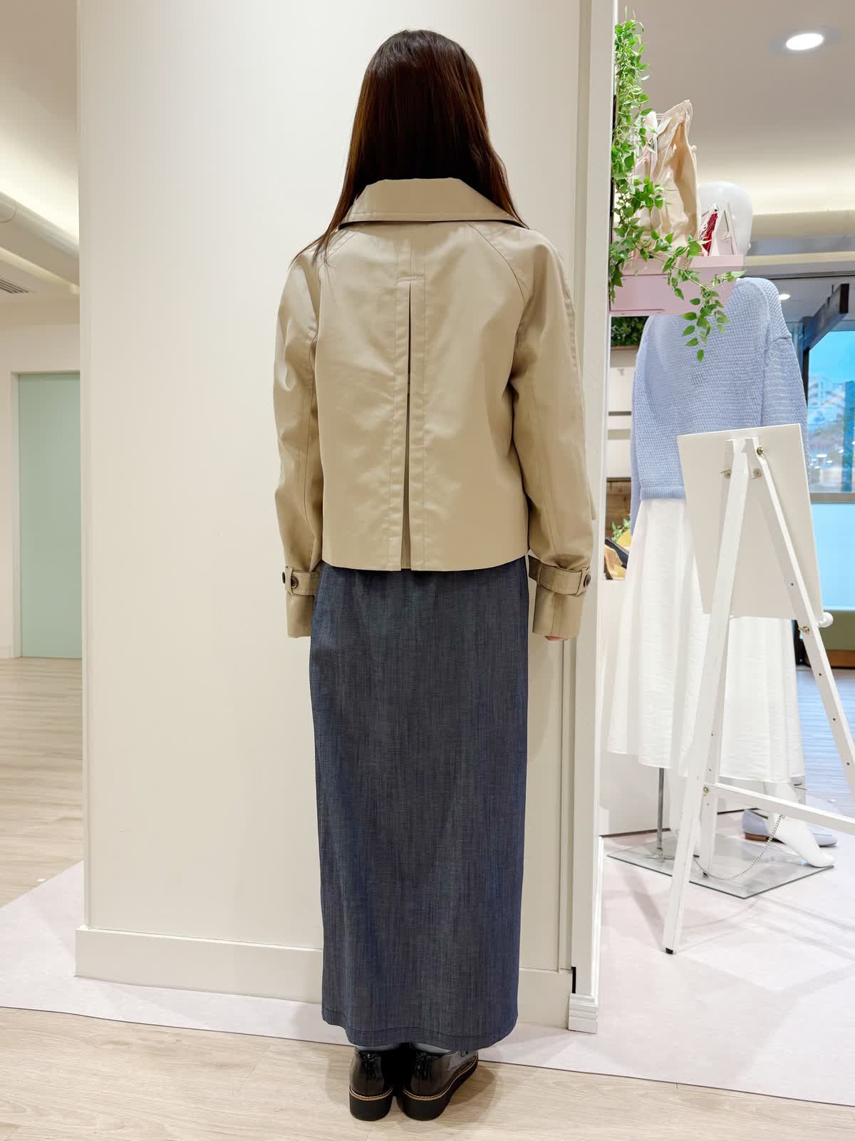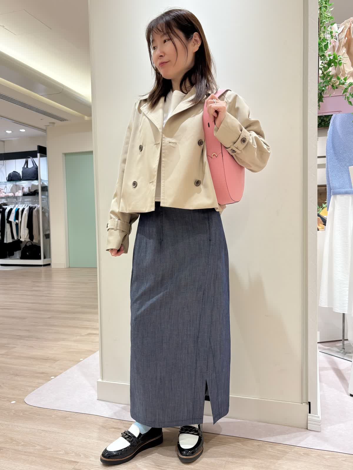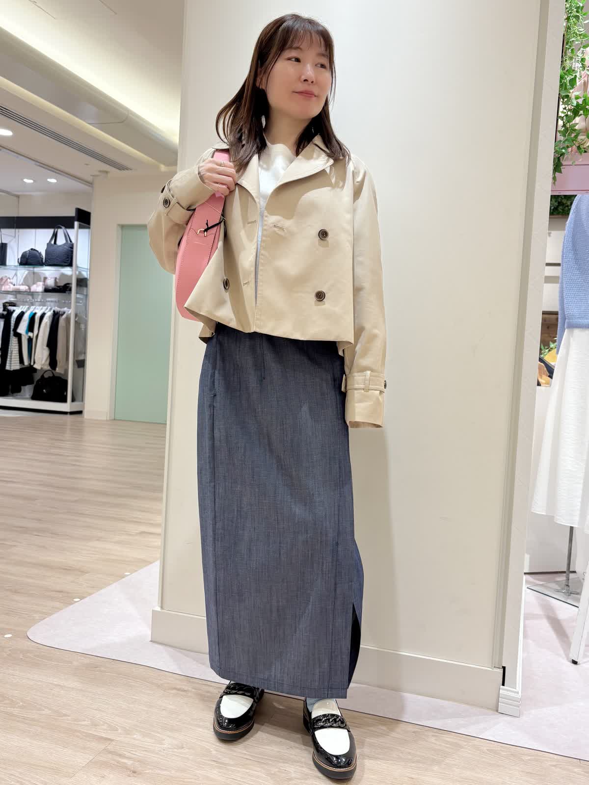 【着用サイズ】コート:9号スカート:9号 【着用カラー】コート:ベージュ スカート:インディゴ 春の休日お出かけコーディネート。ショートトレンチコートはスカートとの相性抜群です。袖はボタンで絞って頂けるので袖をあげて中のインナーを見せて着てもオシャレです。デニム風スカートは柔らかく前にスリットも入っているので歩きやすくなっております。