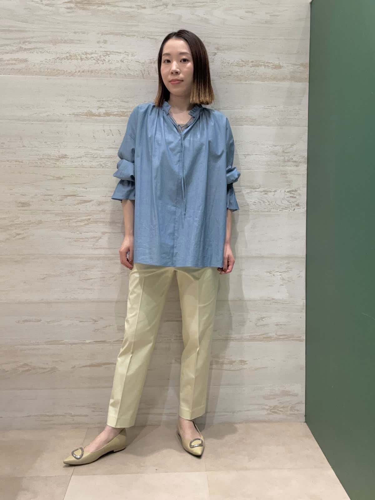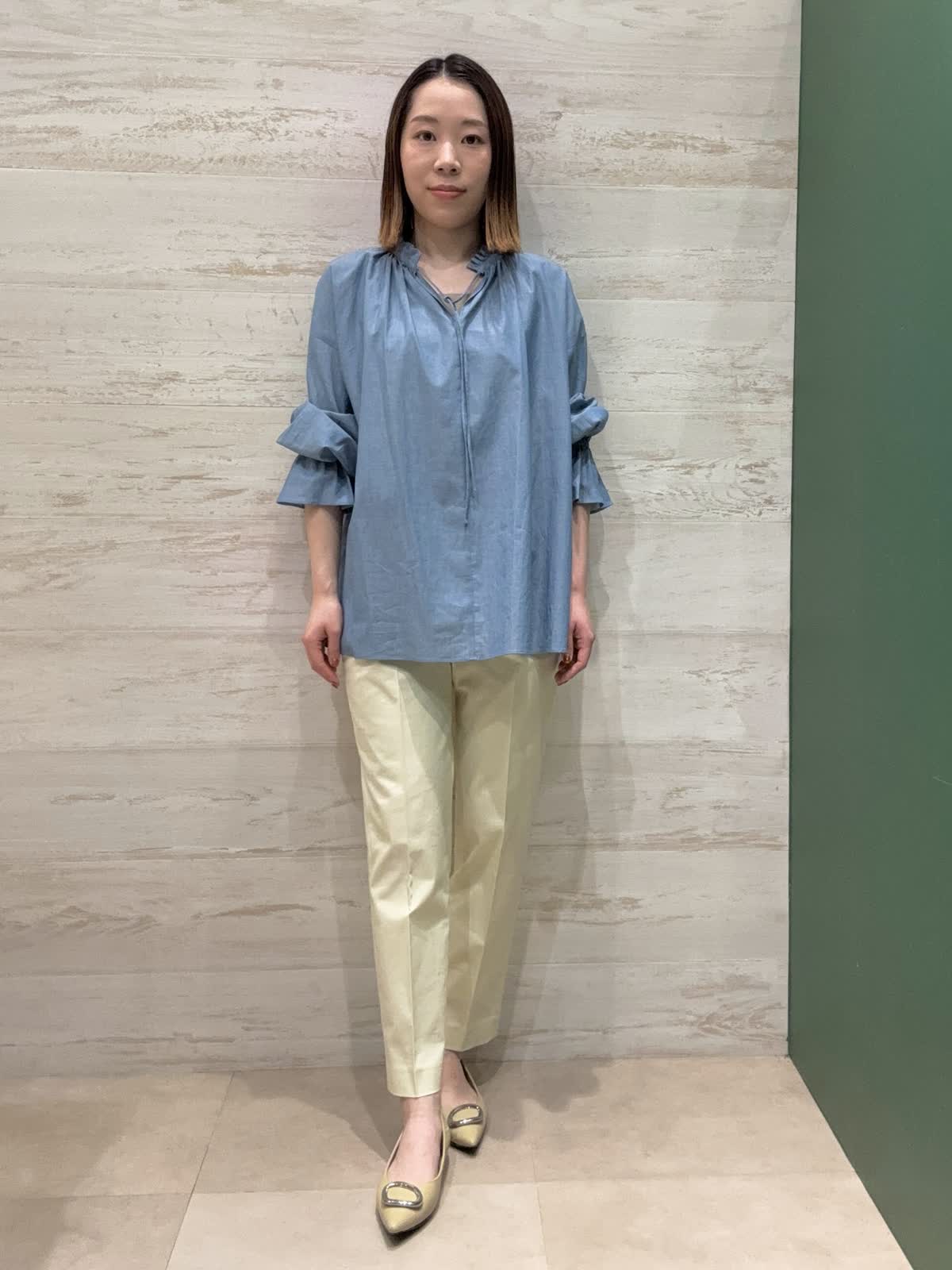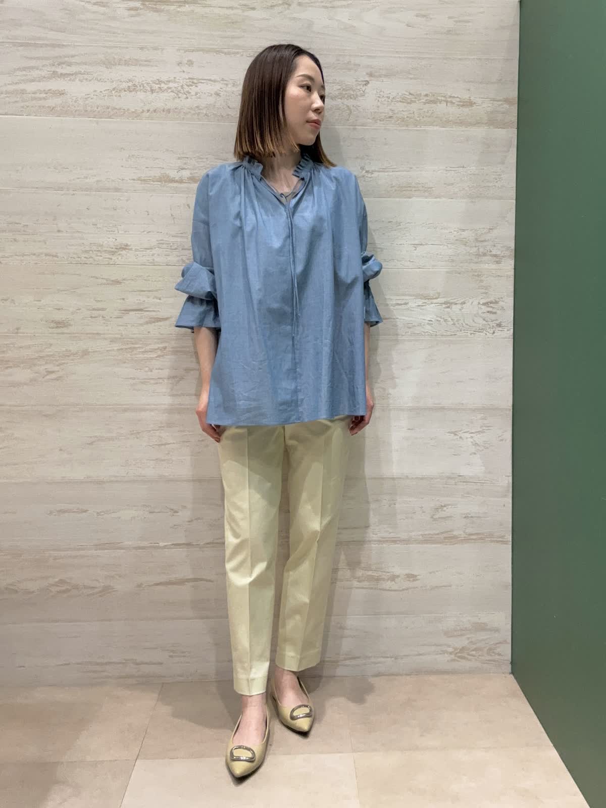 【着用カラー】ブラウス:ブルー パンツ:クリーム 【着用サイズ】ブラウス:フリー パンツ:7号 襟元と袖口のデザインがとてもオシャレなブラウスでデニム風の優しいブルーが春らしいです。 テーパードパンツですっきりとしたコーディネートにしてみました。