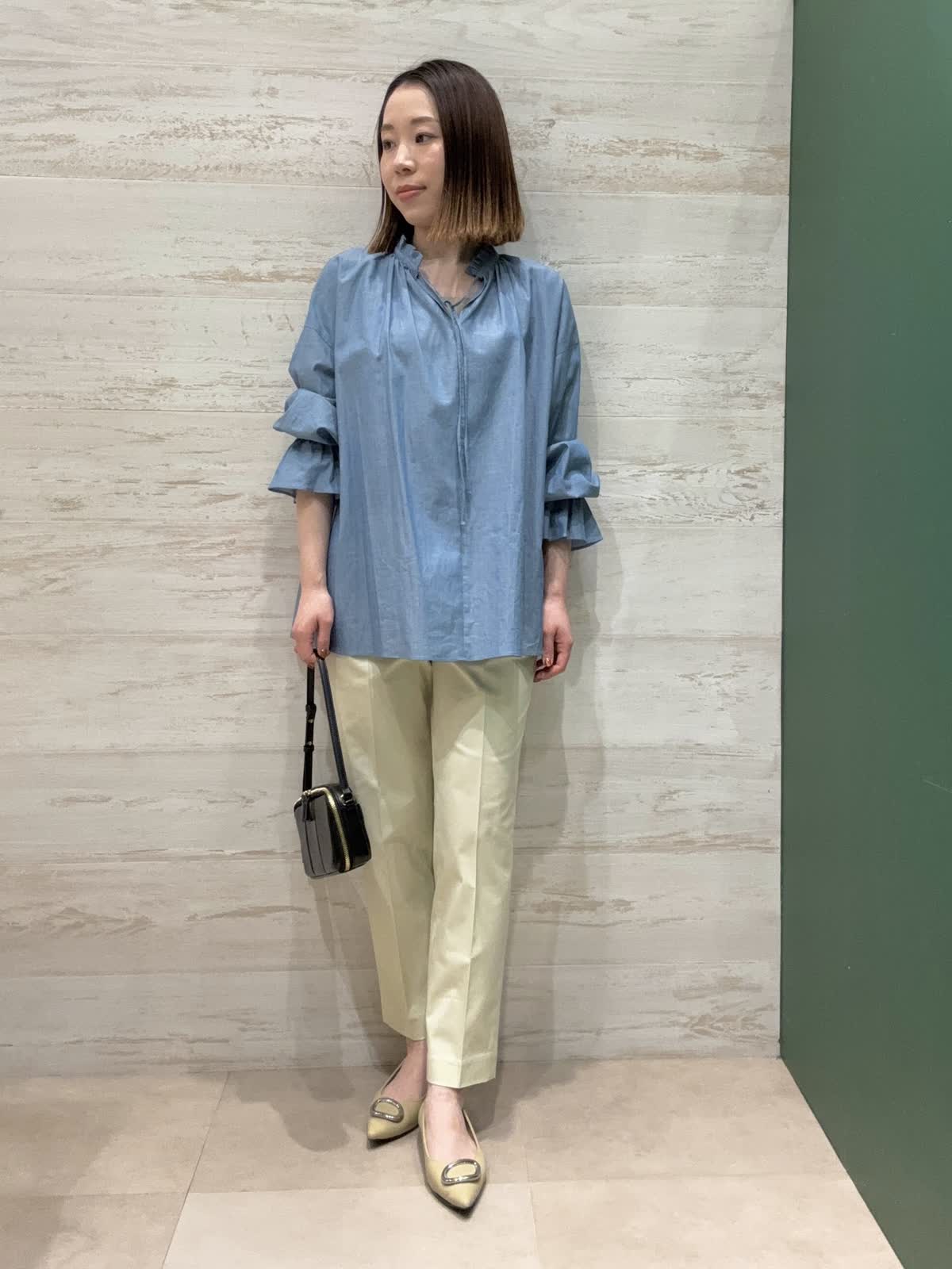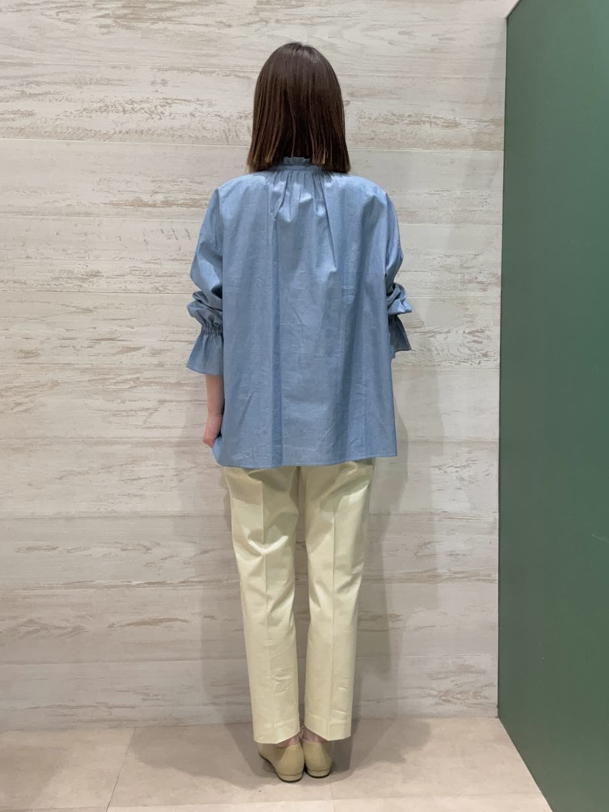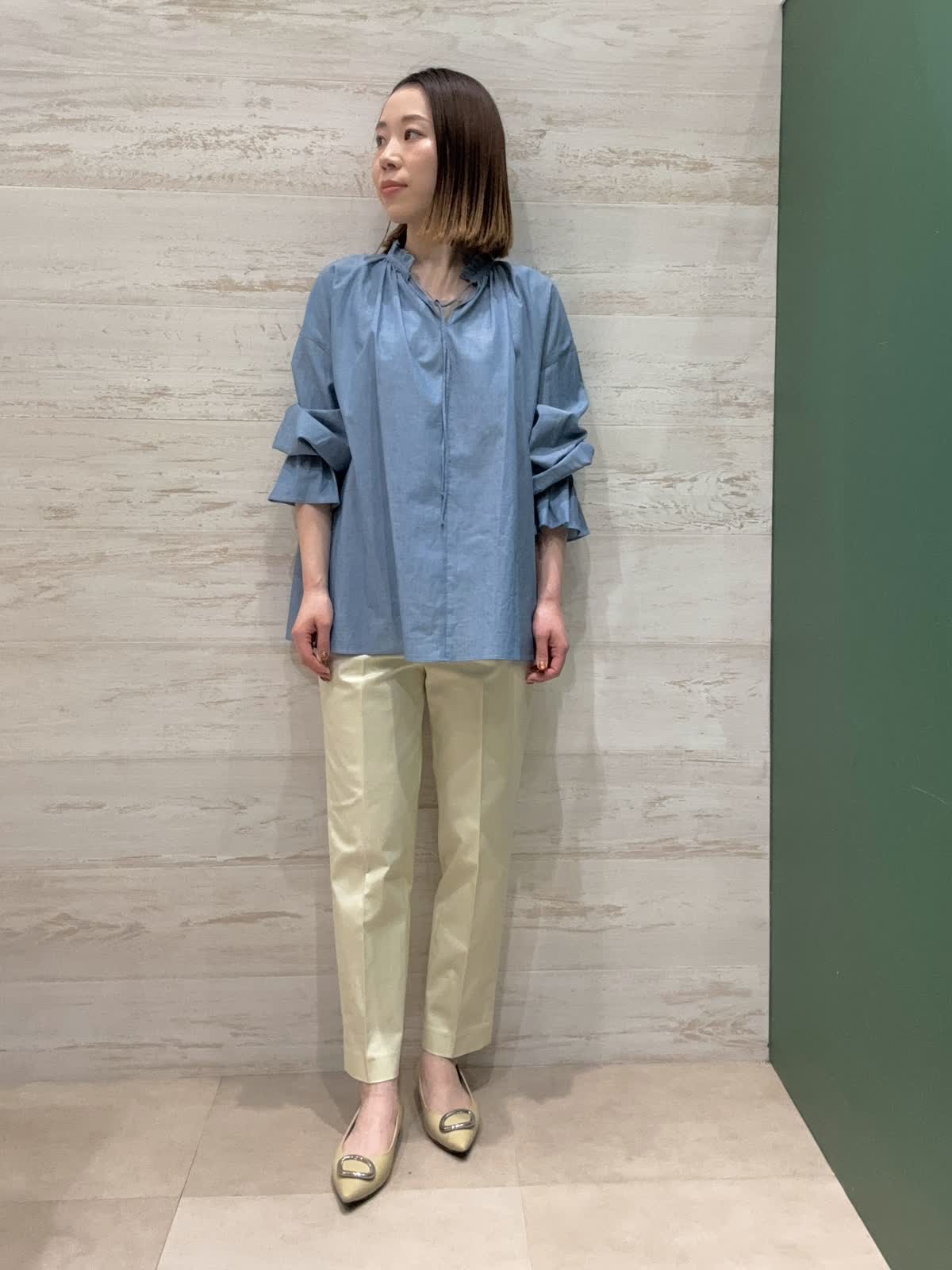 【着用カラー】ブラウス:ブルー パンツ:クリーム 【着用サイズ】ブラウス:フリー パンツ:7号 襟元と袖口のデザインがとてもオシャレなブラウスでデニム風の優しいブルーが春らしいです。 テーパードパンツですっきりとしたコーディネートにしてみました。
