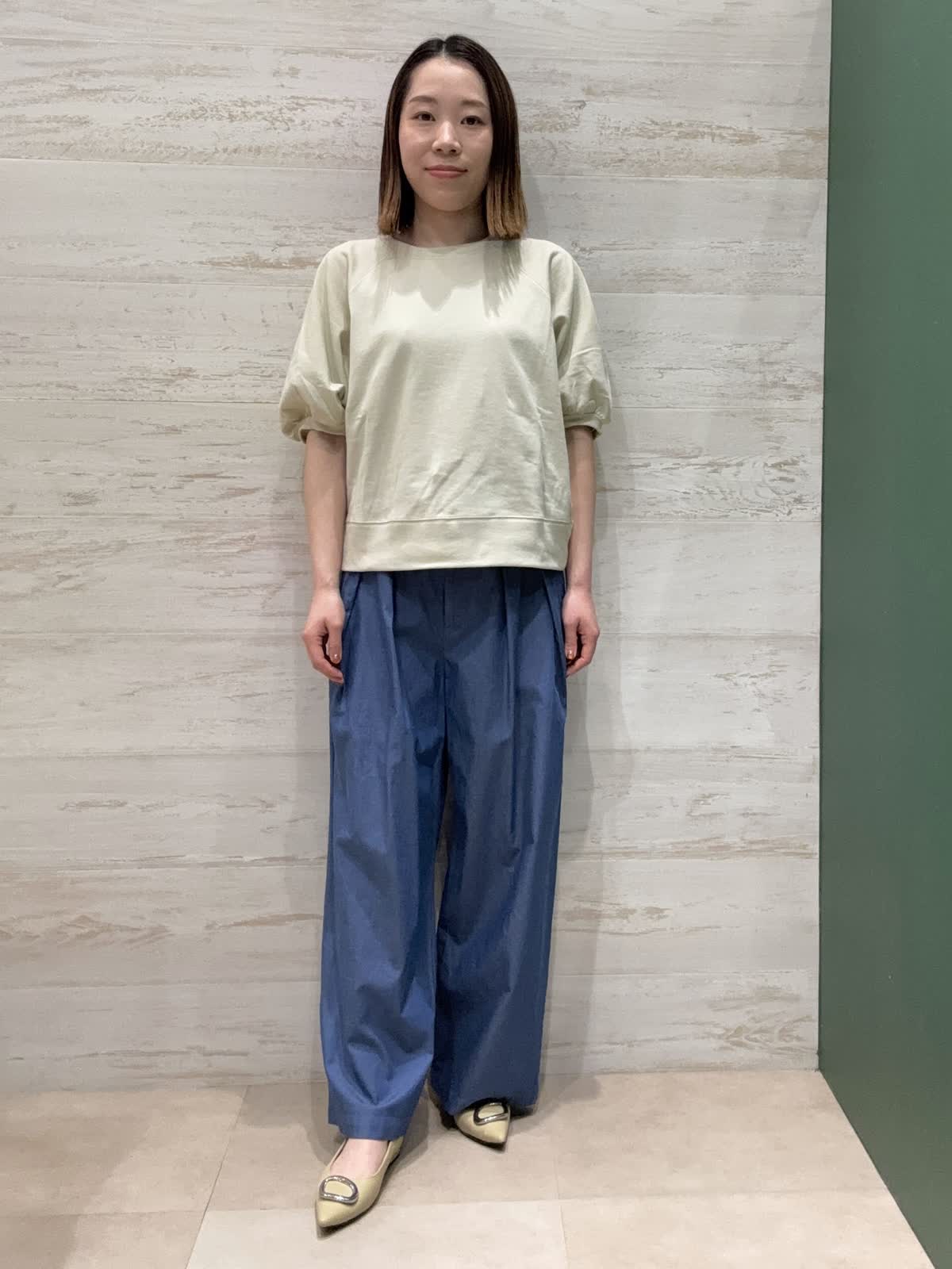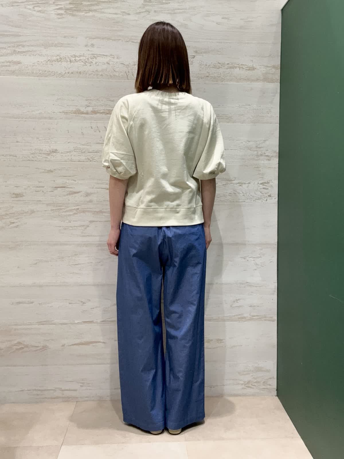【着用カラー】カットソー:クリーム パンツ:サックス 【着用サイズ】カットソー:フリー パンツ:7号 バルーン袖が女性らしくて可愛いです。二の腕がちょうど隠れる五分袖なので1枚着になる季節には嬉しい袖丈です。 バレルパンツは丈が長すぎないので小柄な方でも履きやすいです。