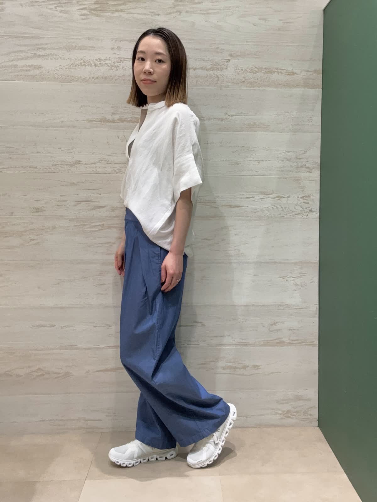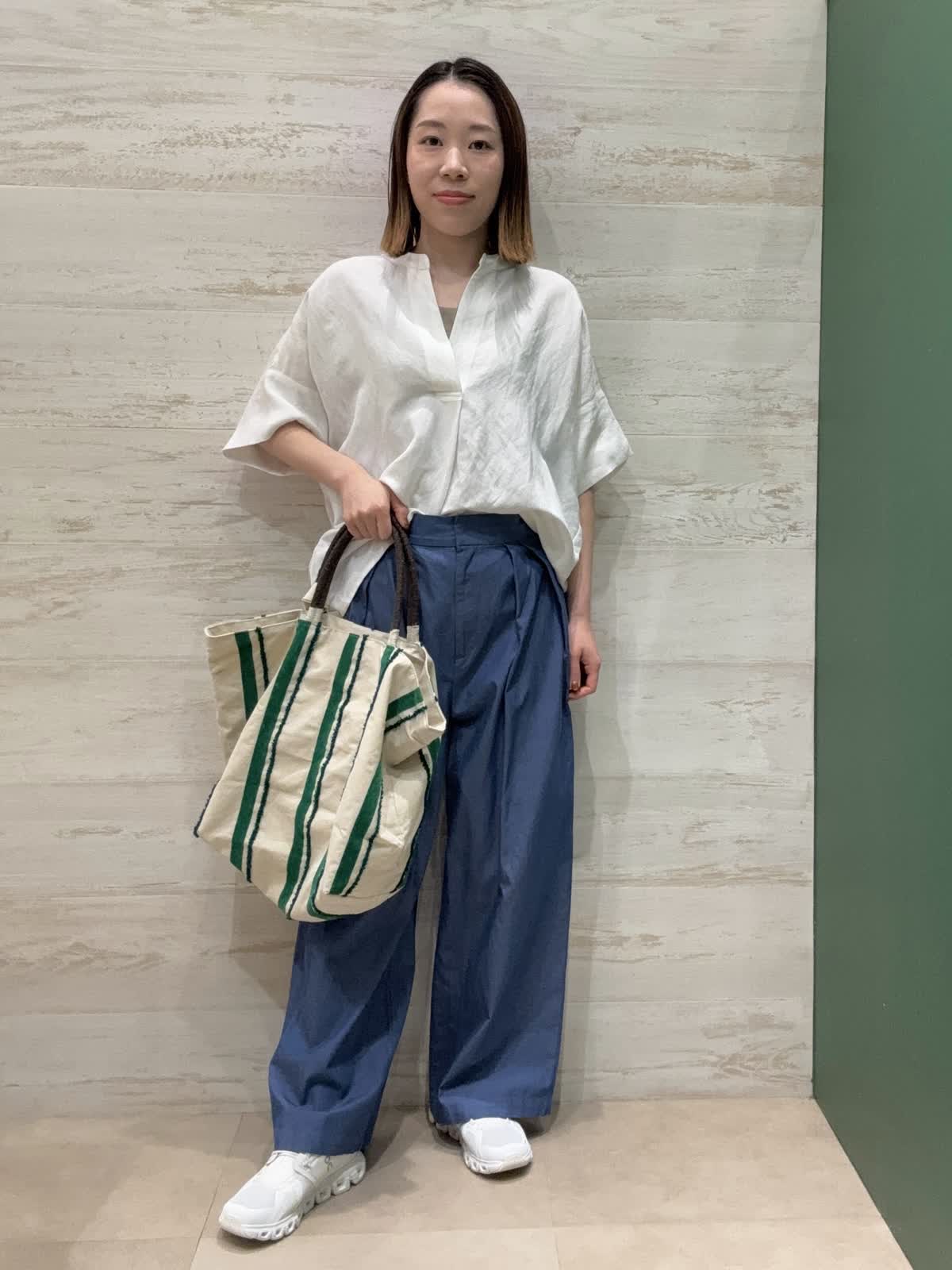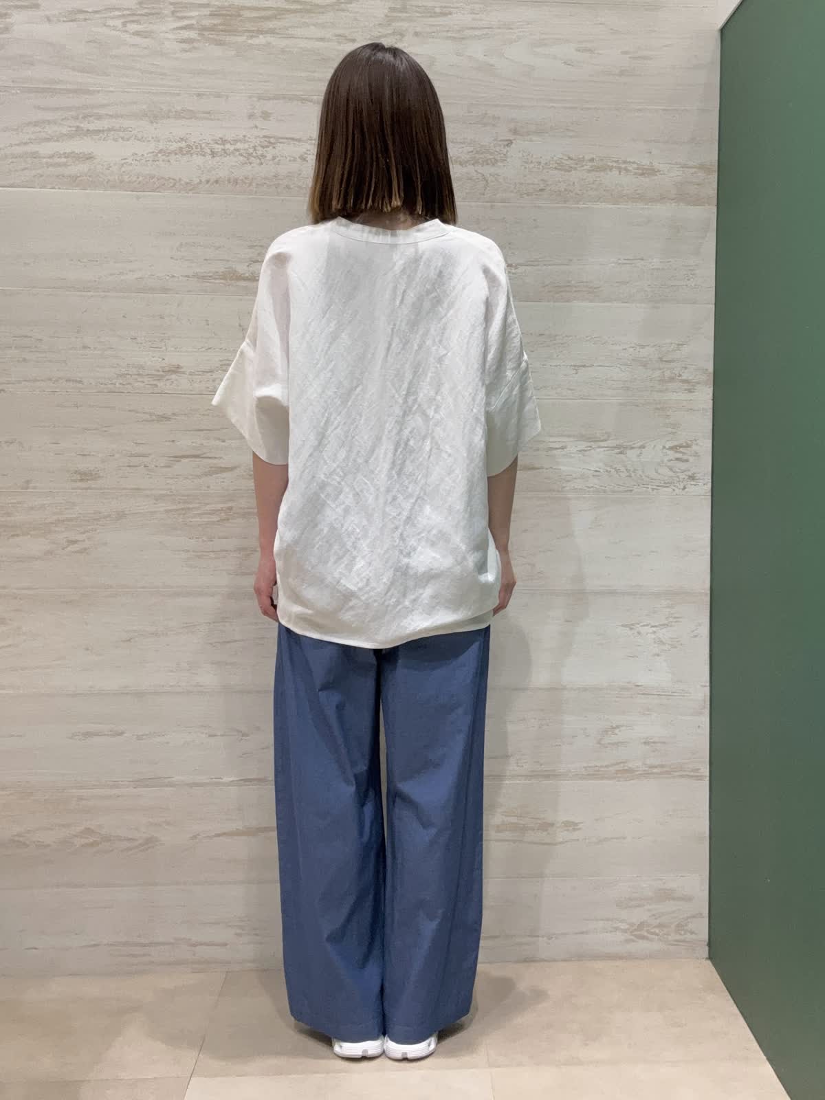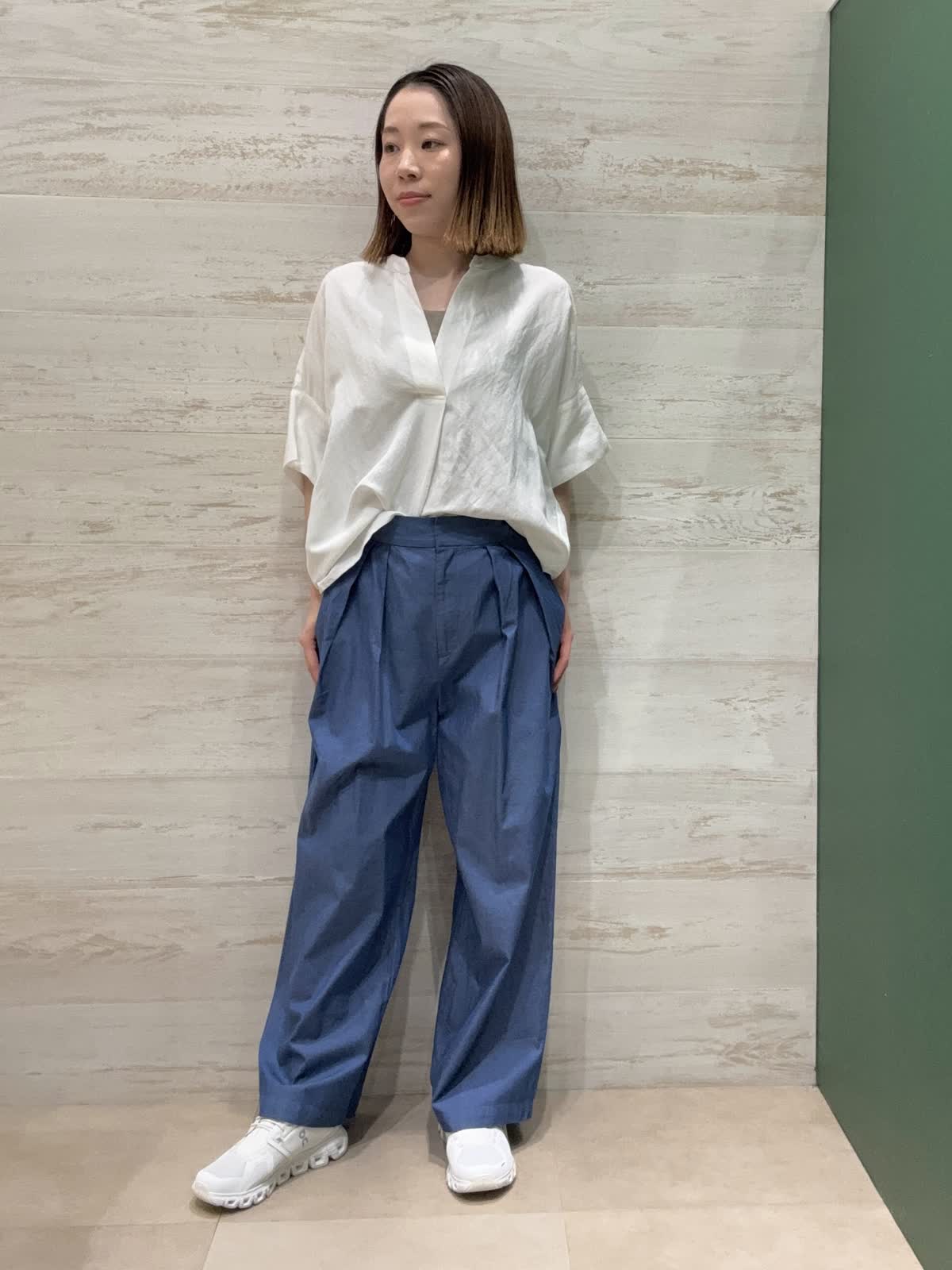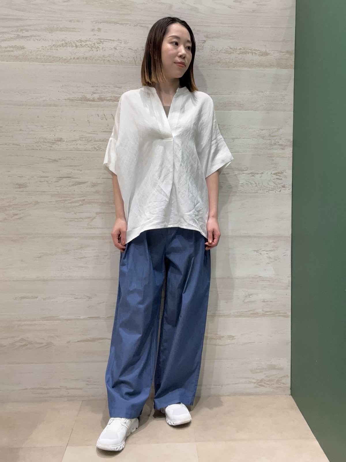【着用カラー】ブラウス:オフホワイト パンツ:サックス 【着用サイズ】ブラウス:フリー パンツ:7号 抜け襟でゆるっと着られるブラウスです。暑い夏の日でも肌に張り付かず涼しく着ることができます。 デニムライクのバレルパンツでカジュアルにコーディネートしました。