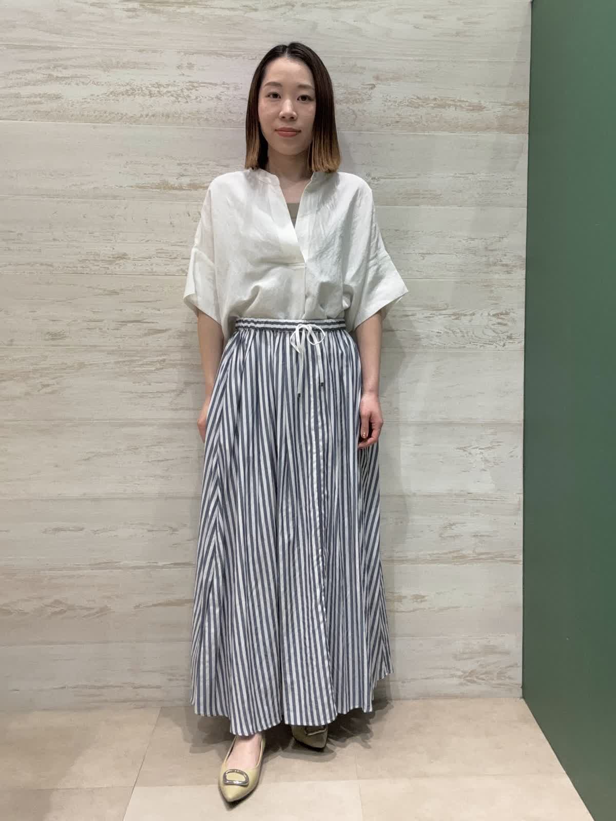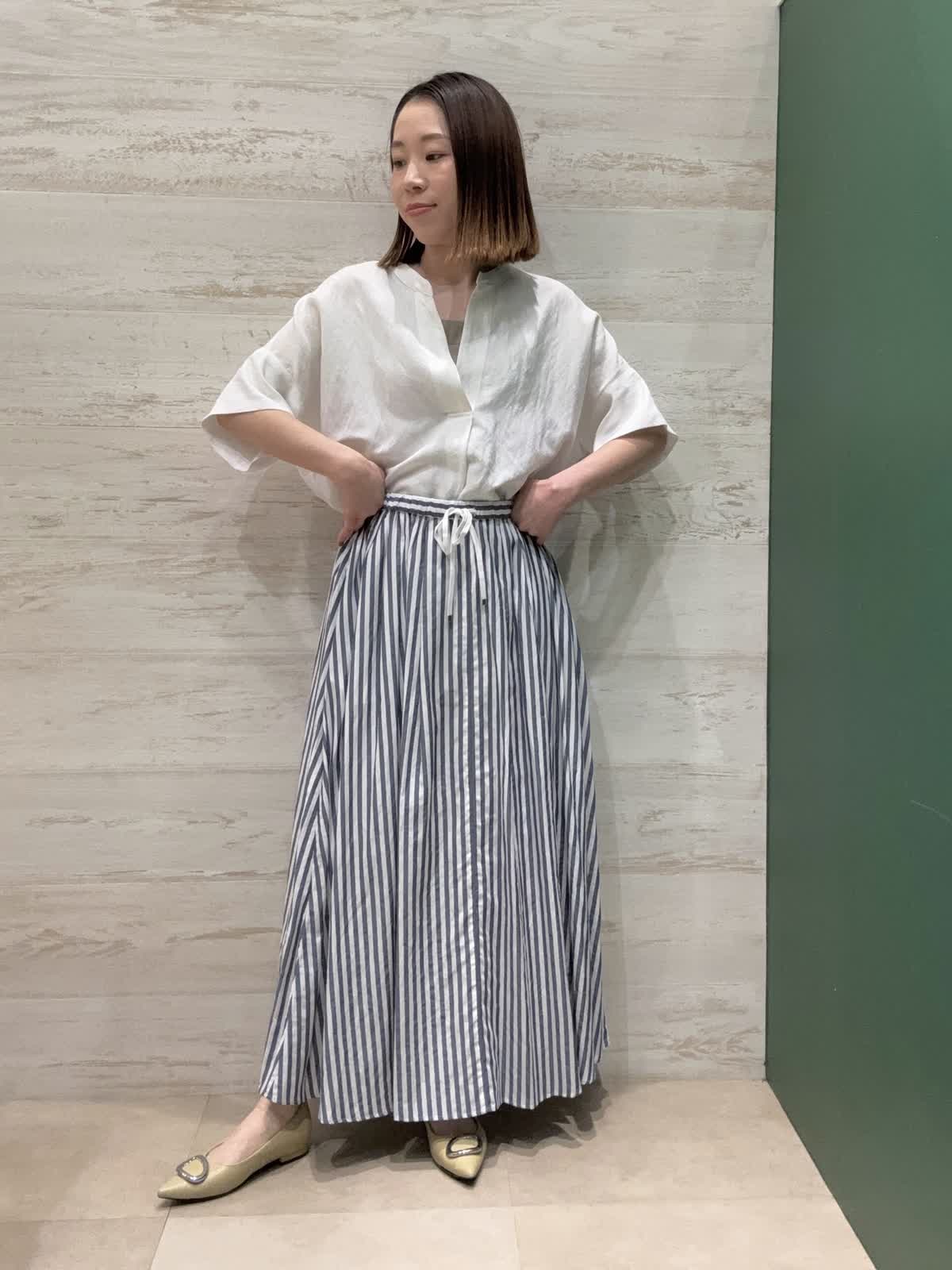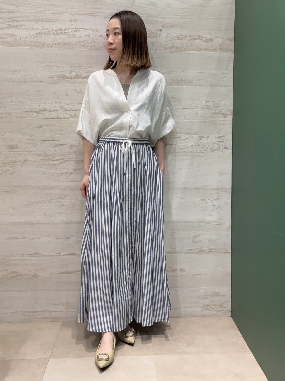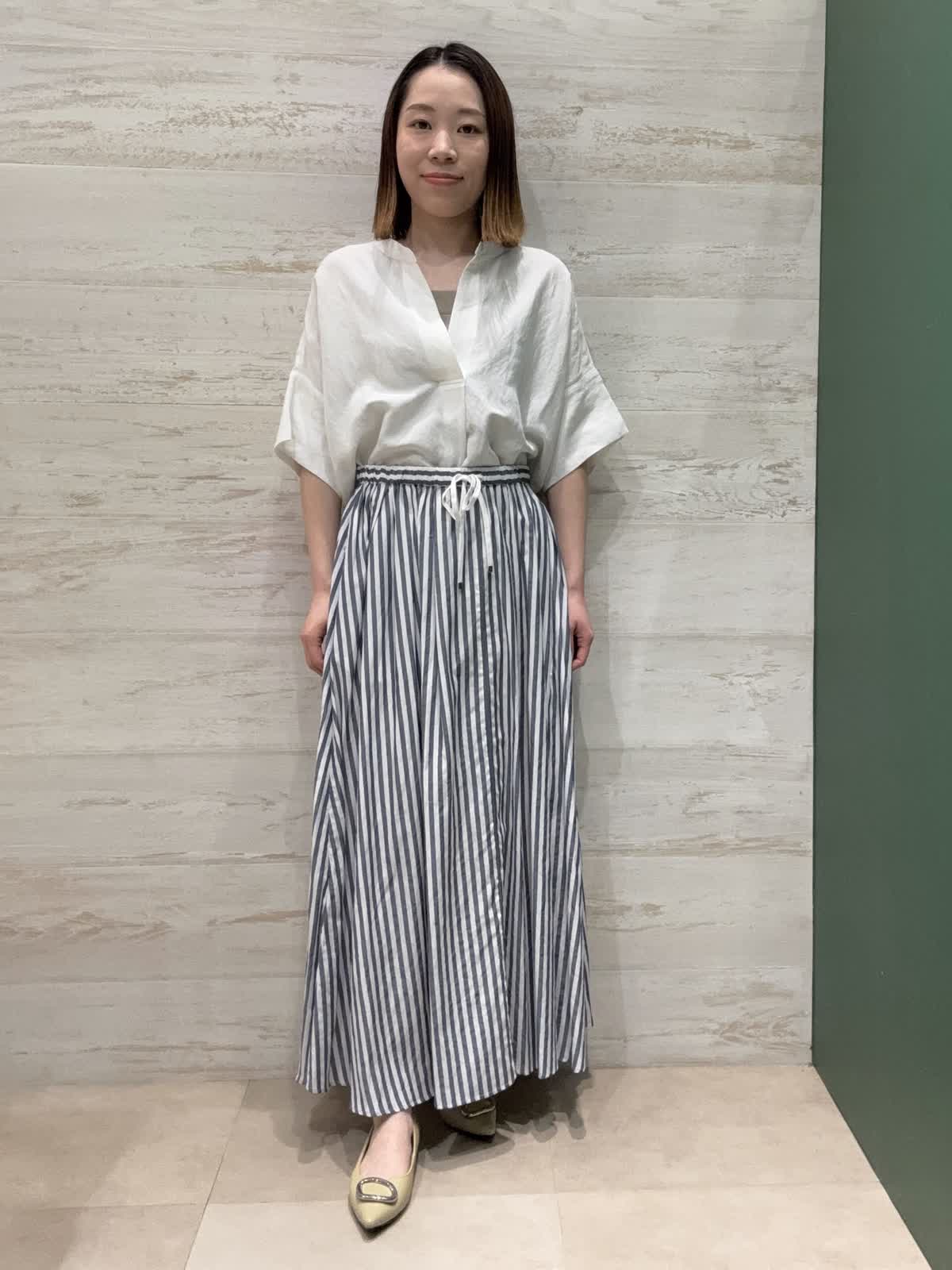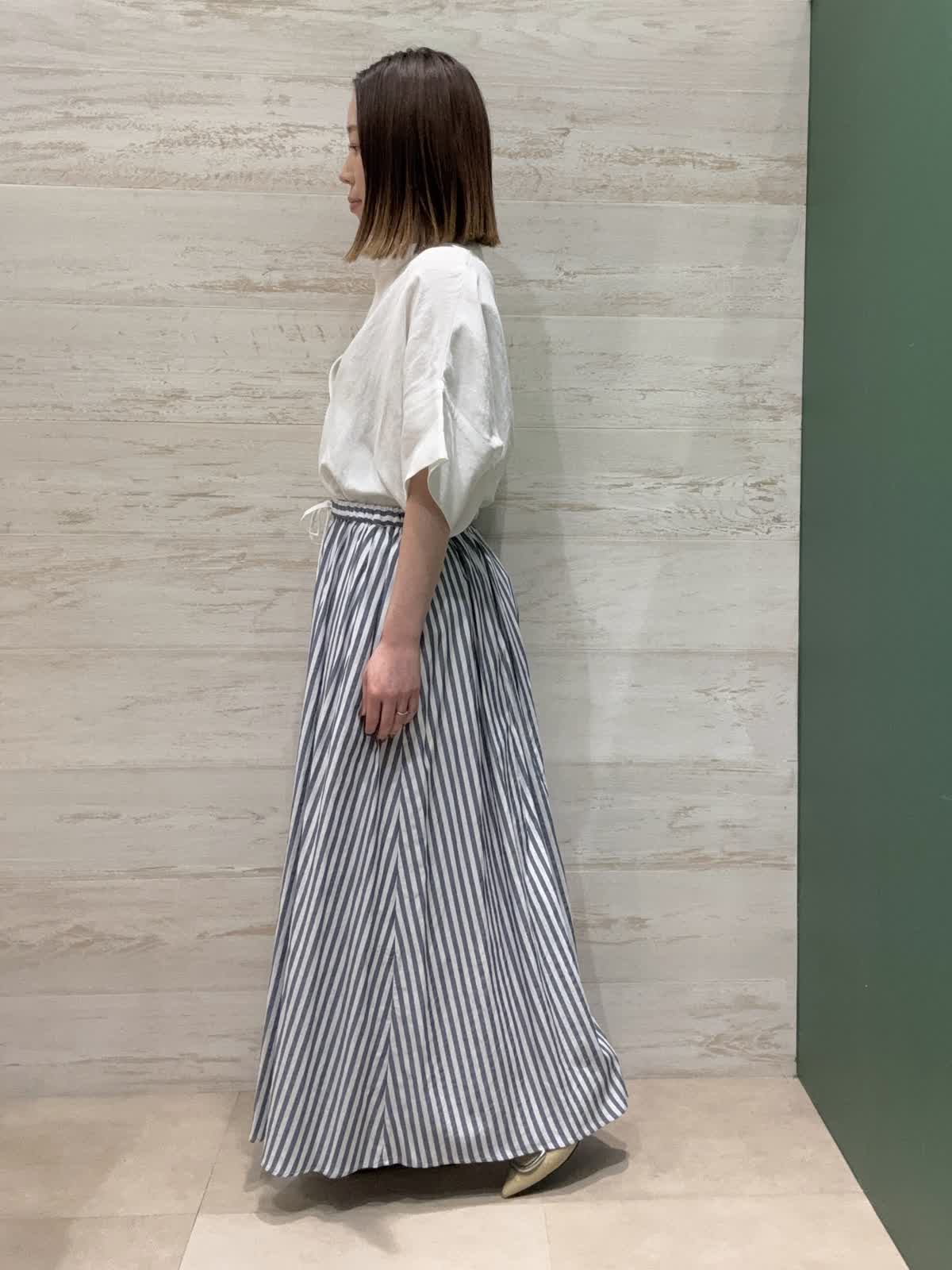 【着用カラー】ブラウス:オフホワイト スカート:ストライプ 【着用サイズ】ブラウス・スカート:フリー ブラウスはゆったりした形で長さもあり着心地が良いです。 スカートはウエストゴムで履きやすく、たっぷり入ったギャザーが女性らしくて可愛いです。