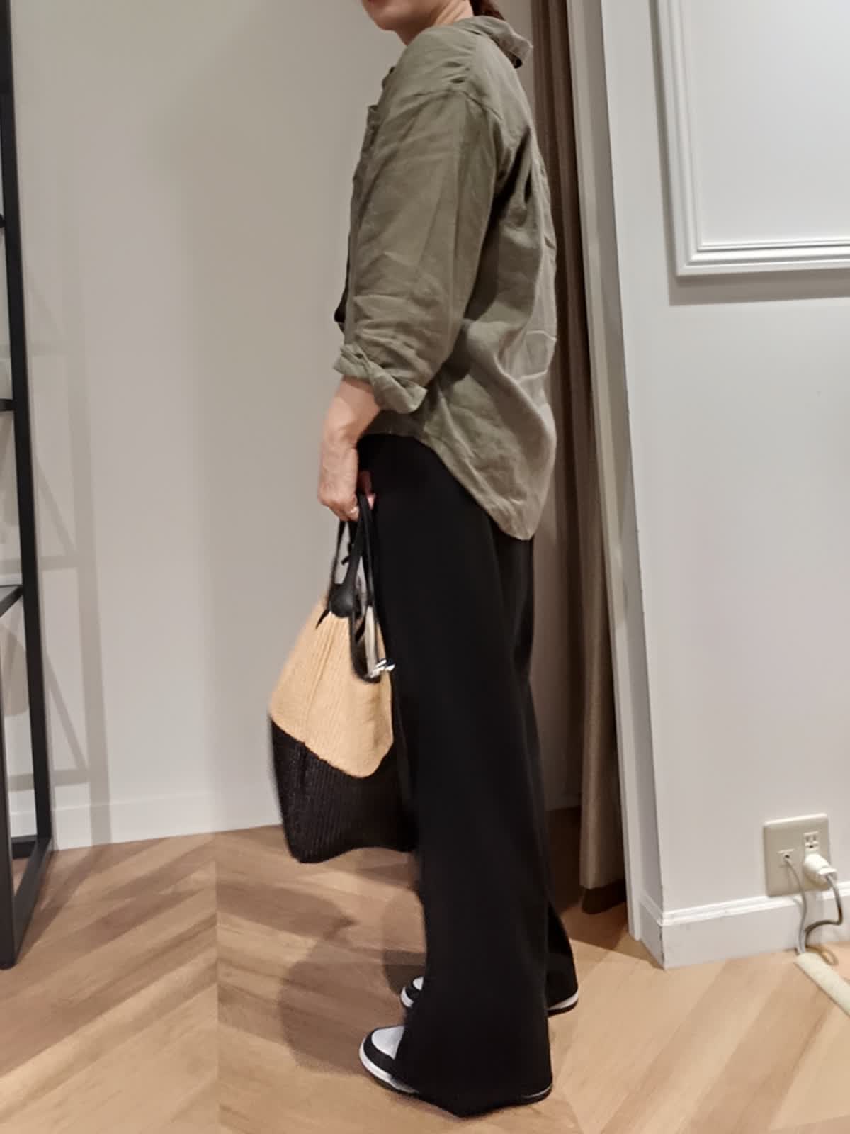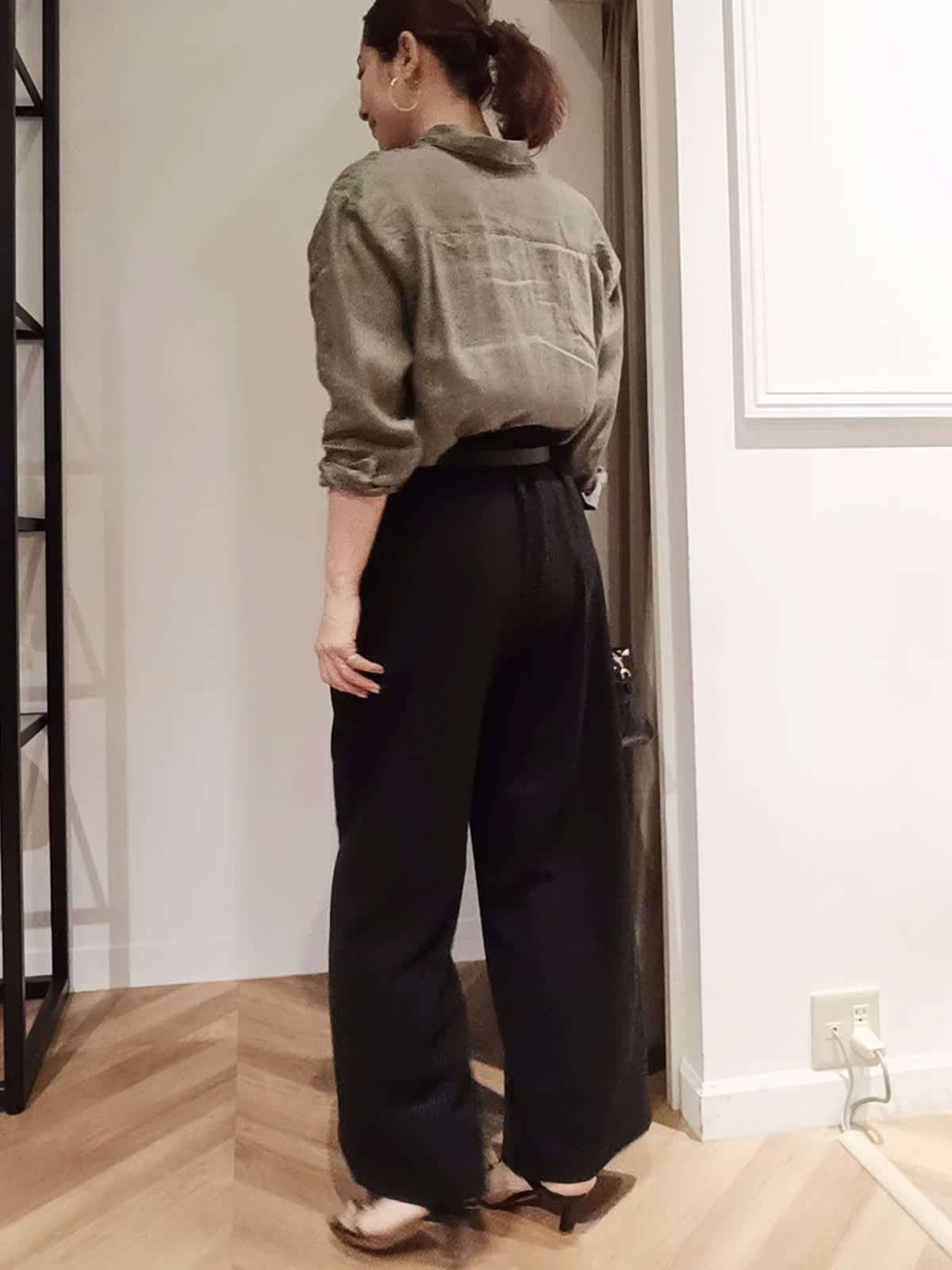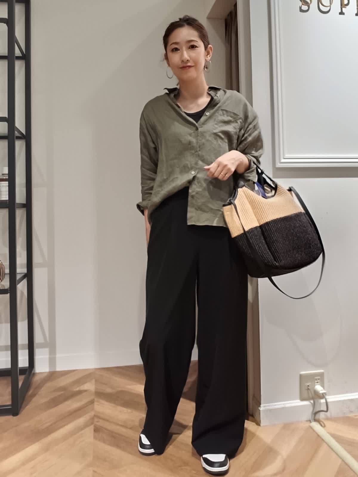 【着用サイズ:カラー】シャツ:9号:カーキ パンツ:11号:ブラック イージーワイドパンツは落ち感が良くはき心地も抜群でぜひ着て欲しいパンツです。夏まで涼しくはけて、キレイめカジュアルどちらでも使えます。シワも気にならないので旅行にもぴったりです。毎年人気の麻シャツもこれから夏まで活躍すること間違いなしです。