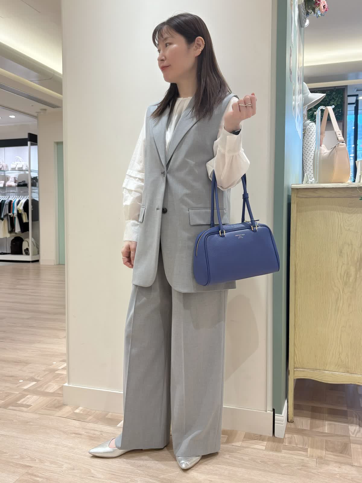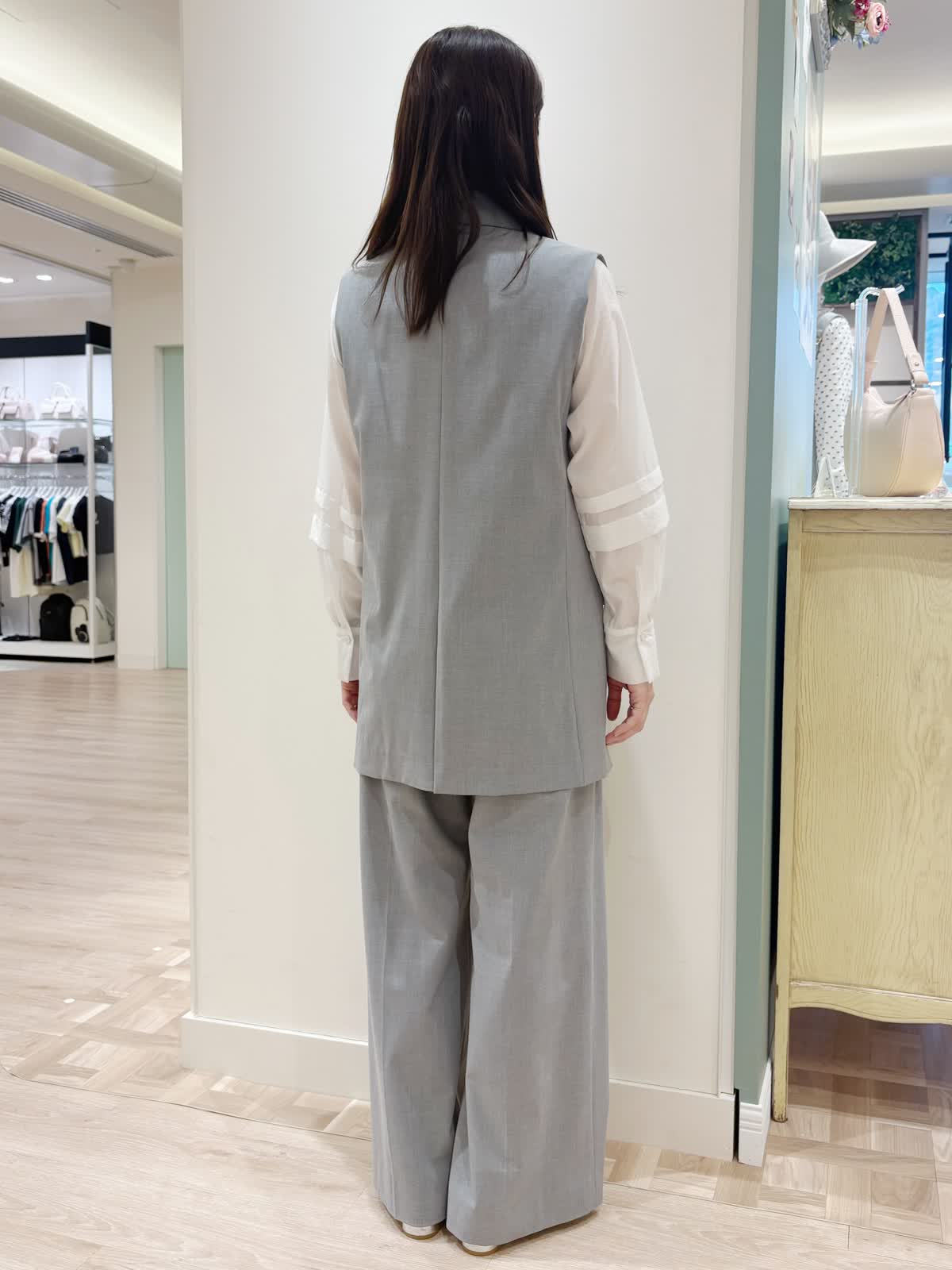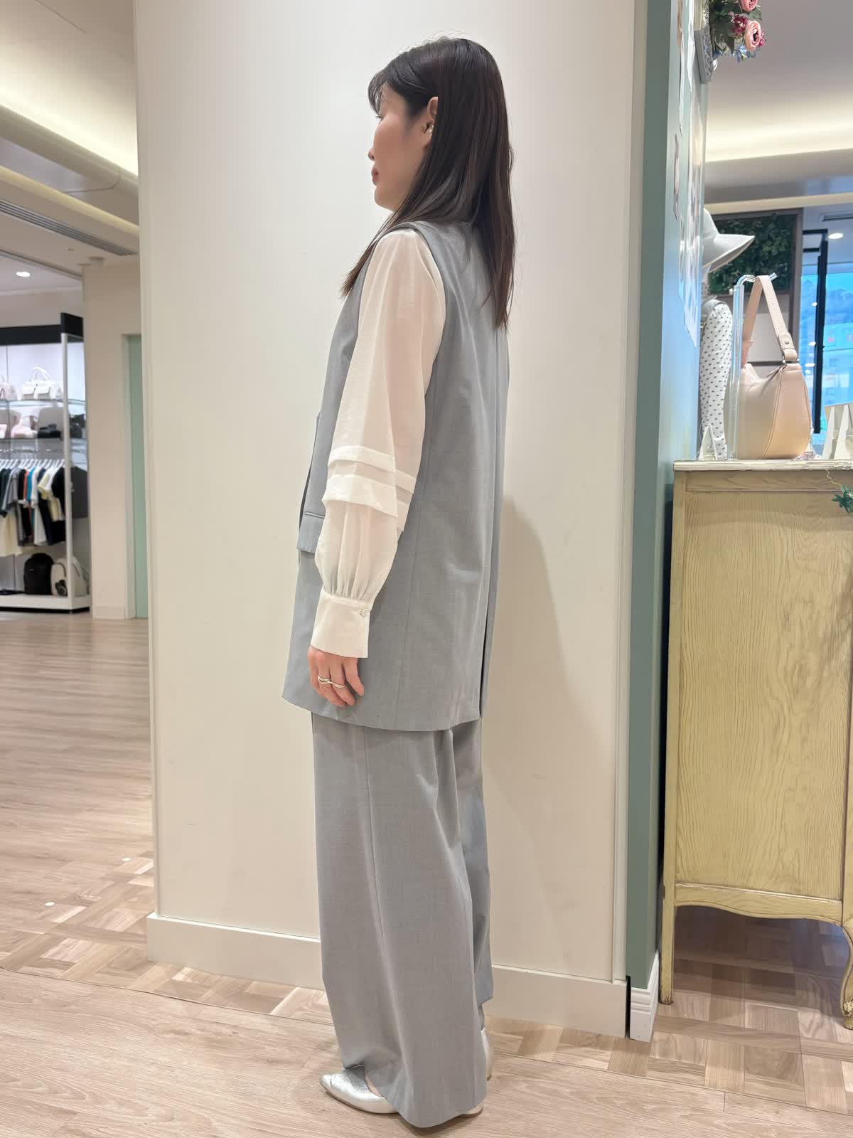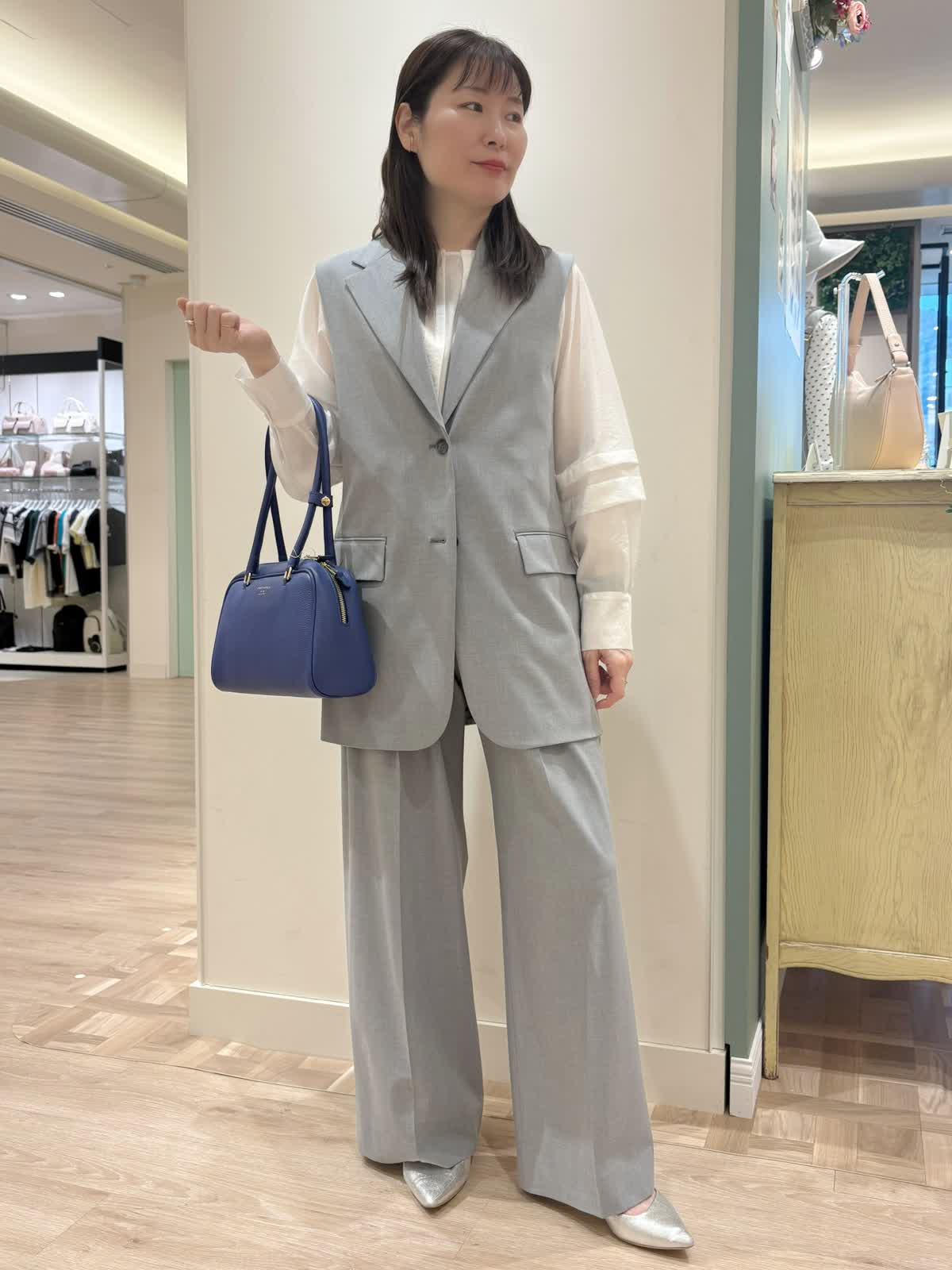 【着用サイズ】ジレ:9号ブラウス:9号スパンツ:9号【着用カラー】ジレ:グレーブラウス:オフホワイト パンツ:グレー 春の通勤スタイル。 ジレはスッキリしたシルエットで丈が長めでも野暮ったくなりません。オンでもオフでも色々なコーディネートでお使い頂けます。
