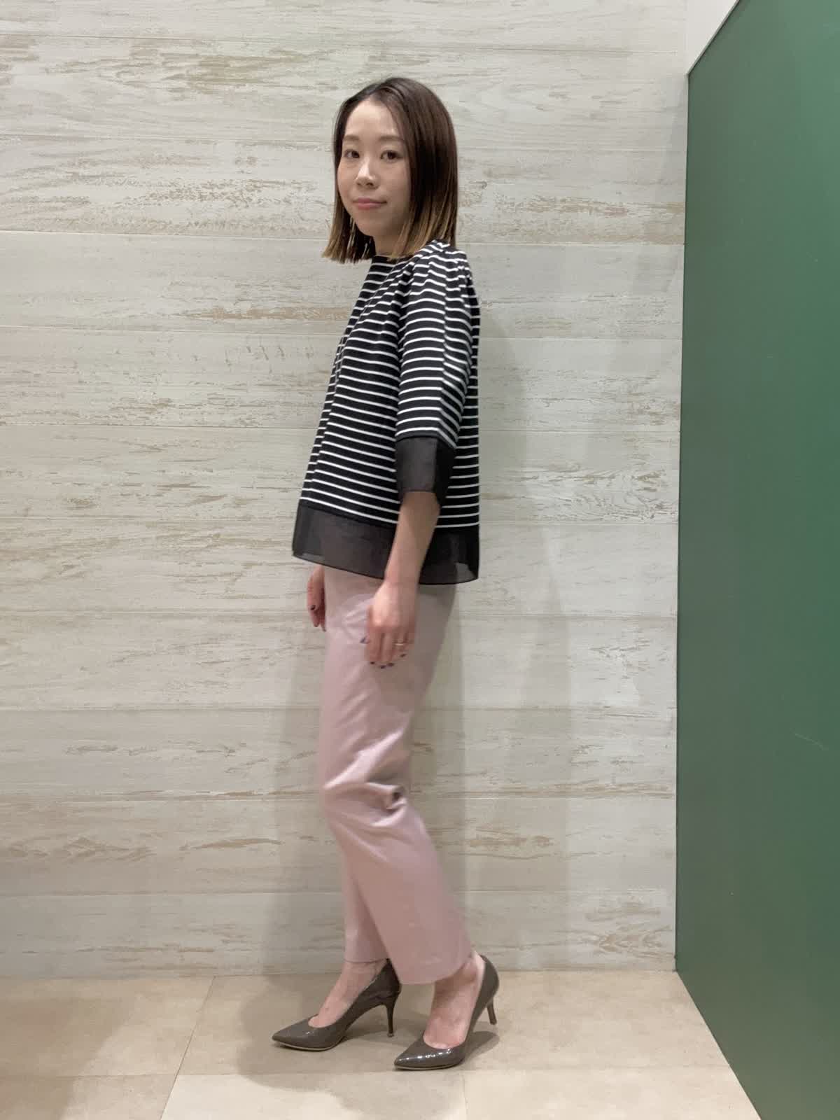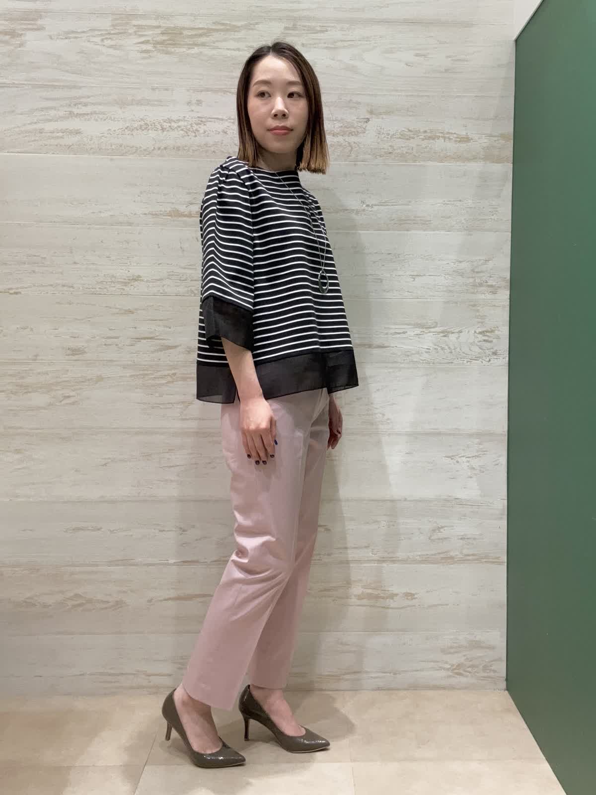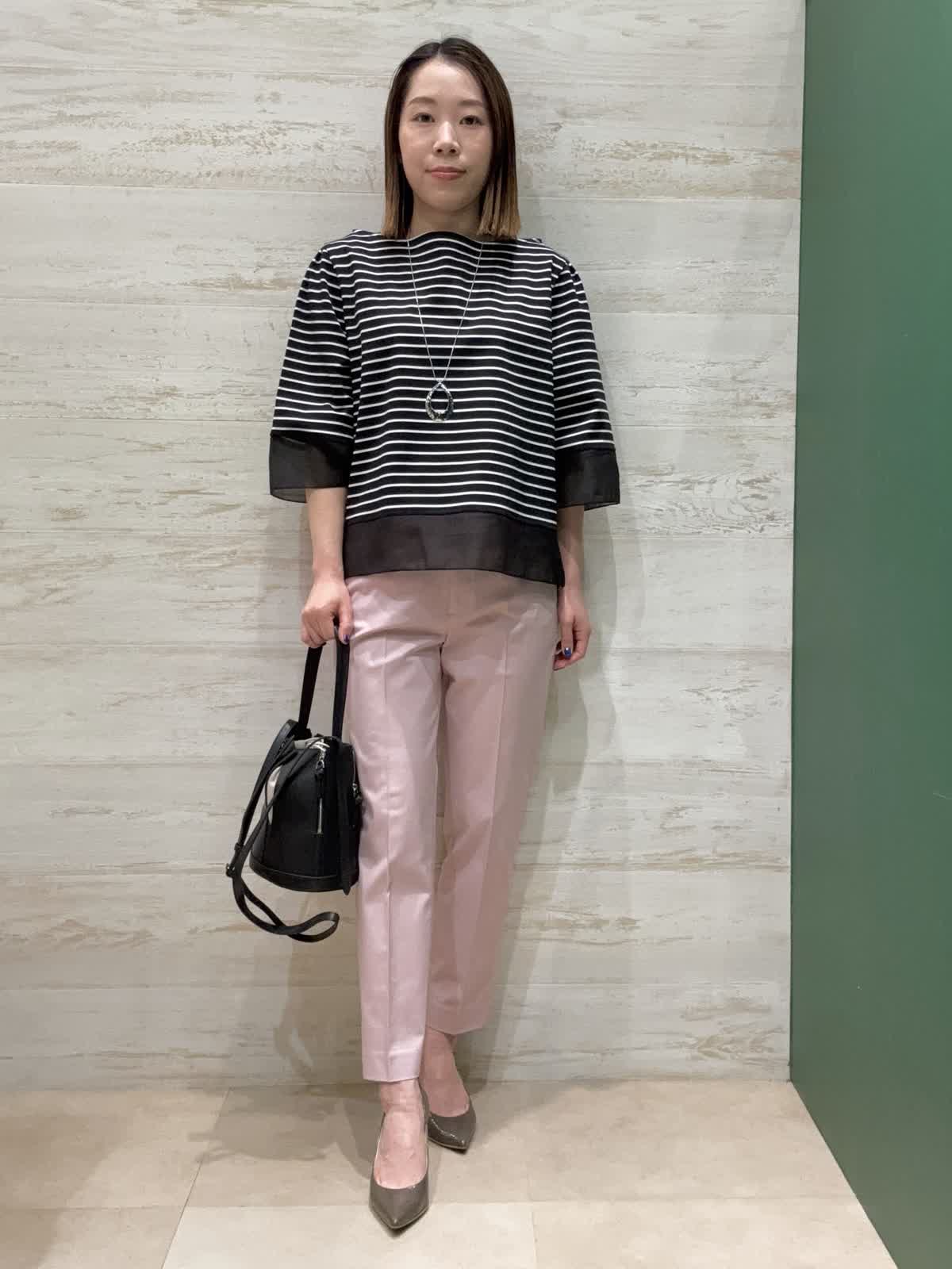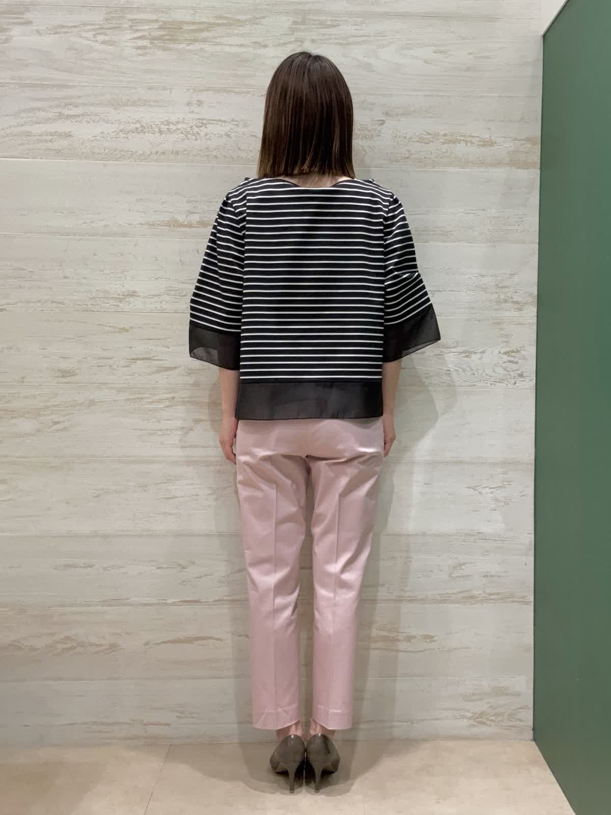 【着用カラー】カットソー:ブラック パンツ:ピンク 【着用サイズ】カットソー:フリー パンツ:7号 袖口と裾にシアー素材の切替が入ってるのが夏らしく軽やかに見せてくれます。二の腕もしっかり隠してくれるので嬉しい袖丈感です。 トップスがクロボーダーなので重くならないようにピンクのテーパードパンツで合わせてみました。