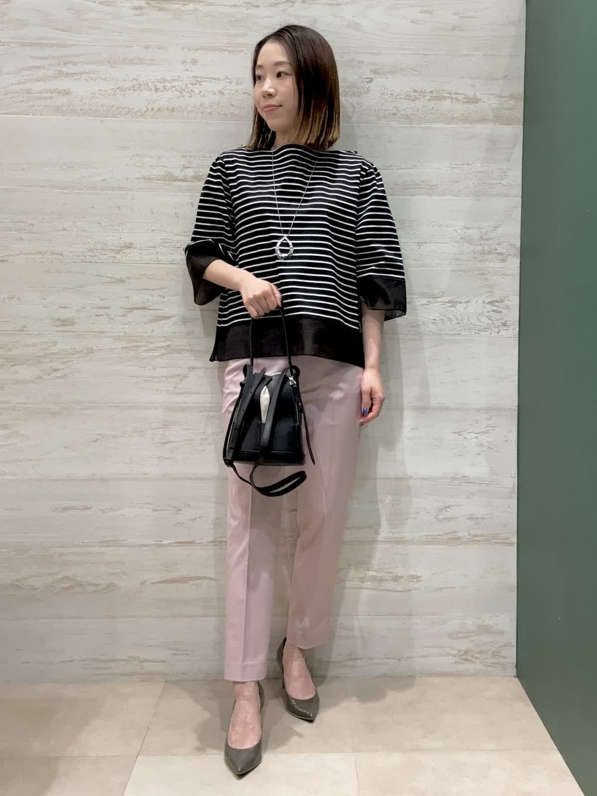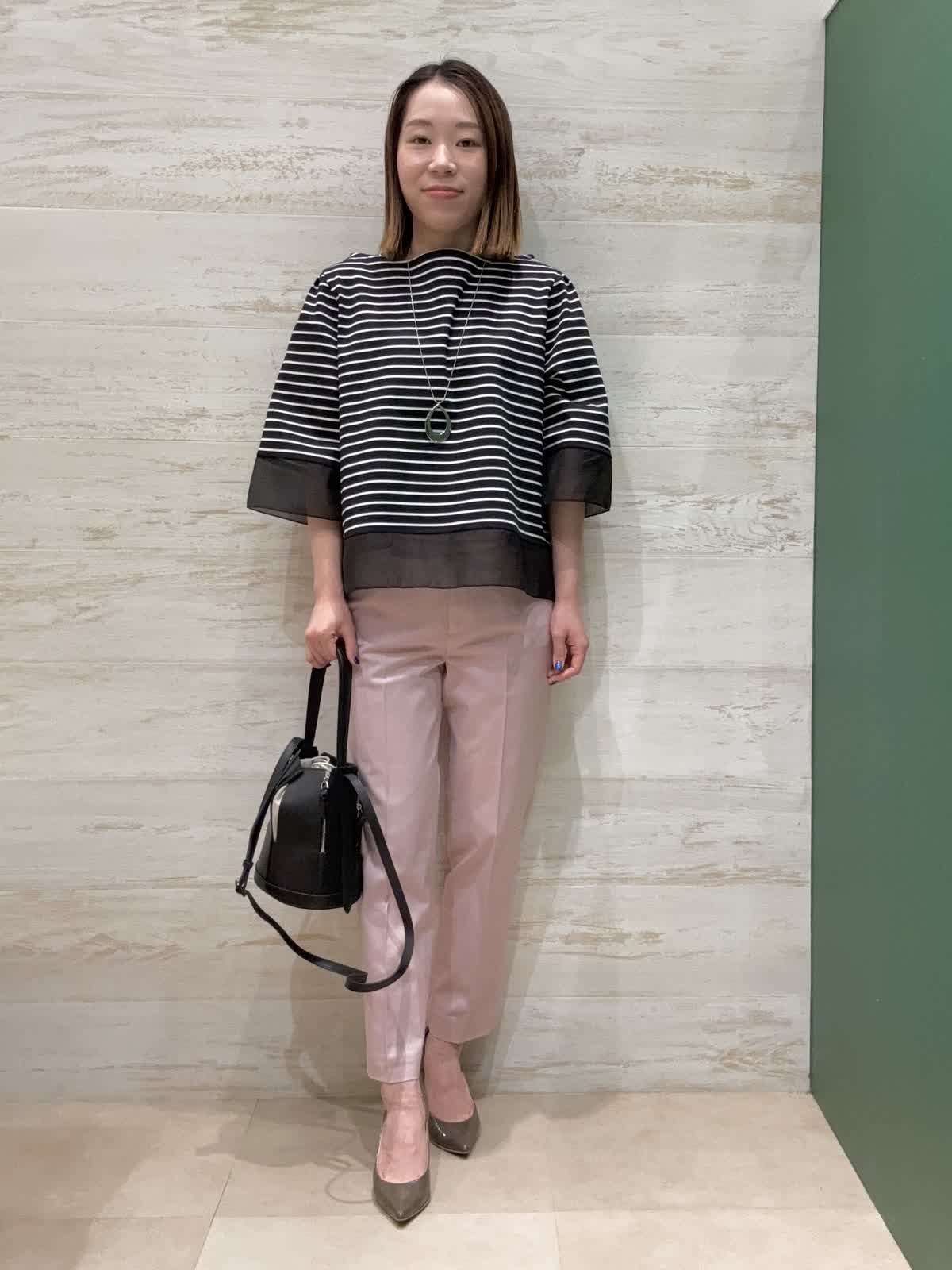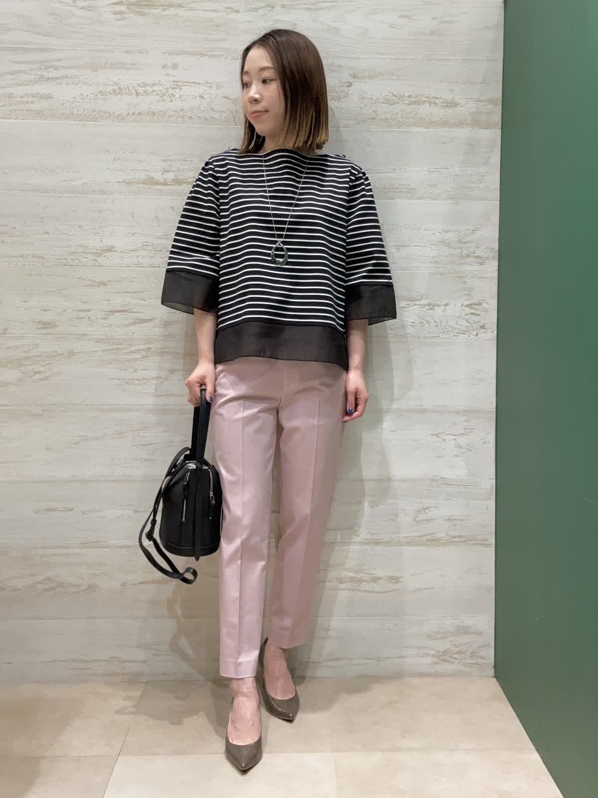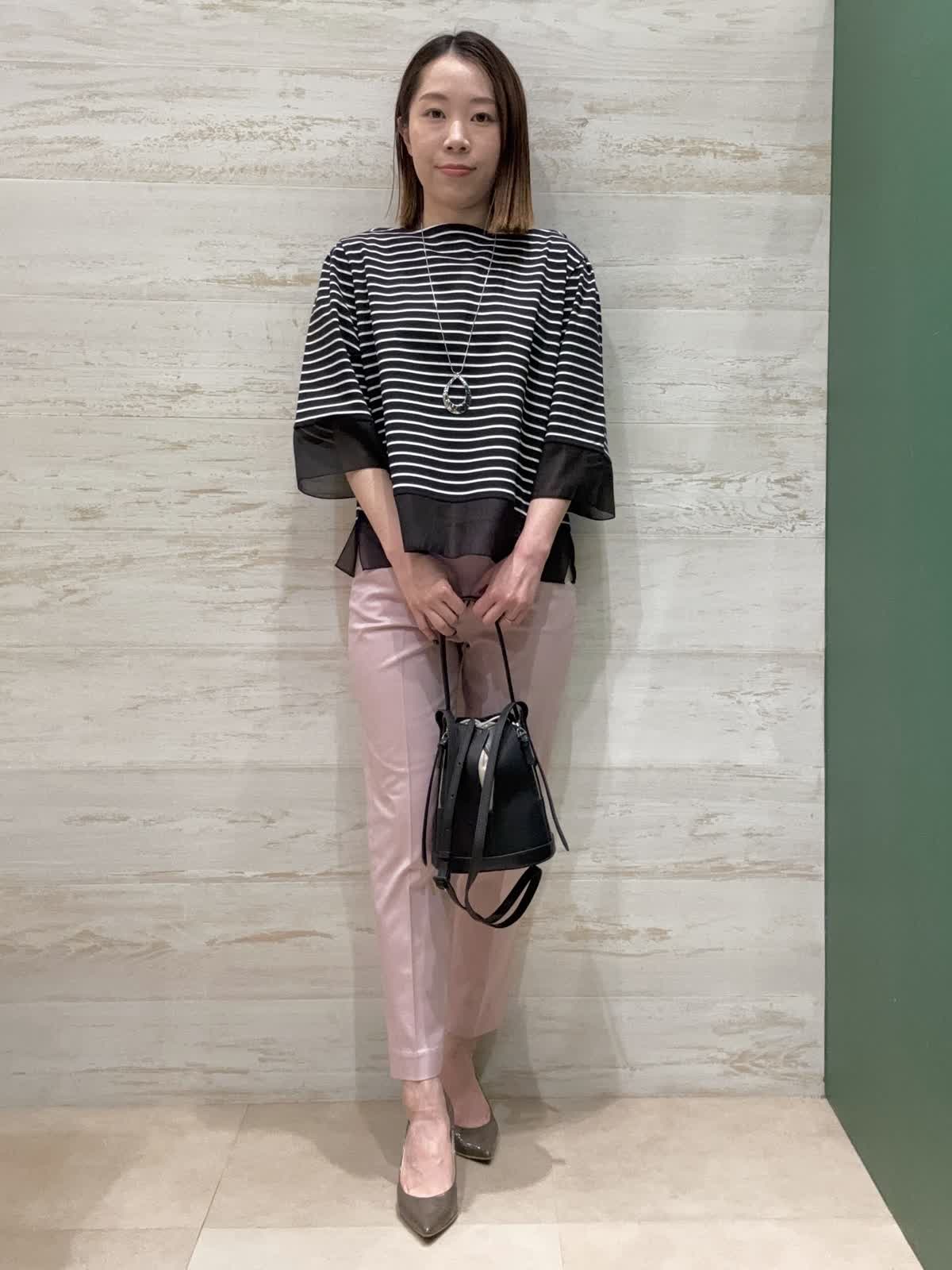 【着用カラー】カットソー:ブラック パンツ:ピンク 【着用サイズ】カットソー:フリー パンツ:7号 袖口と裾にシアー素材の切替が入ってるのが夏らしく軽やかに見せてくれます。二の腕もしっかり隠してくれるので嬉しい袖丈感です。 トップスがクロボーダーなので重くならないようにピンクのテーパードパンツで合わせてみました。