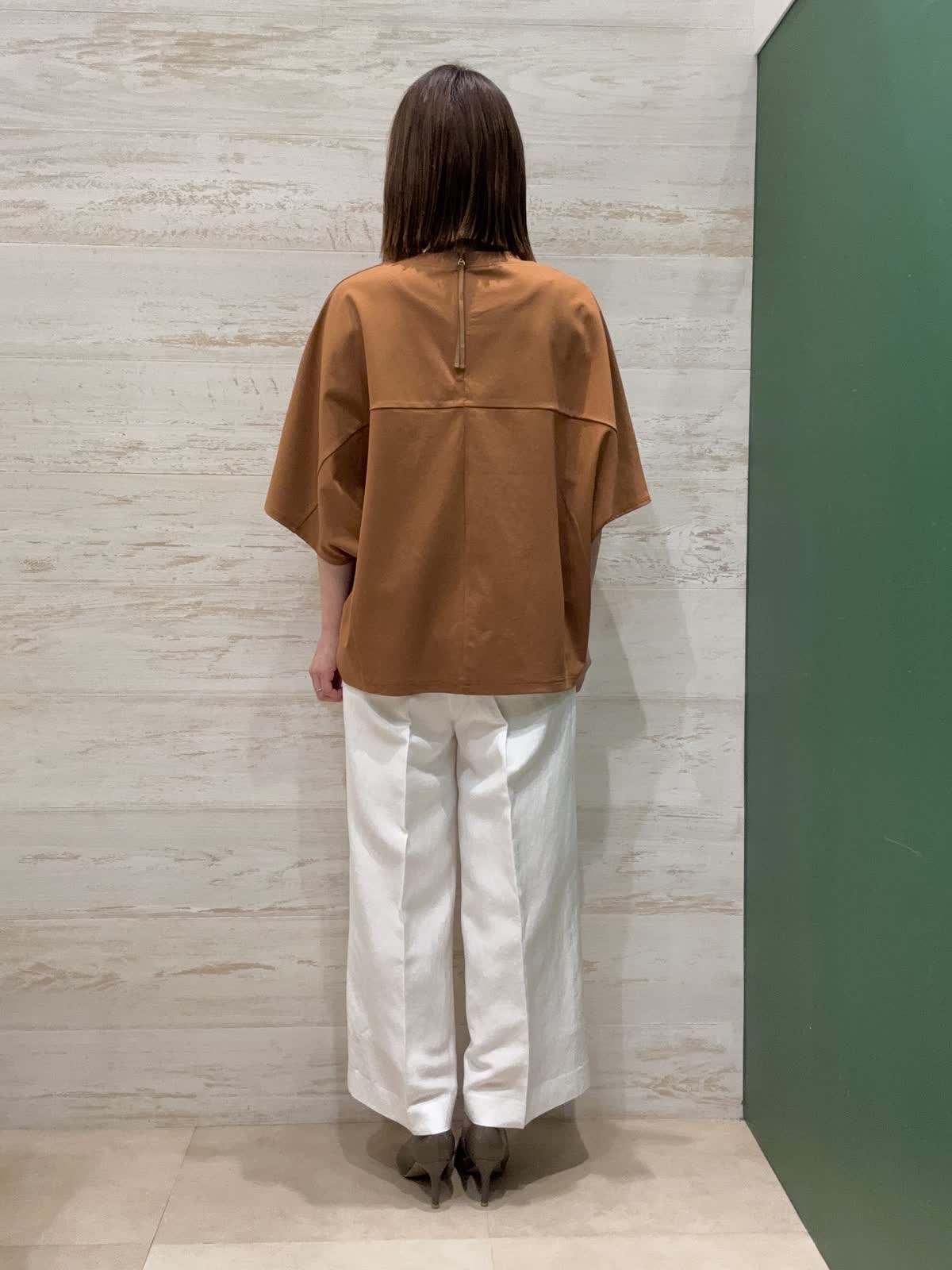 【着用カラー】ブルゾン:クロ カットソー:キンチャ パンツ:オフホワイト バック:ブラウン 【着用サイズ】ブルゾン・カットソー:フリー パンツ:7号 UVカットと接触冷感の機能が付いたカットソーは暑い夏の日にぴったりな1枚です。ドルマンスリーブのデザインなので肌に張りつかず軽くて着心地が良いです。