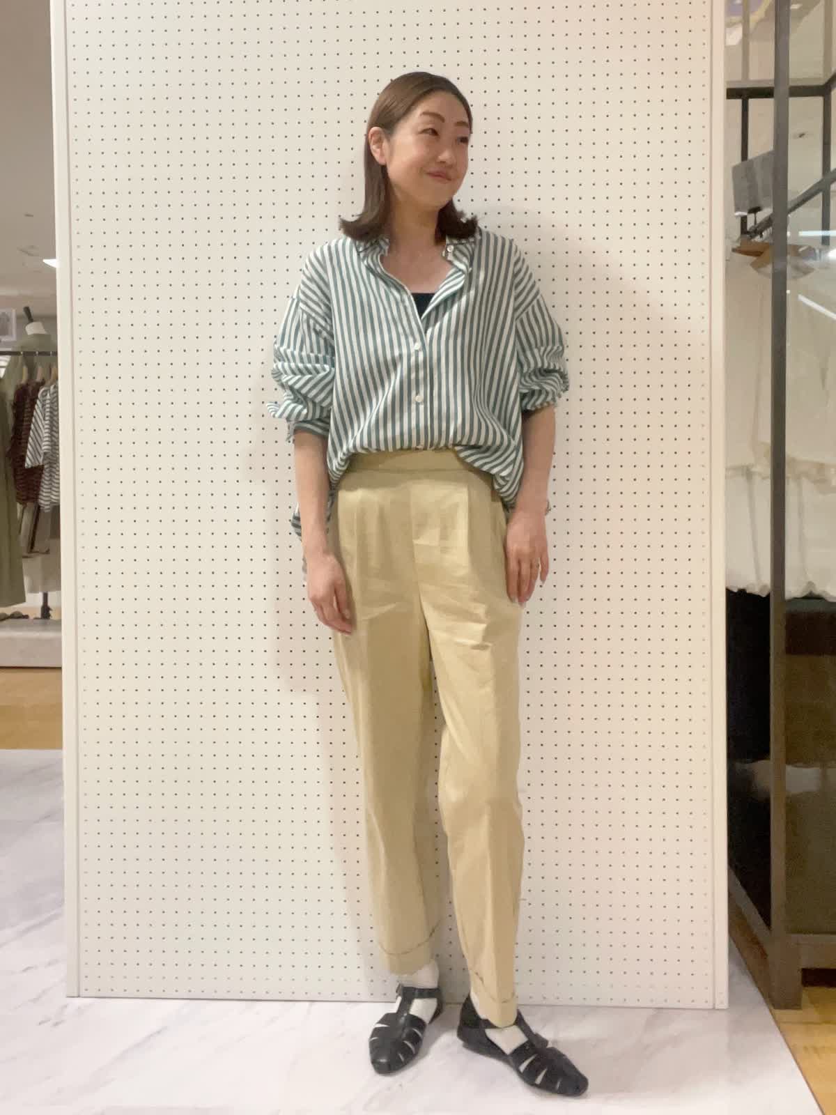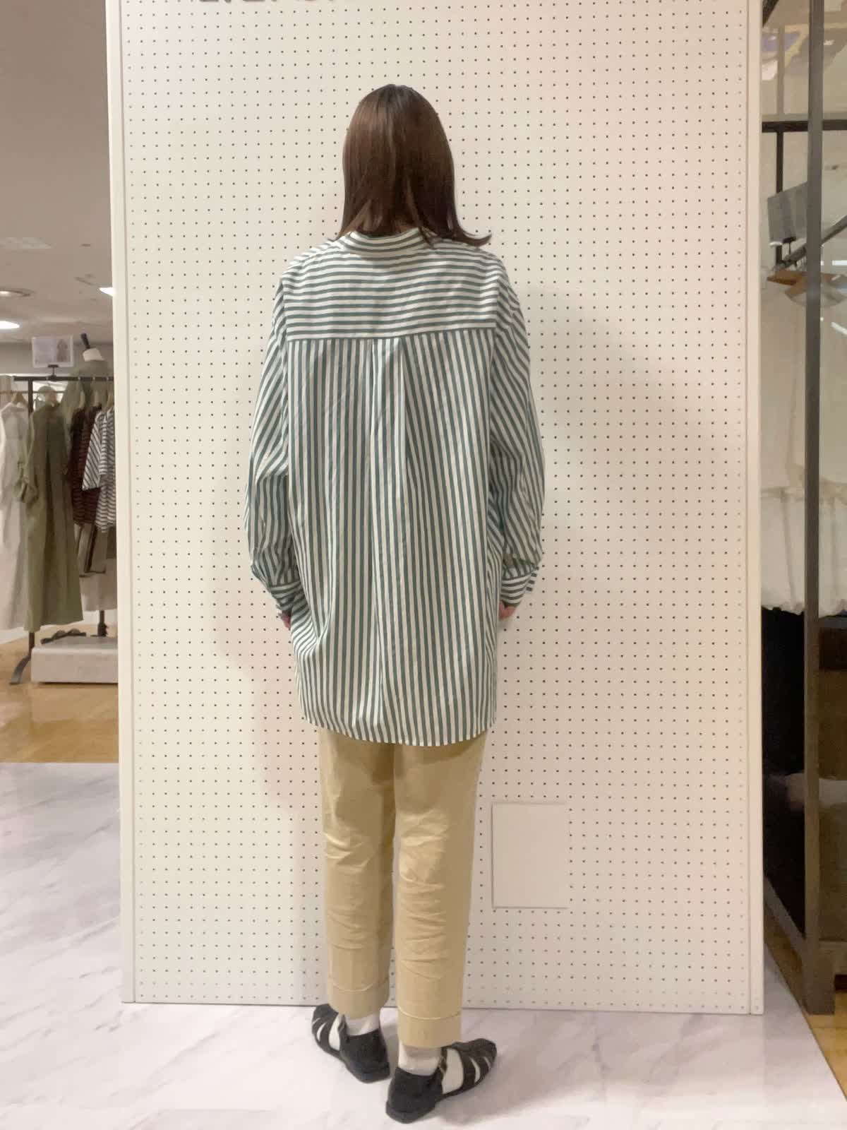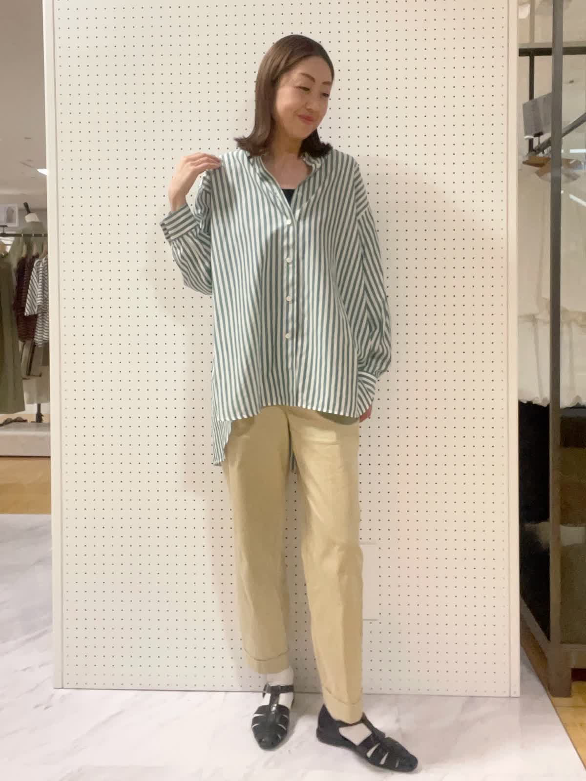 【着用サイズ】シャツ:フリー インナー パンツ:9号【着用カラー】シャツ:グリーン インナー:ブラック パンツ:ベージュ オフィスカジュアル。夏のスタイリングに欠かせないストライプシャツ。グリーンカラーが爽やかな印象へ。イン、アウト両方とも可能でスタイリングを楽しめますよ!