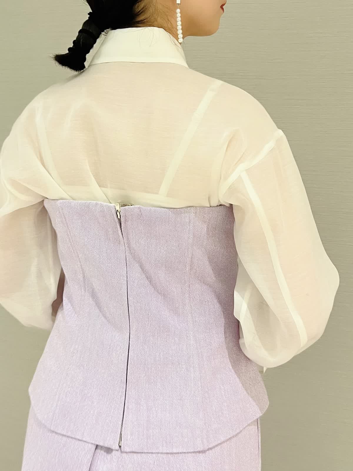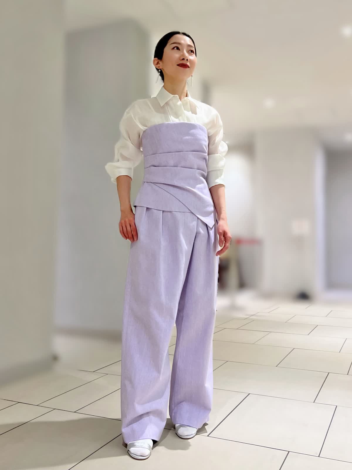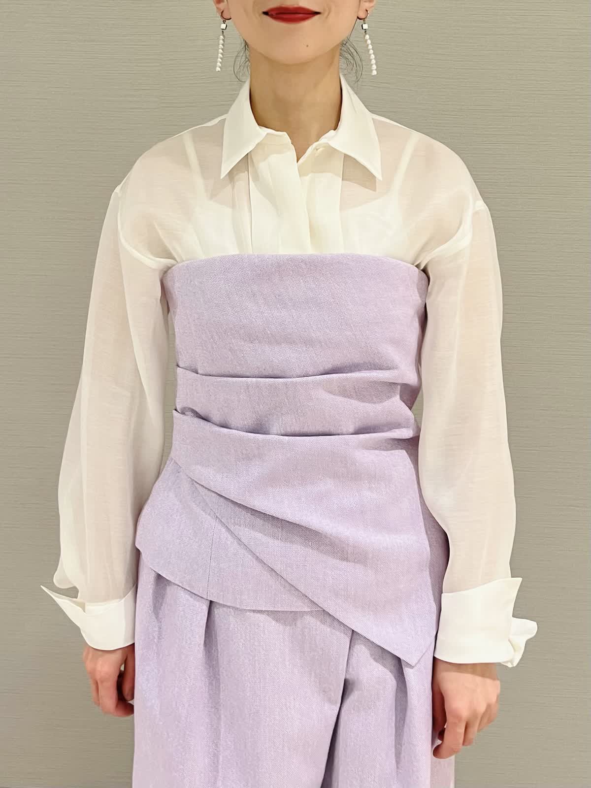 【カラー・サイズ】ビスチェ:パープル・7号 シャツ:オフホワイト・7号 パンツ:パープル・7号 ボディラインを美しくみせてくれるビスチェ 。カットソーやシャツ、ワンピースとレイヤードして自由にスタイリングを楽しめます。