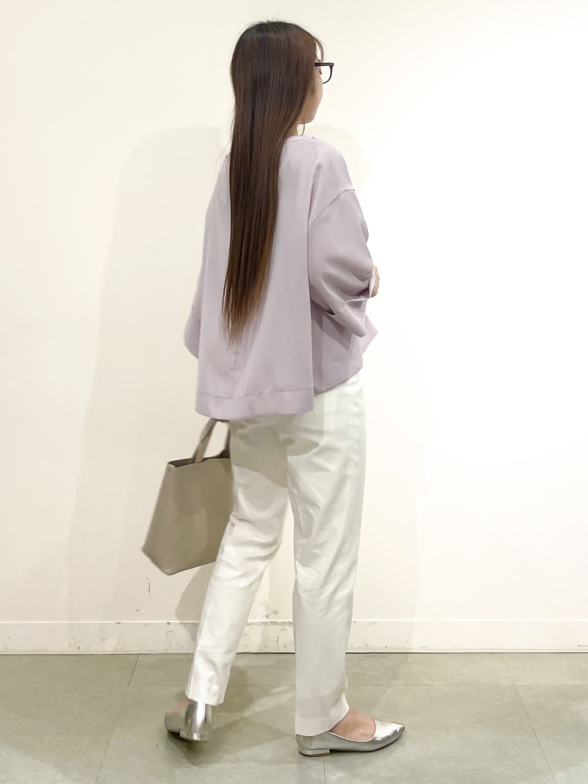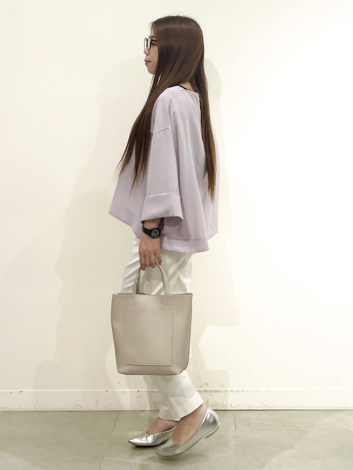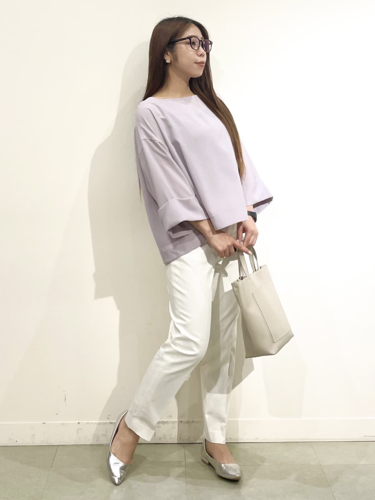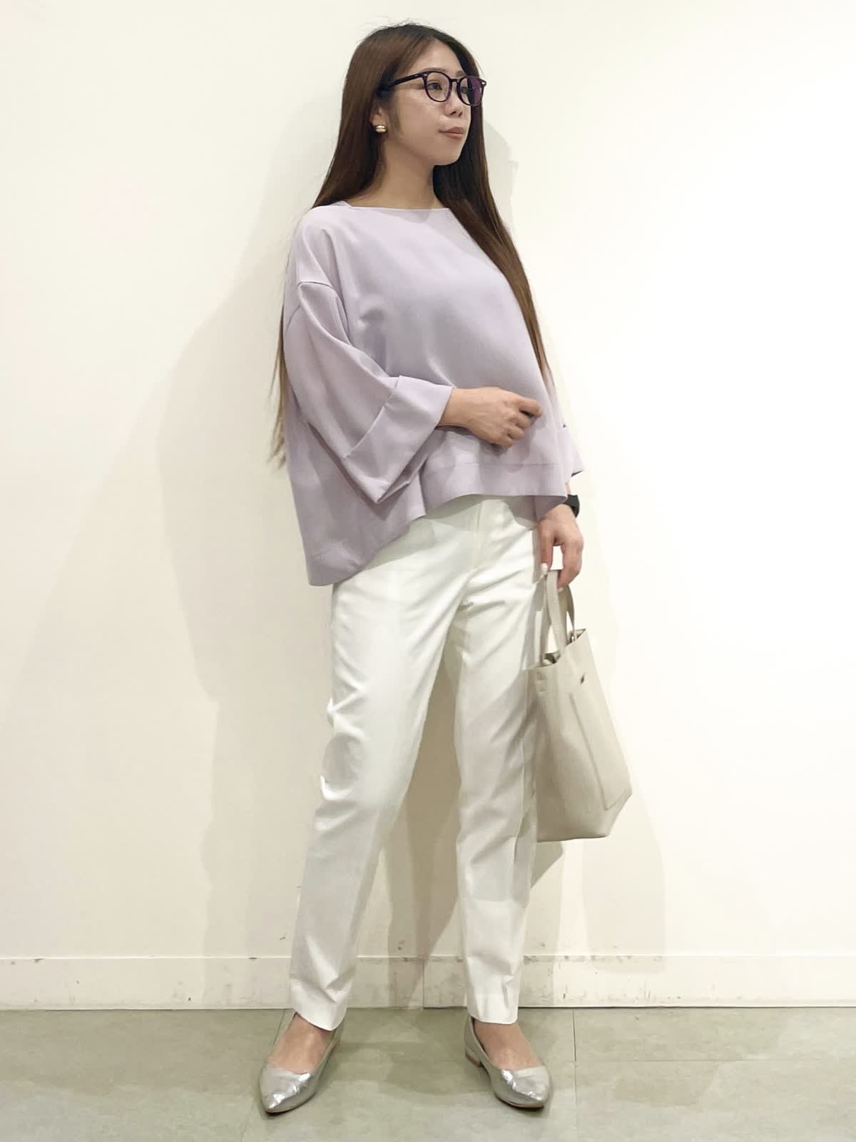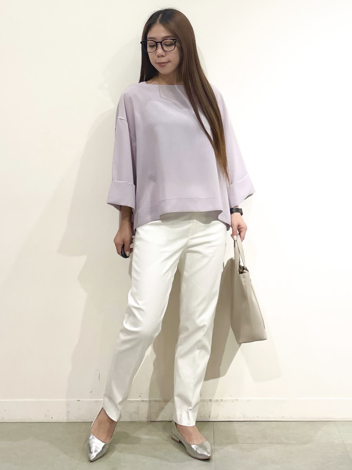 【着用サイズ】ブラウス:フリーパンツ7号 ブラウス:ラベンダー/パンツ:ホワイト I.T.'S. international毎年人気のブラウスは新色のラベンダーで上品コーデにしてみました。 シワを気にしなくても良い点、忙しい朝にもピッタリ◎ストレッチ感のあるテーパードパンツでスッキリ見えコーデにしてみました。