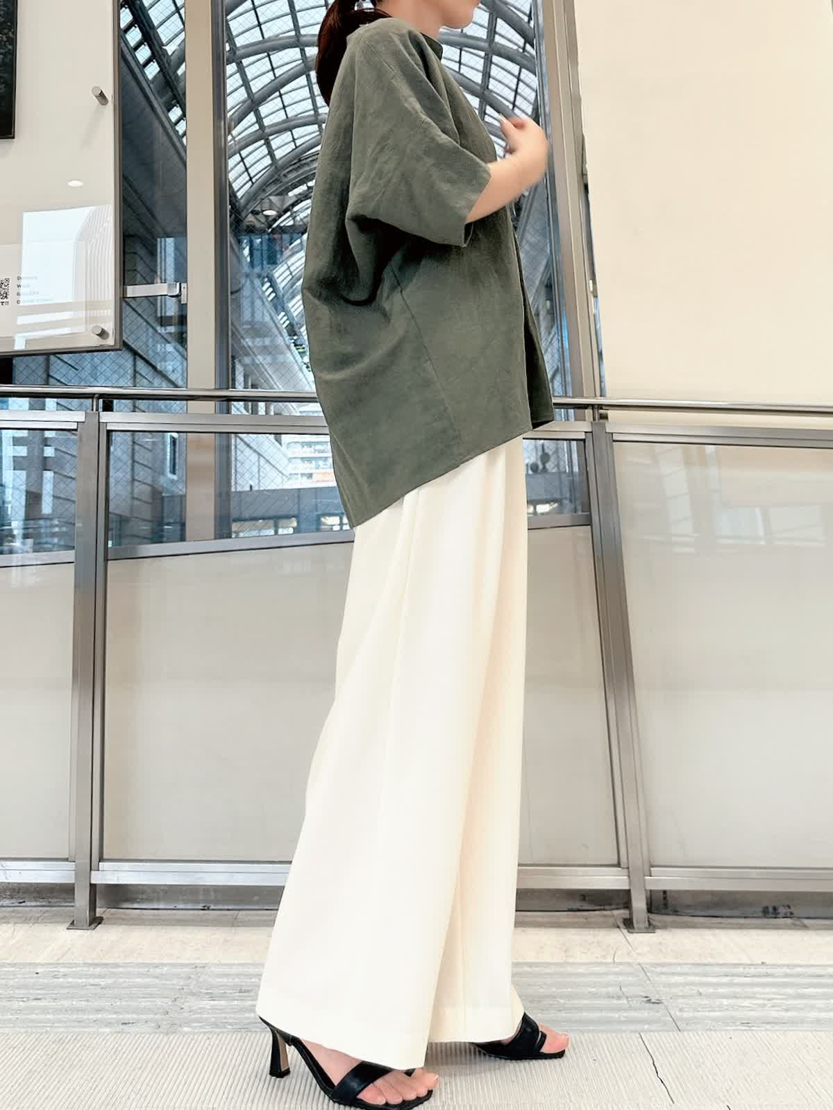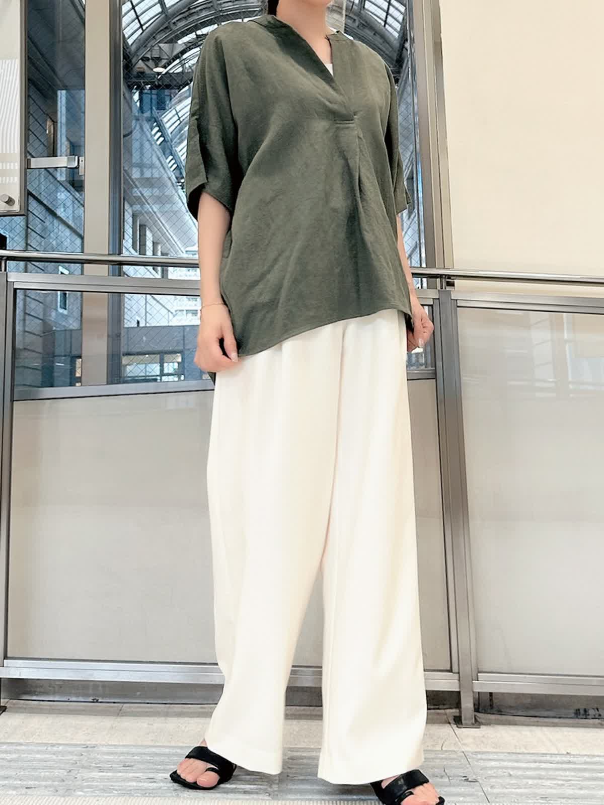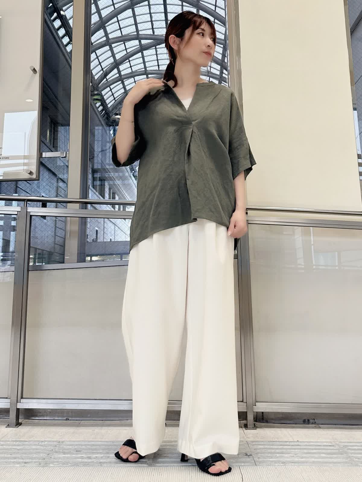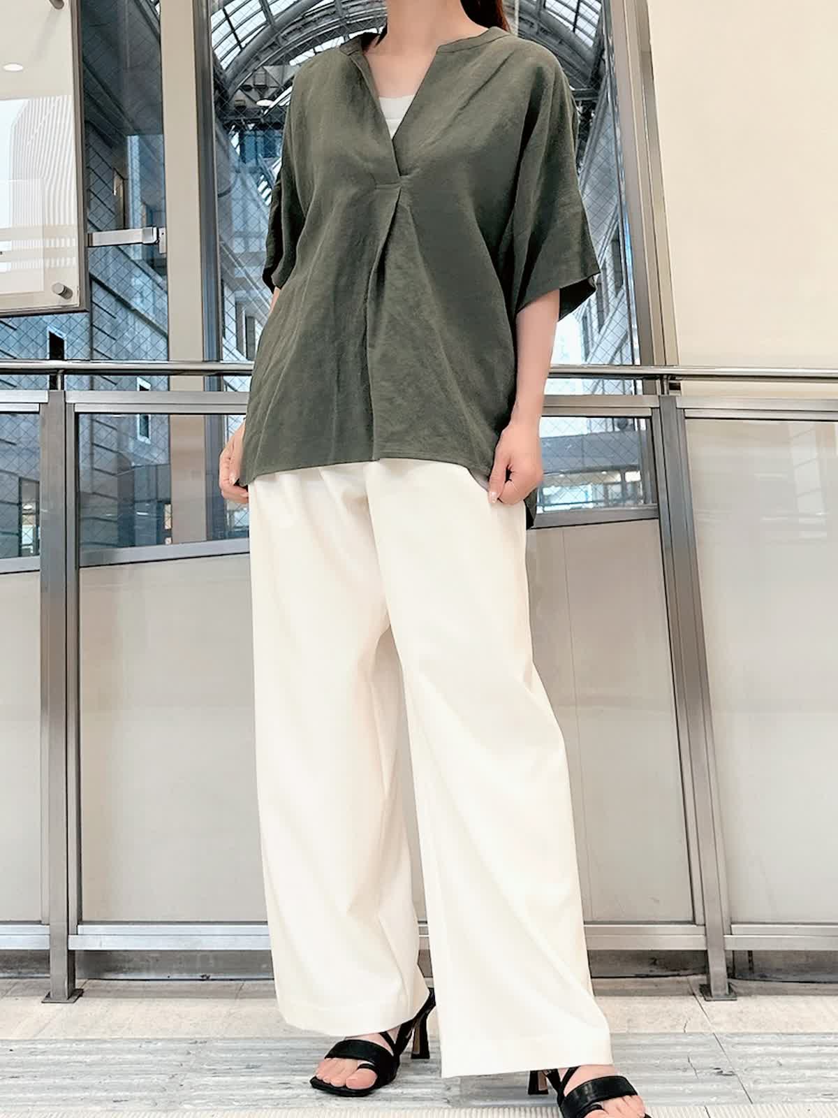 【着用サイズ/カラー】 ブラウス:9号/カーキ パンツ:9号/オフホワイト タンクトップ:7号/グレー 春夏シーズンに大活躍するリネン素材。 通気性がよくサラッとした肌触りなので、汗ばむ季節には最適です。 スキッパーシャツならきちんと感がありつつ、こなれた雰囲気を出してくれます。 カジュアルに見えるカーキもオフホワイトのパンツを合わせればきれいめに。