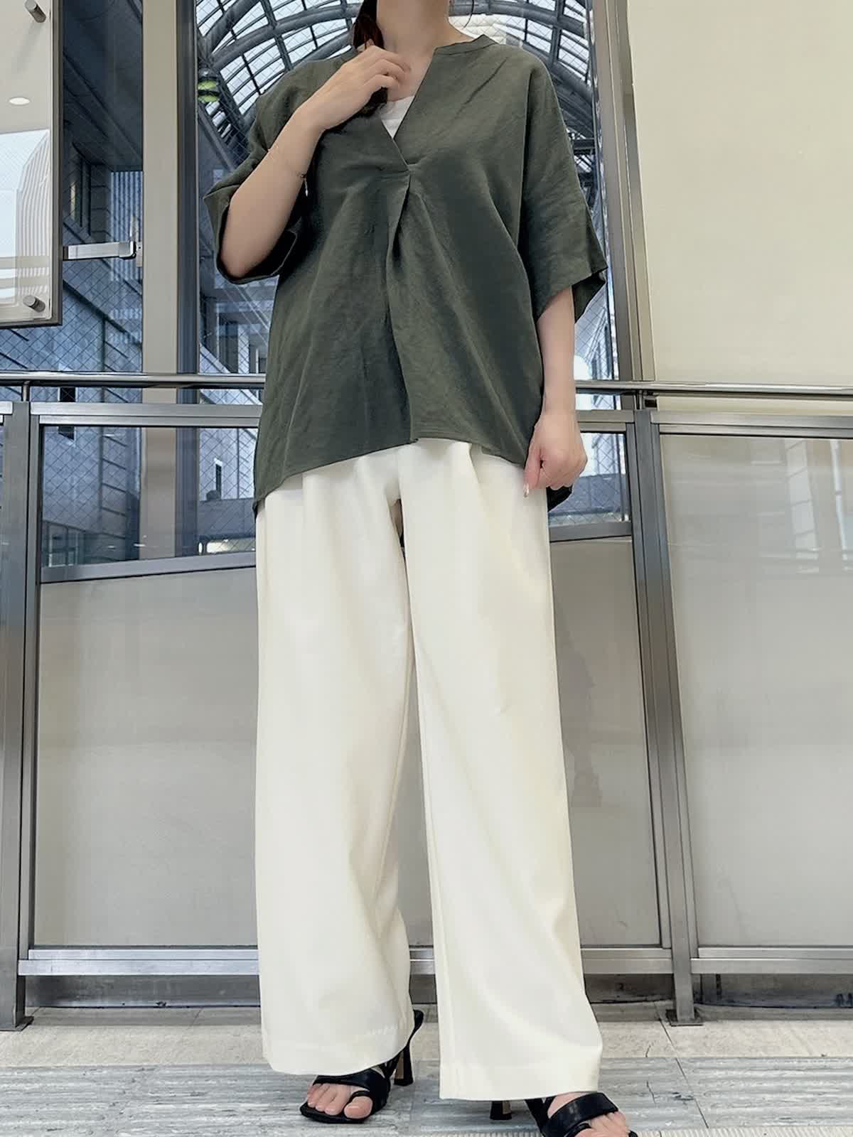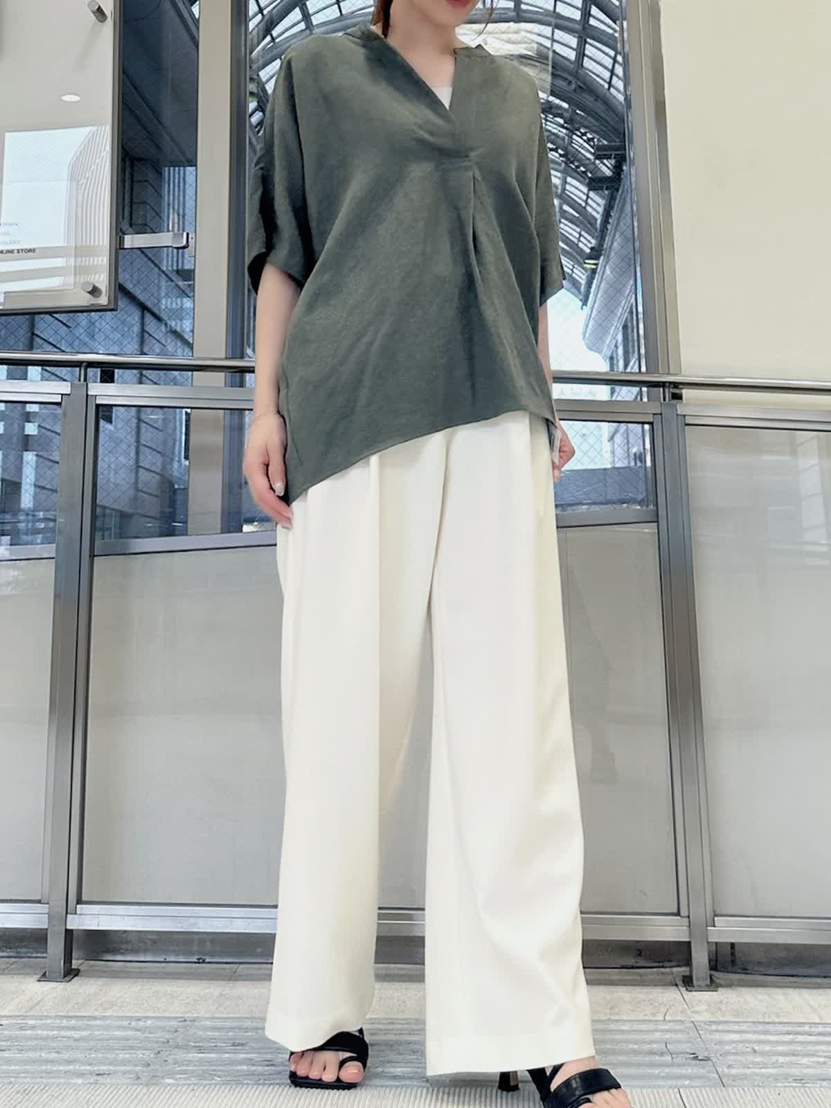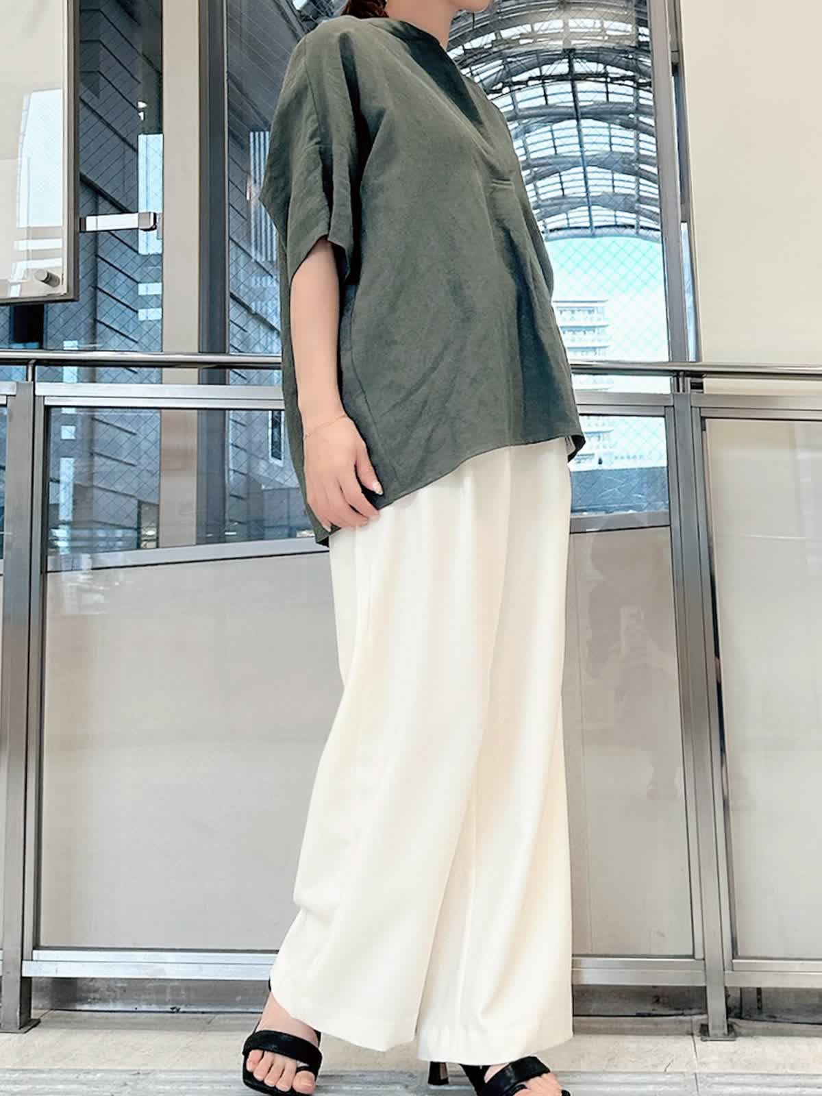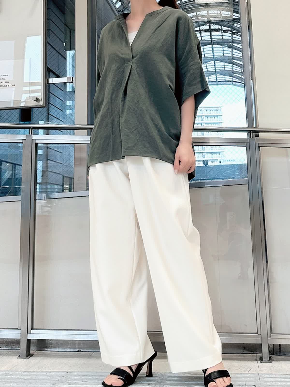 【着用サイズ/カラー】 ブラウス:9号/カーキ パンツ:9号/オフホワイト タンクトップ:7号/グレー 春夏シーズンに大活躍するリネン素材。 通気性がよくサラッとした肌触りなので、汗ばむ季節には最適です。 スキッパーシャツならきちんと感がありつつ、こなれた雰囲気を出してくれます。 カジュアルに見えるカーキもオフホワイトのパンツを合わせればきれいめに。