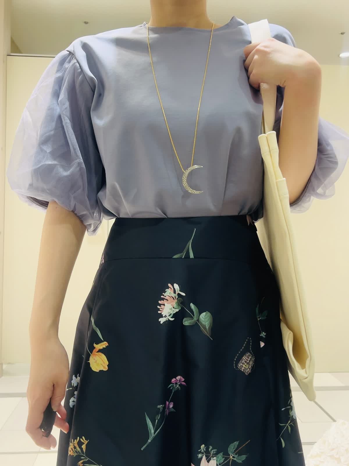 【着用サイズ】カットソー:9号 スカート:5号 【着用カラー】カットソー:サックス スカート:ネイビー 夏のフェミニンさを取り入れたカジュアルコーディネート。サラッと着心地のいいカットソーは袖がチュールになっており1枚でも着やすいアイテム。スカートだけでなくパンツとも合わせて頂きやすいおすすめのアイテムです。
