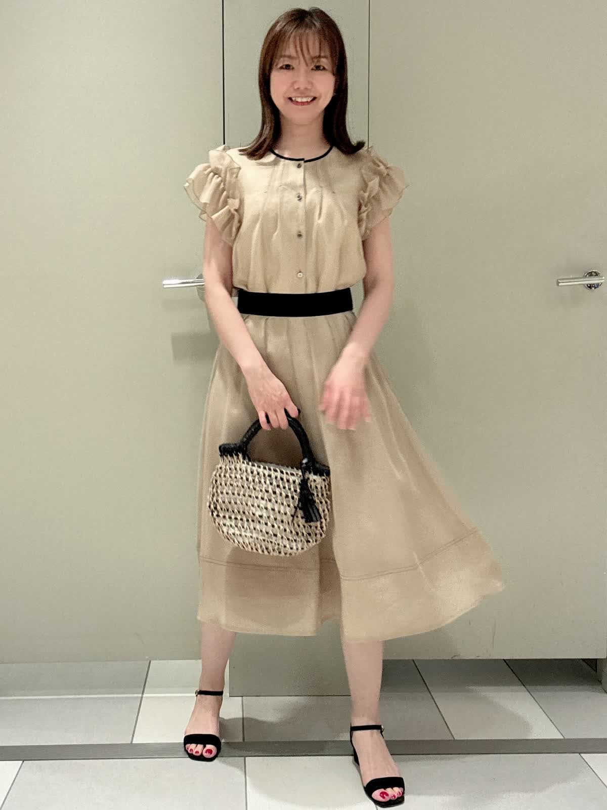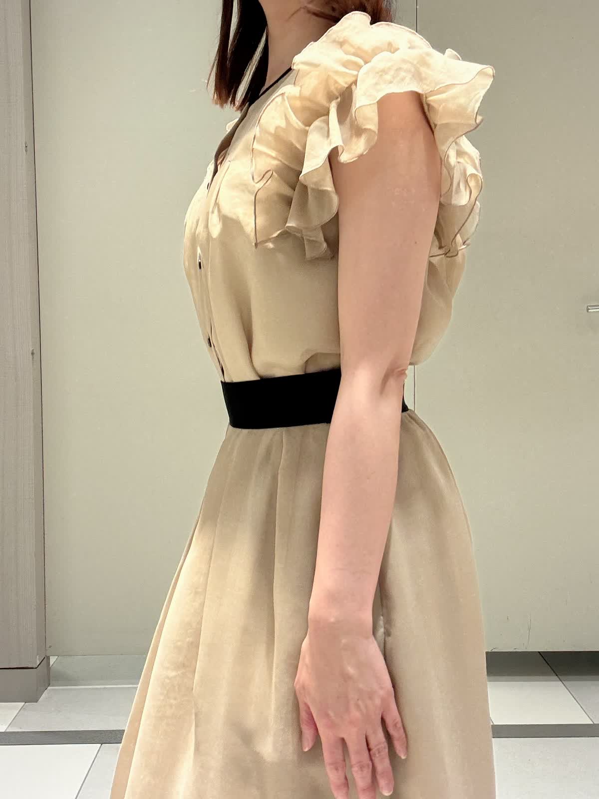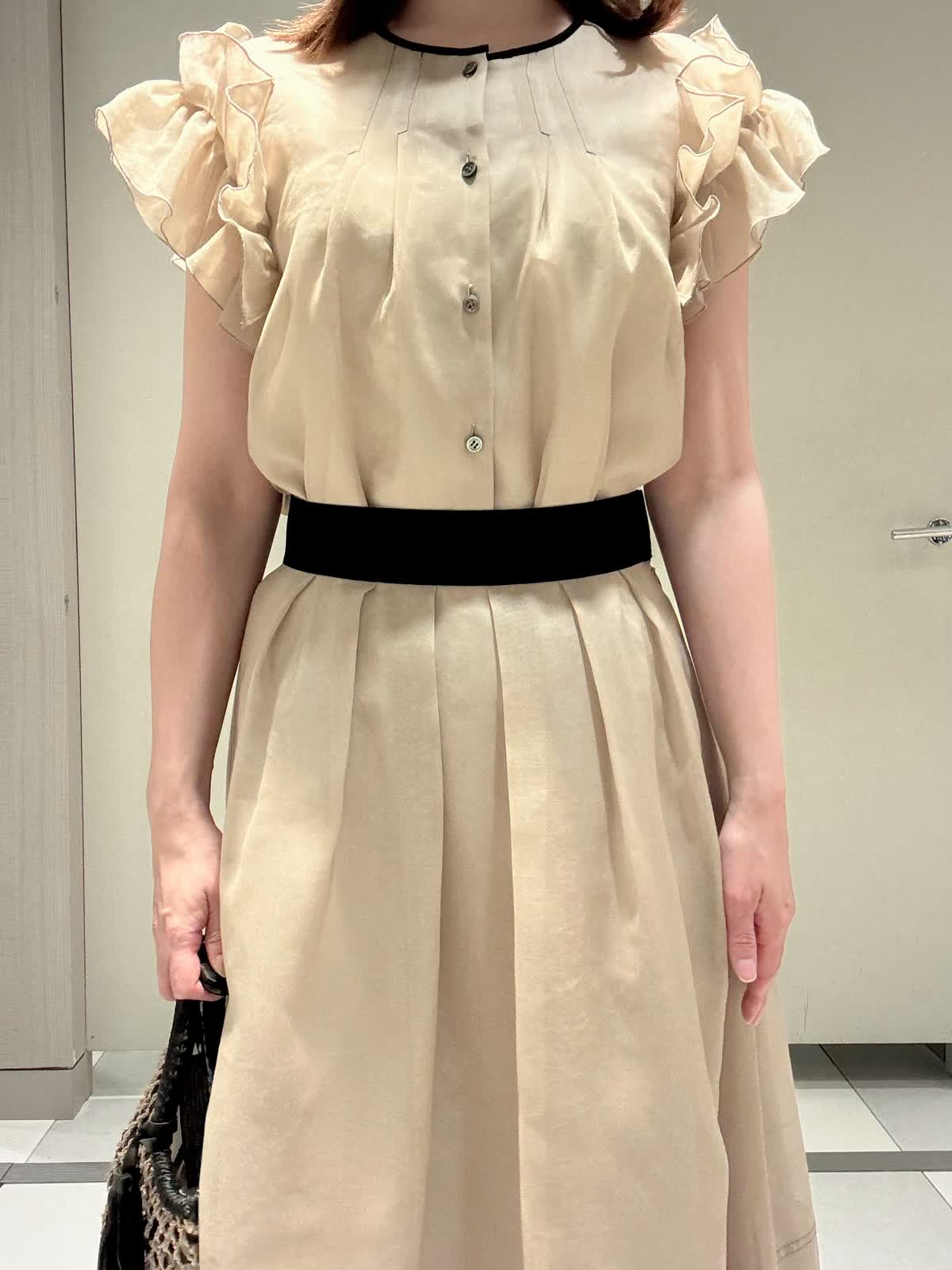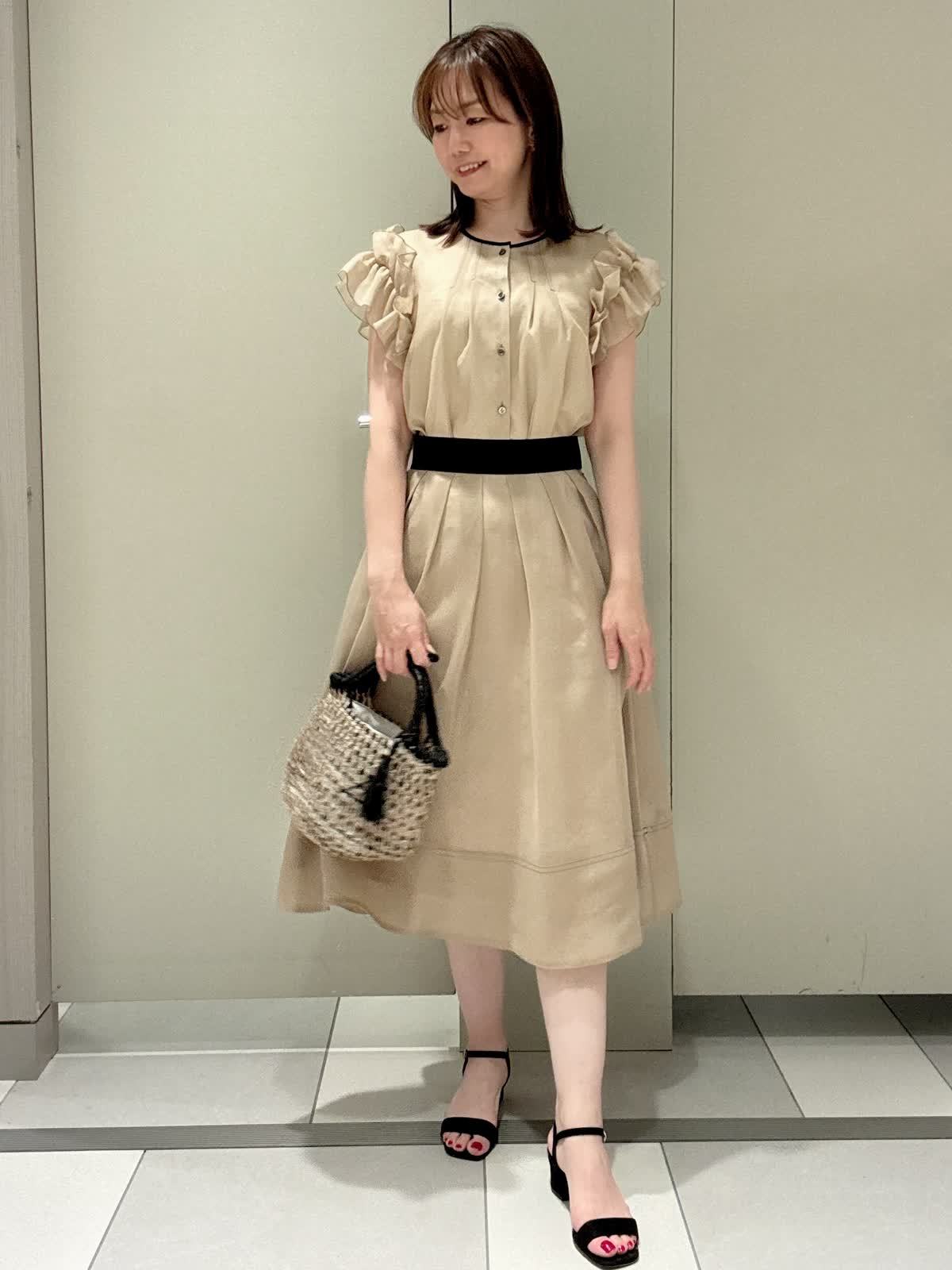 【着用サイズ/カラー】ブラウス:7号/ベージュ スカート:9号/ベージュ パンツ:9号/ホワイト ワンピース見えするツーピース 袖先がフリルで腕がスッキリ見えるのが嬉しいブラウスに、スカートは黒のグログランがポイントです。またウエストは伸縮性があまりないのでゆとりが欲しい私は購入時はいつものサイズより1サイズあげようと思います。
