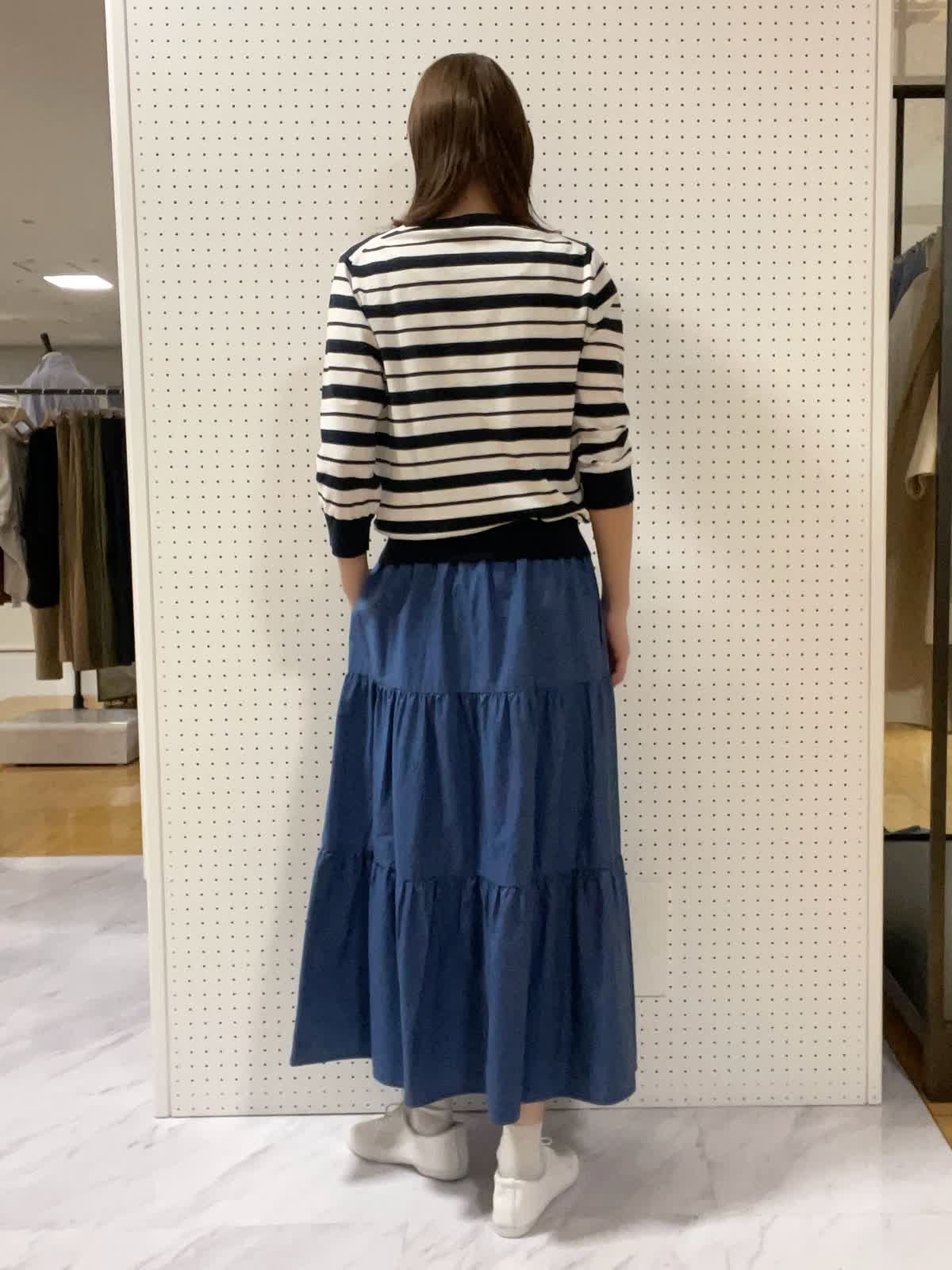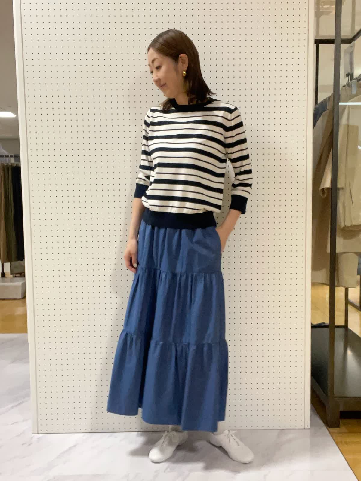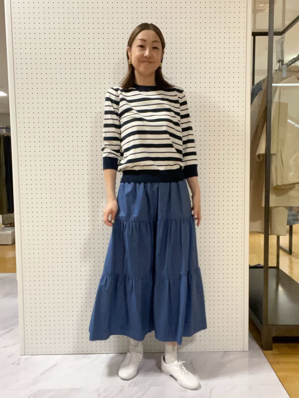 【着用サイズ】ニット、スカート共に:フリー【着用カラー】ニット:ネイビー スカート:サックス 休日スタイル。お袖が7部袖で今の季節に丁度良いボーダーニット。デニムライクの軽くて涼しく穿けるスカートで清涼感ある印象に!