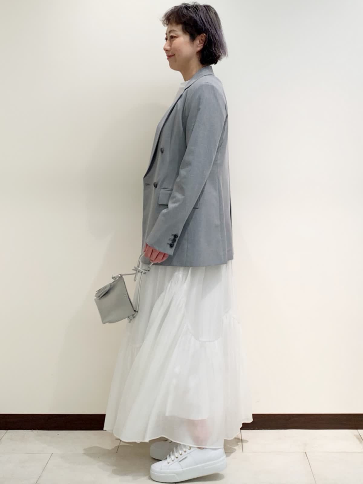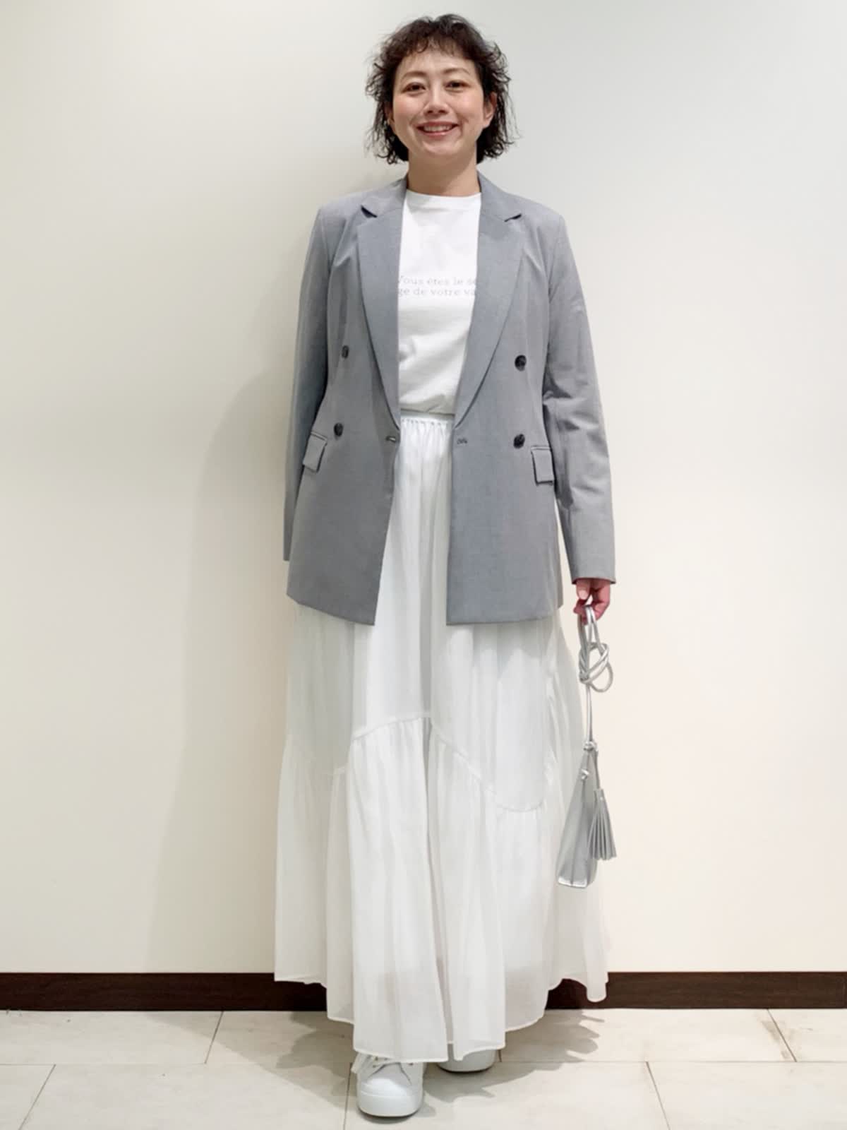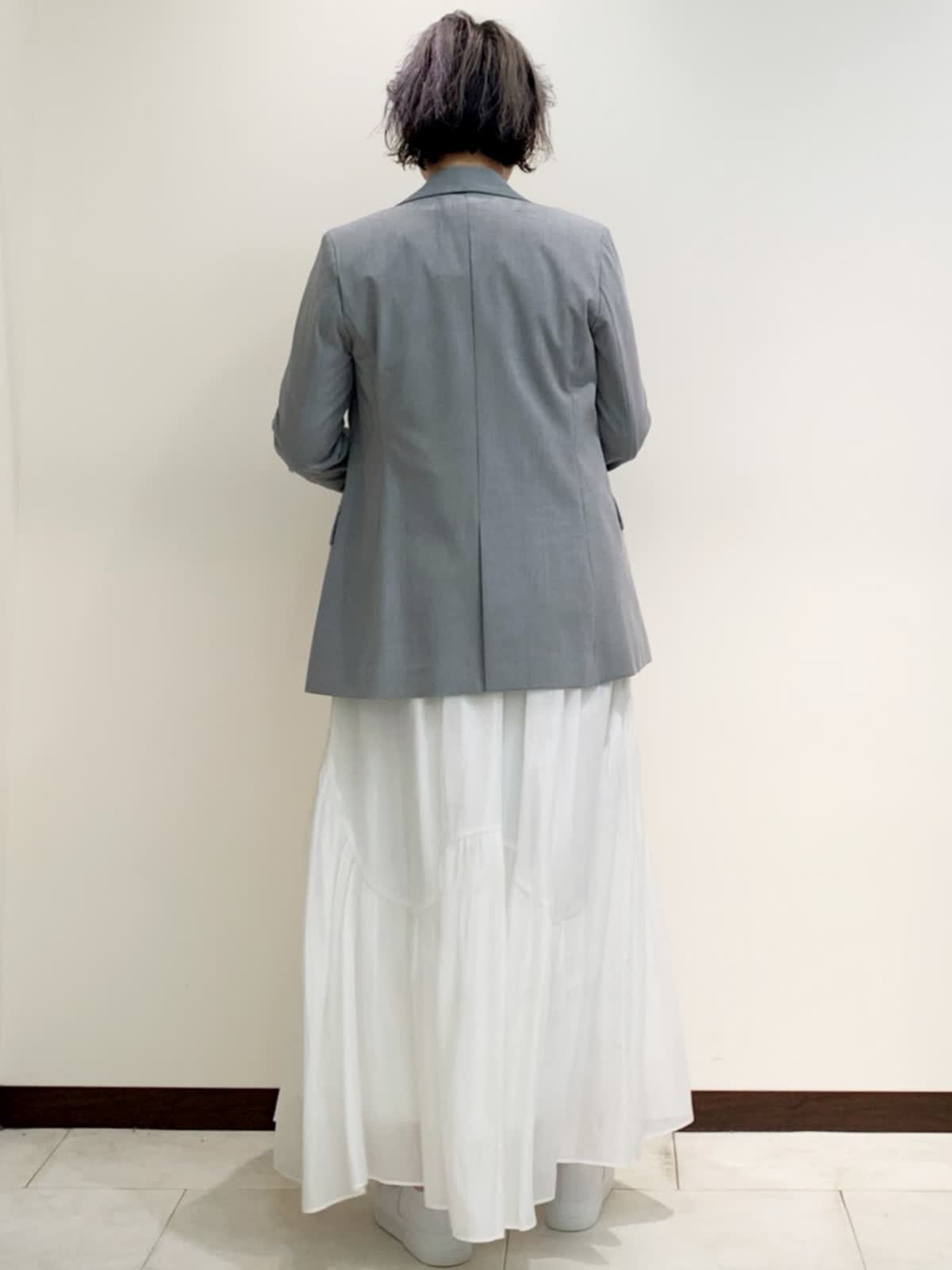 【着用サイズ】全て9号サイズ 【着用カラー】ジャケット:グレー カットソー・スカート:オフホワイト カーディガン感覚で使えるジャケットは、シワになりにくく軽さが特徴。たっぷりと生地を使っているスカートも軽くてはき心地がとてもいいので、デイリー使いがオススメです。