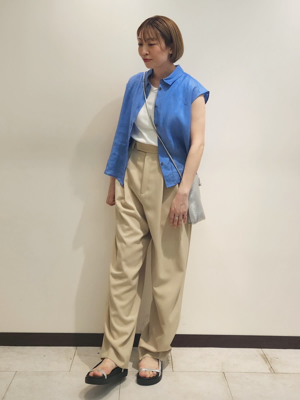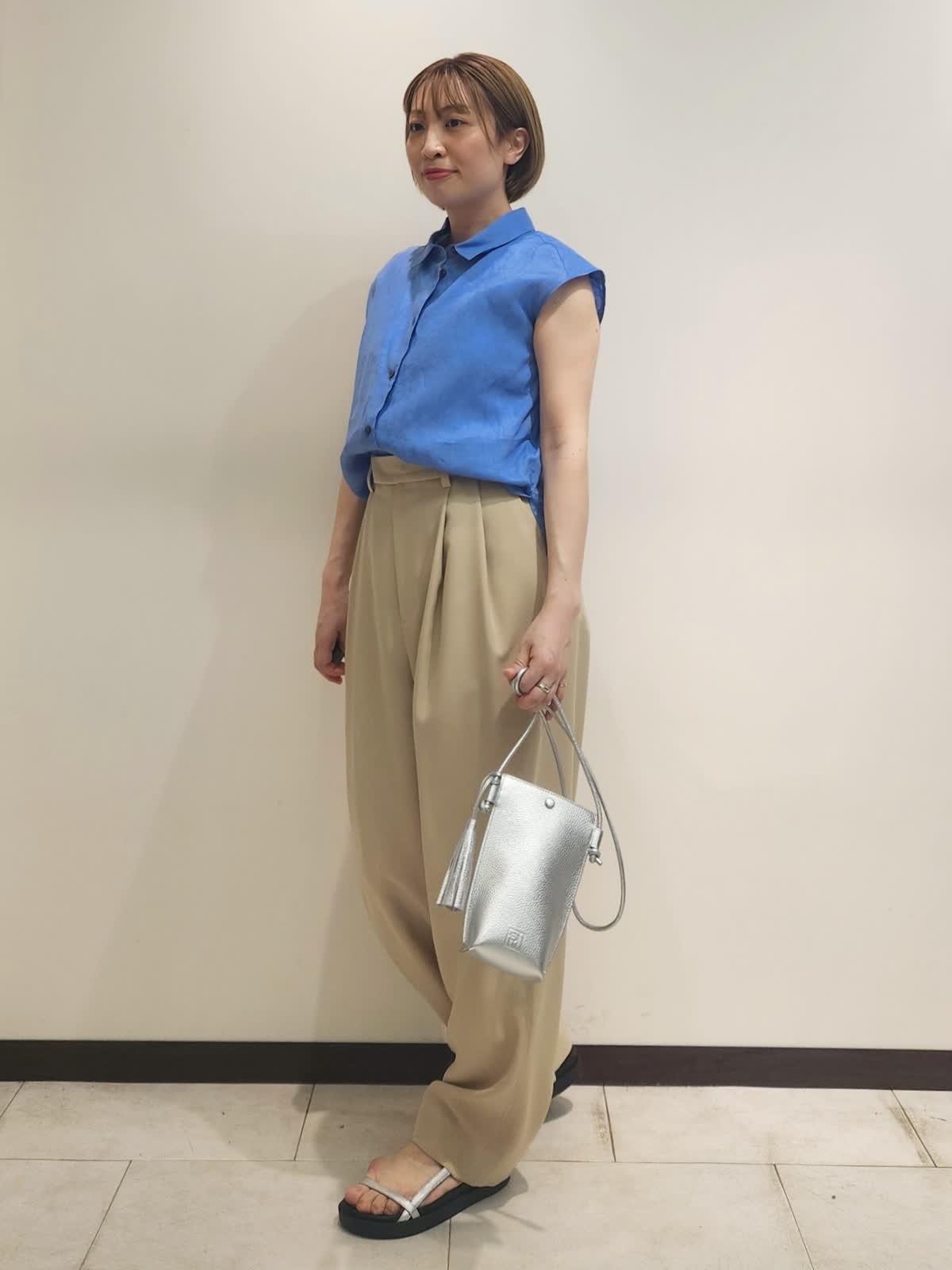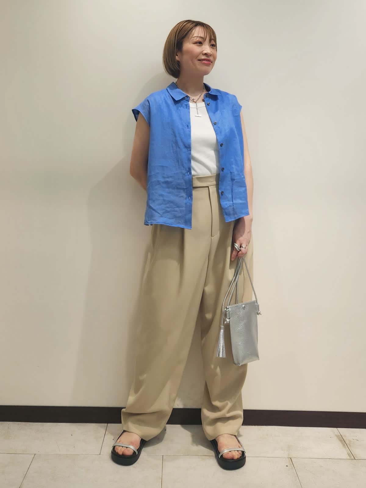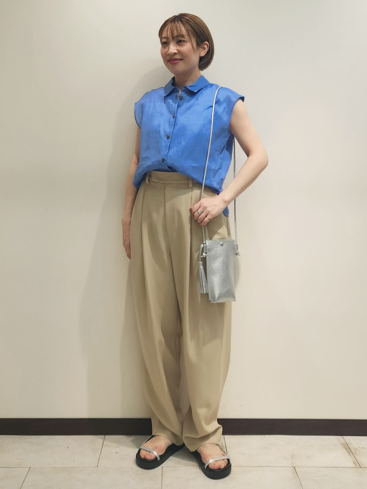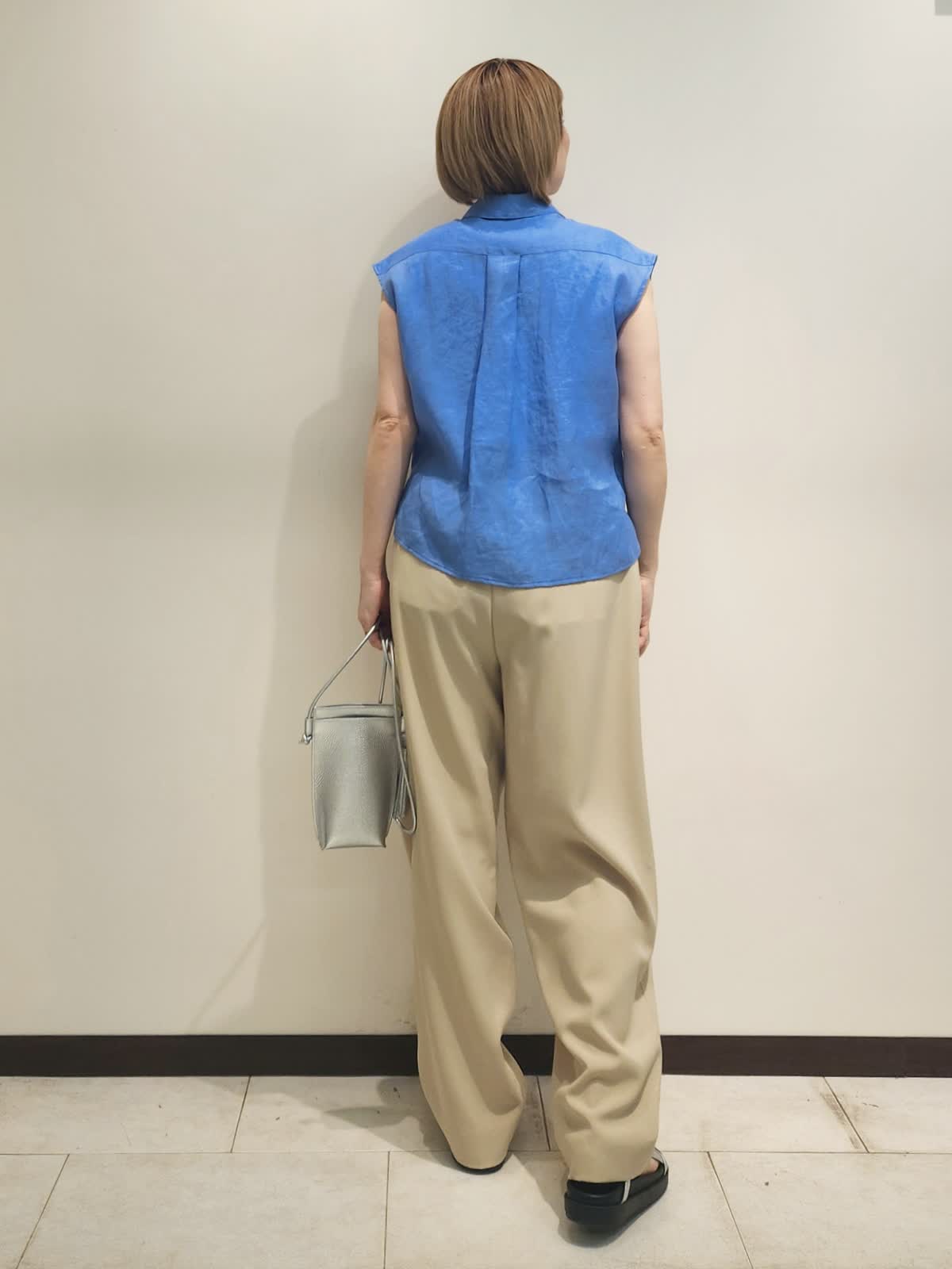 【着用サイズ】全て9号 【着用カラー】ブラウス:ブルー パンツ:ベージュ 三尋木さんコラボ コーディネート。 バレルパンツはカラーポイントにもなりますが色遊びも楽しめるベージュが魅力的。リネンの爽やかブルーを合わせました。ブラウスは羽織にもなるので活躍間違いなしです! 小物はシルバーでまとめカラーコーディネートを引き立てました。