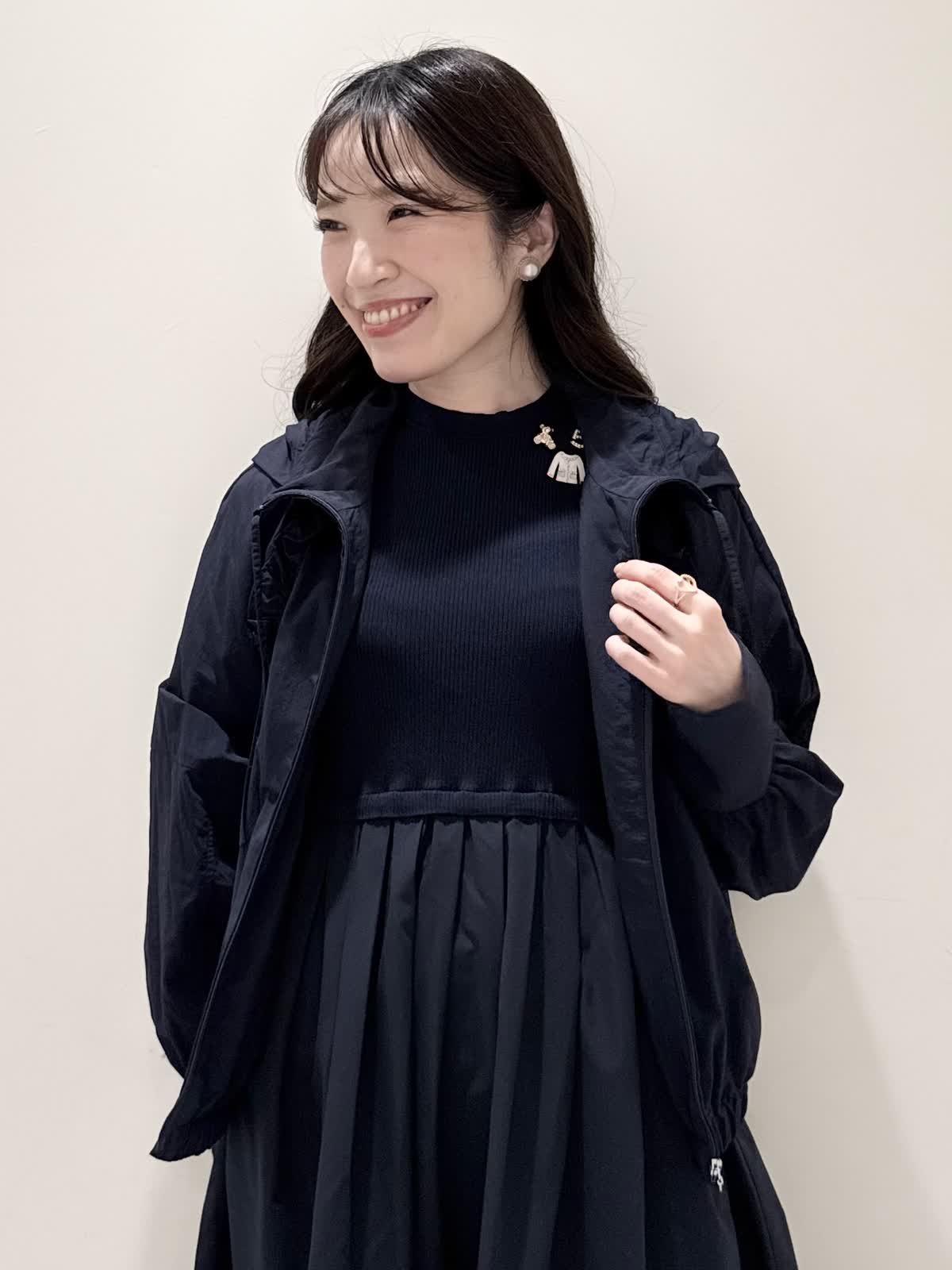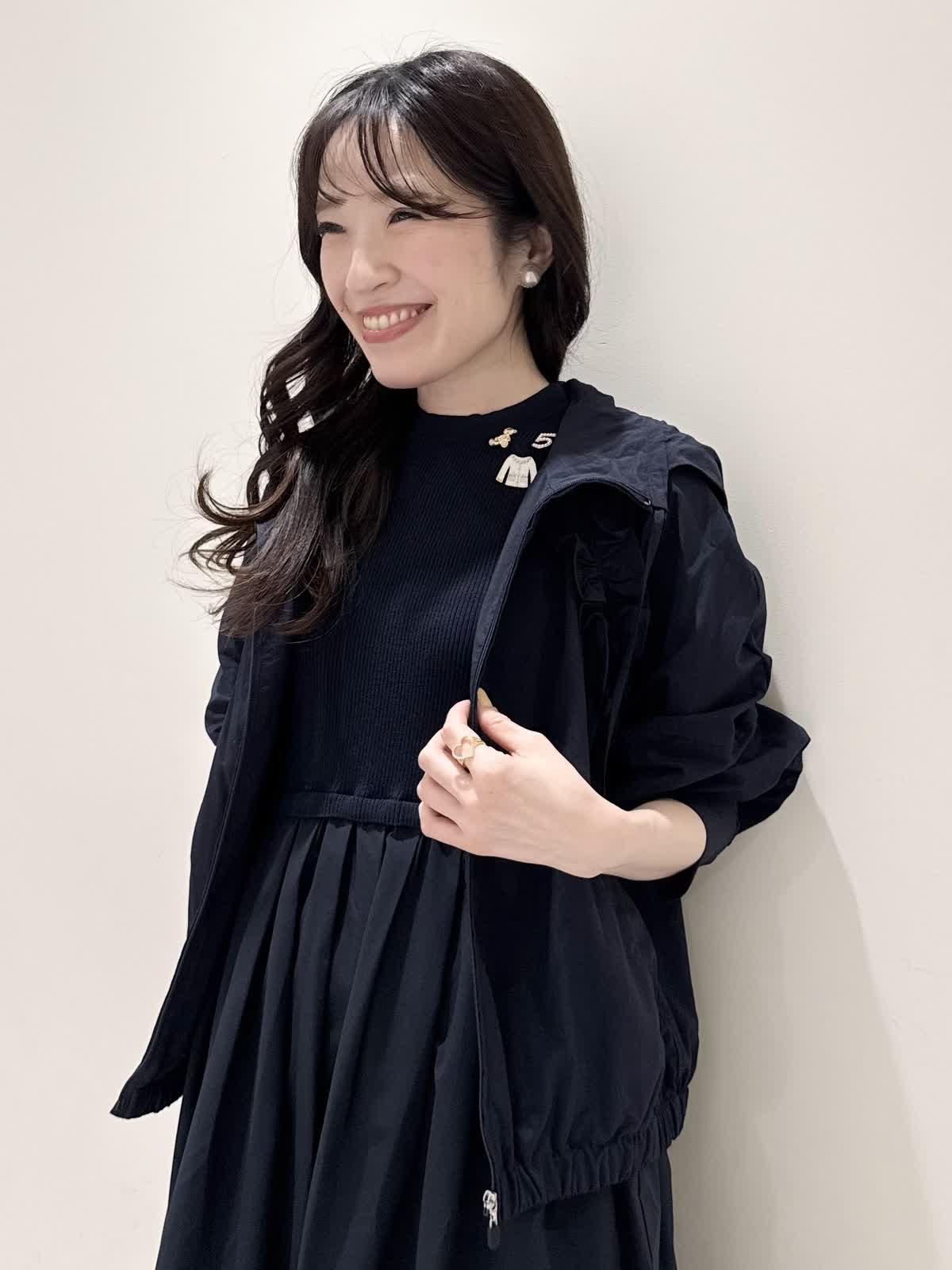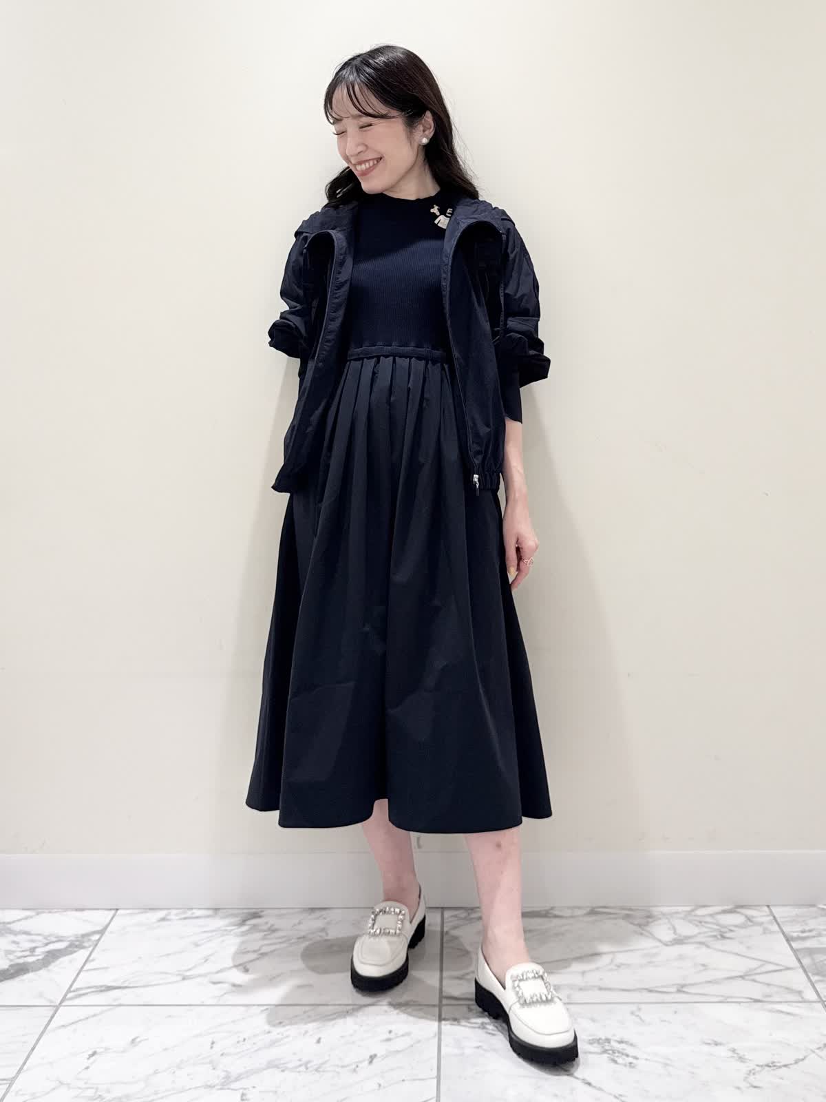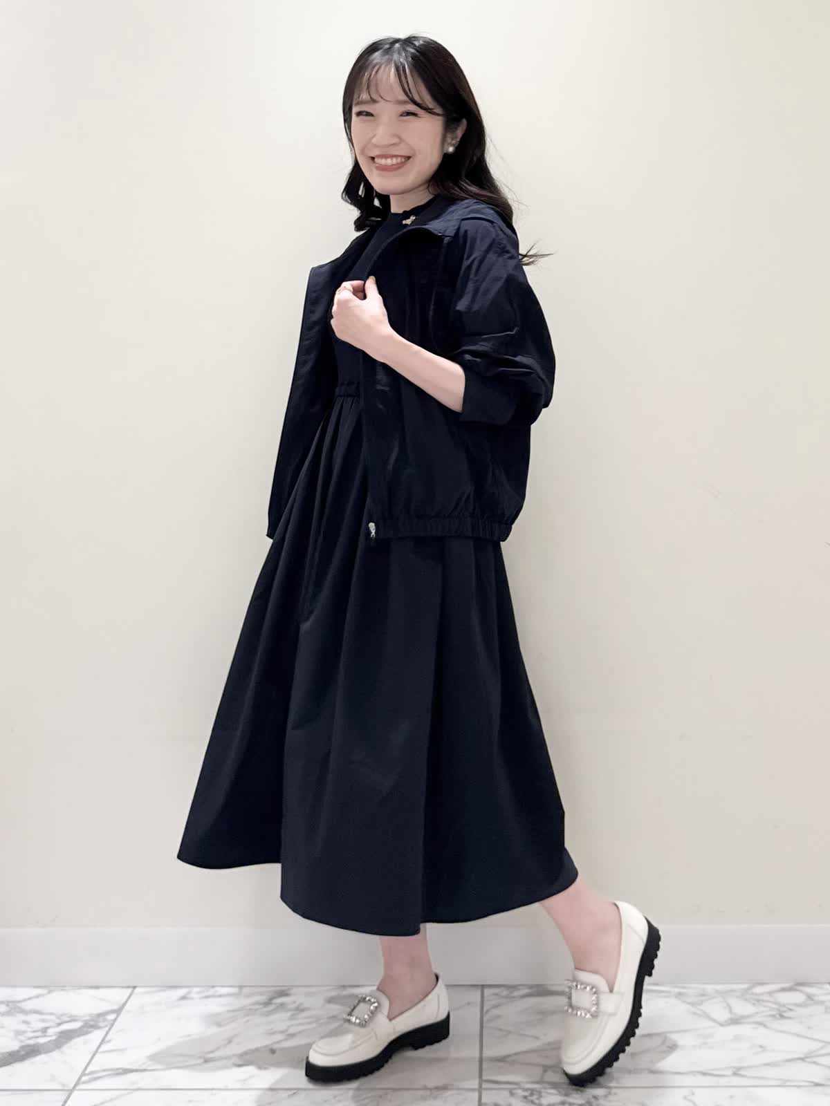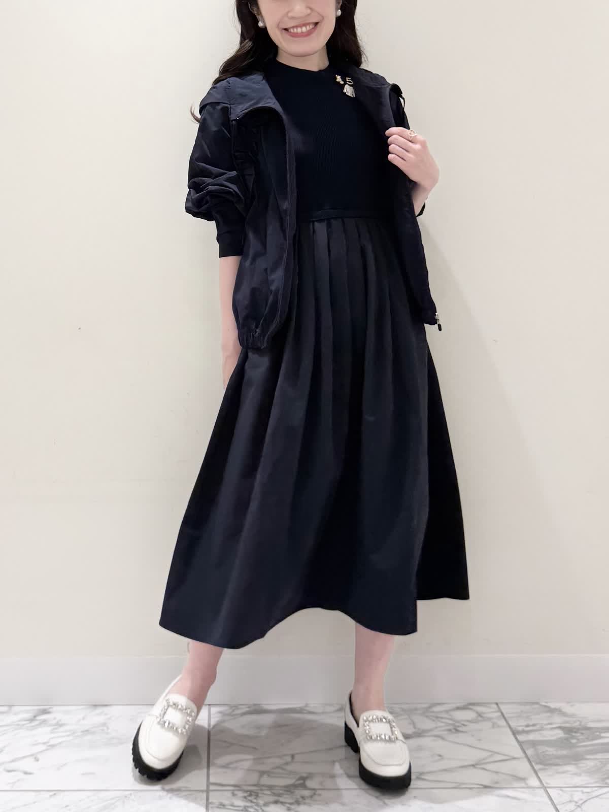 【着用サイズ/カラー】ワンピース:5号/ダークネイビー ブルゾン:7号/ネイビー カーディガン:7号/オフホワイト ローファー:24.0cm/オフホワイト WEB限定のドッキングワンピースのカジュアルコーディネート♪二の腕が隠れる嬉しい袖丈。リブニット部分がとってもサラサラと落ち感のある生地で伸縮性があるのでファスナーなしですが被りやすく、着やすいです。長い期間着られるドライタッチのリブニットなので、肌あたりも良く着心地抜群!ウエストの切り替え部分は今までにないくらい伸び感があり、食べ放題に行っても大丈夫なくらい身体のラインが出にくく窮屈感なく着られます。スカート部分は裏地なしでも透け感はなく、肌に纏わりつかないサラッとした生地。いつものサイズで大丈夫です。今回はカジュアルに大人気にラッシュガードブルゾンとローファーを合わせて可愛いカジュアルコーディネートにしました。羽織りを袖フリルのカーディガンすると綺麗めコーディネートで着ていただけます。