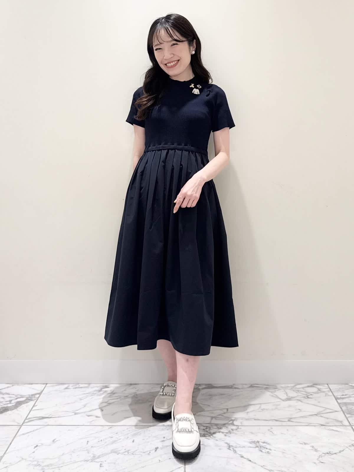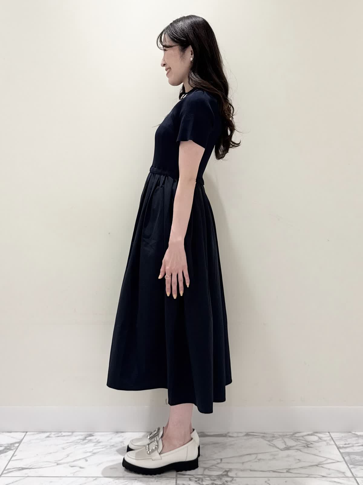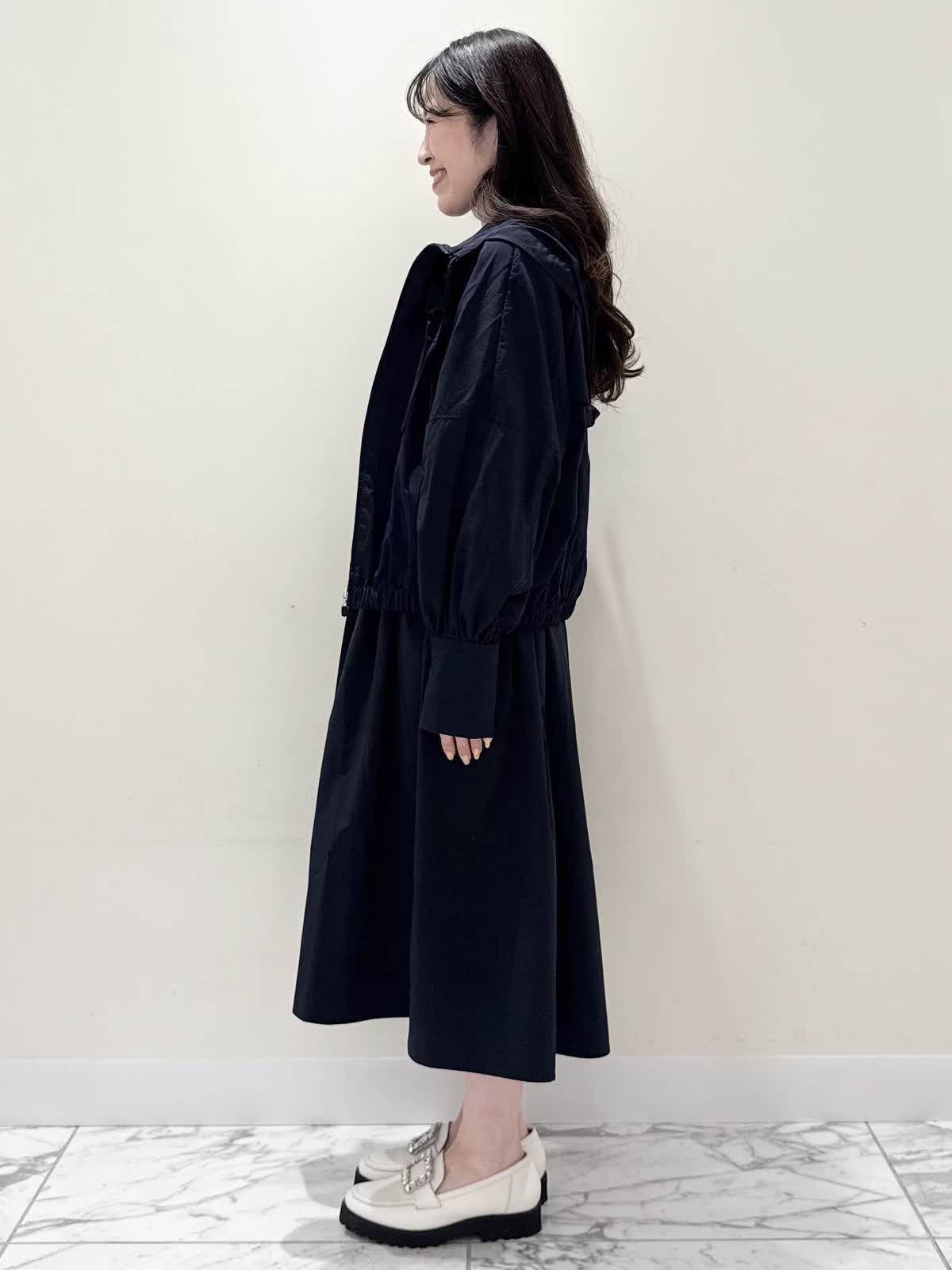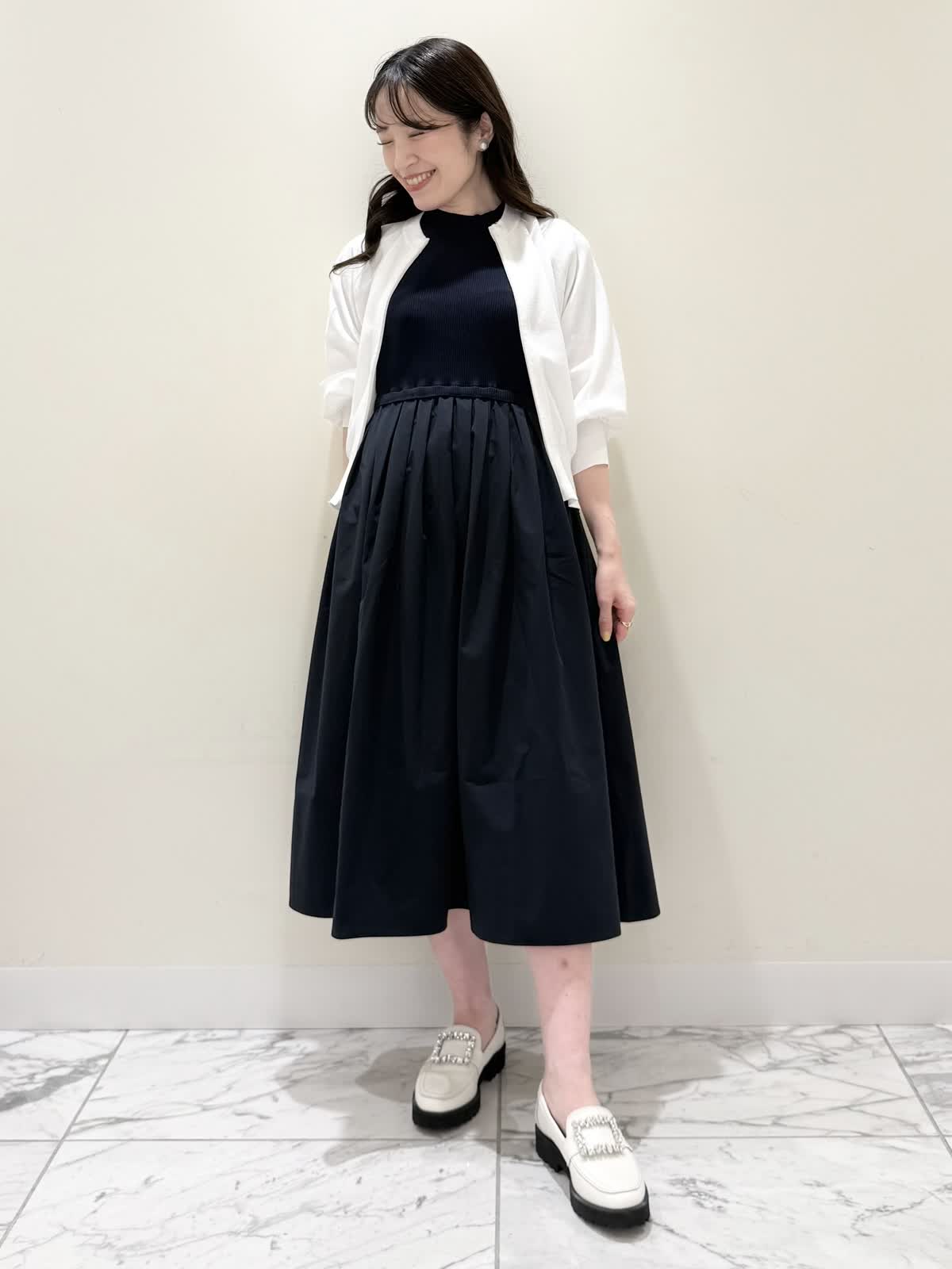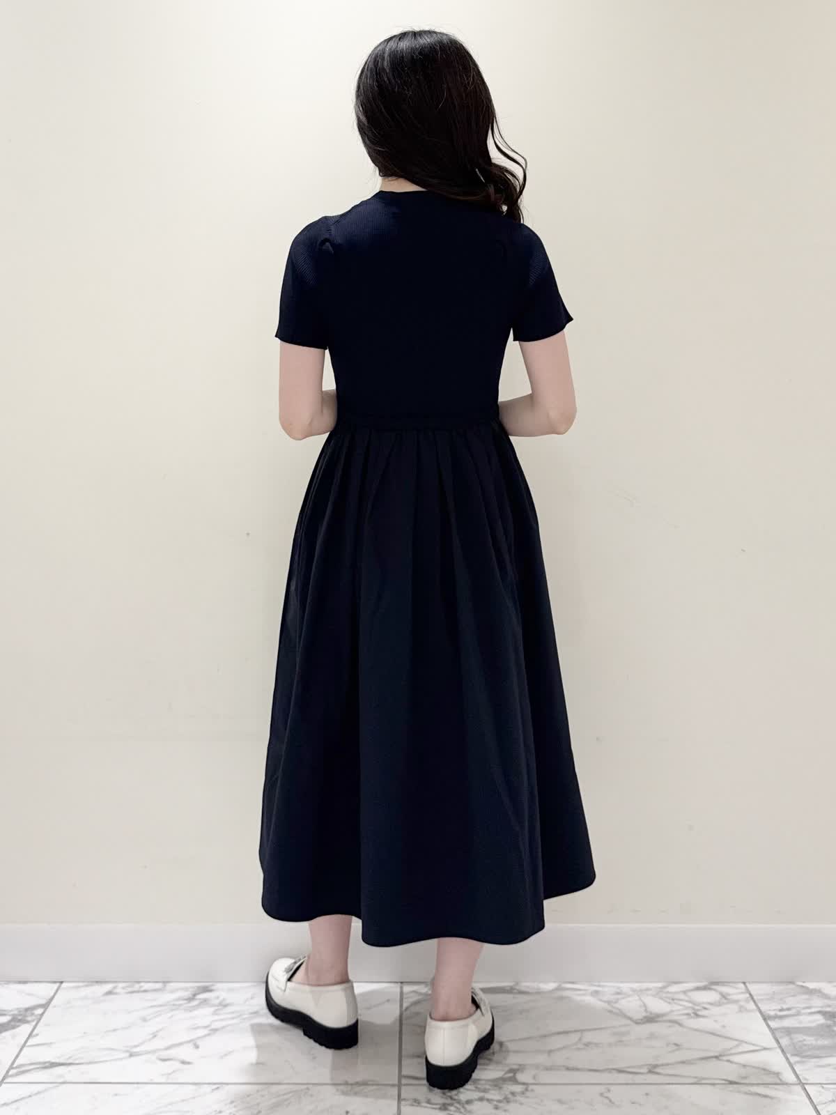 【着用サイズ/カラー】ワンピース:5号/ダークネイビー ブルゾン:7号/ネイビー カーディガン:7号/オフホワイト ローファー:24.0cm/オフホワイト WEB限定のドッキングワンピースのカジュアルコーディネート♪二の腕が隠れる嬉しい袖丈。リブニット部分がとってもサラサラと落ち感のある生地で伸縮性があるのでファスナーなしですが被りやすく、着やすいです。長い期間着られるドライタッチのリブニットなので、肌あたりも良く着心地抜群!ウエストの切り替え部分は今までにないくらい伸び感があり、食べ放題に行っても大丈夫なくらい身体のラインが出にくく窮屈感なく着られます。スカート部分は裏地なしでも透け感はなく、肌に纏わりつかないサラッとした生地。いつものサイズで大丈夫です。今回はカジュアルに大人気にラッシュガードブルゾンとローファーを合わせて可愛いカジュアルコーディネートにしました。羽織りを袖フリルのカーディガンすると綺麗めコーディネートで着ていただけます。