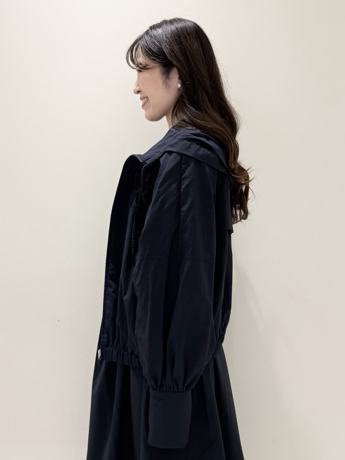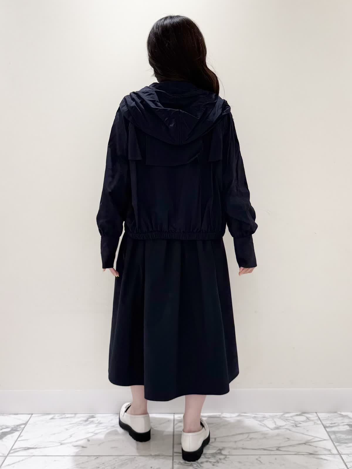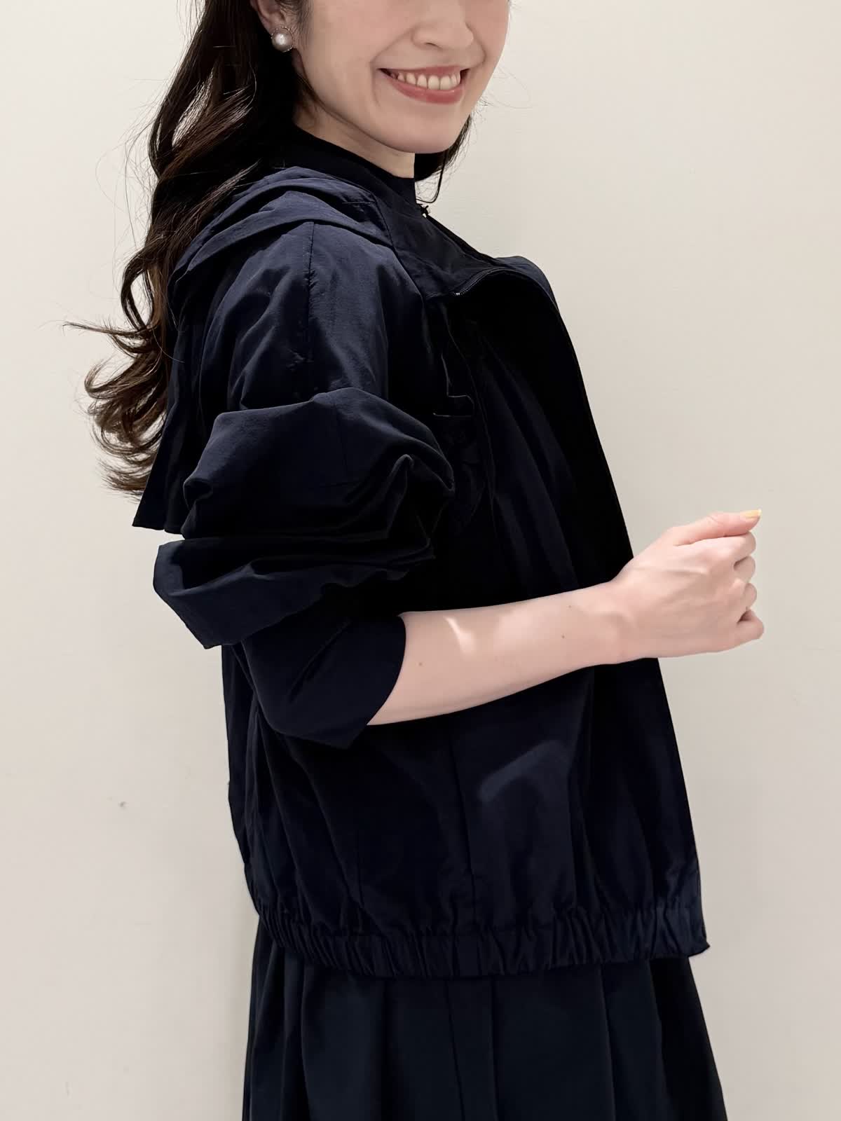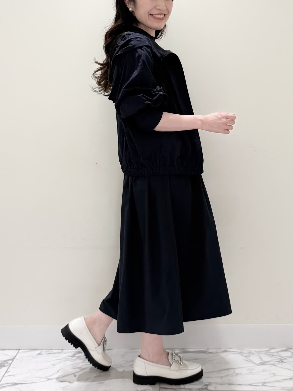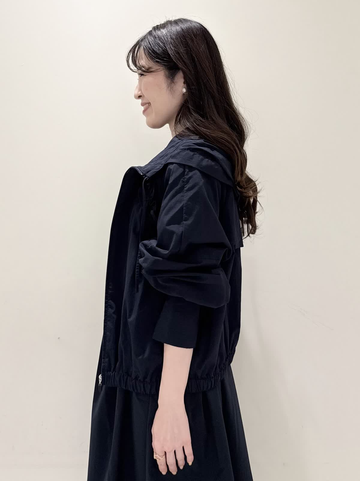 【着用サイズ/カラー】ワンピース:5号/ダークネイビー ブルゾン:7号/ネイビー カーディガン:7号/オフホワイト ローファー:24.0cm/オフホワイト WEB限定のドッキングワンピースのカジュアルコーディネート♪二の腕が隠れる嬉しい袖丈。リブニット部分がとってもサラサラと落ち感のある生地で伸縮性があるのでファスナーなしですが被りやすく、着やすいです。長い期間着られるドライタッチのリブニットなので、肌あたりも良く着心地抜群!ウエストの切り替え部分は今までにないくらい伸び感があり、食べ放題に行っても大丈夫なくらい身体のラインが出にくく窮屈感なく着られます。スカート部分は裏地なしでも透け感はなく、肌に纏わりつかないサラッとした生地。いつものサイズで大丈夫です。今回はカジュアルに大人気にラッシュガードブルゾンとローファーを合わせて可愛いカジュアルコーディネートにしました。羽織りを袖フリルのカーディガンすると綺麗めコーディネートで着ていただけます。