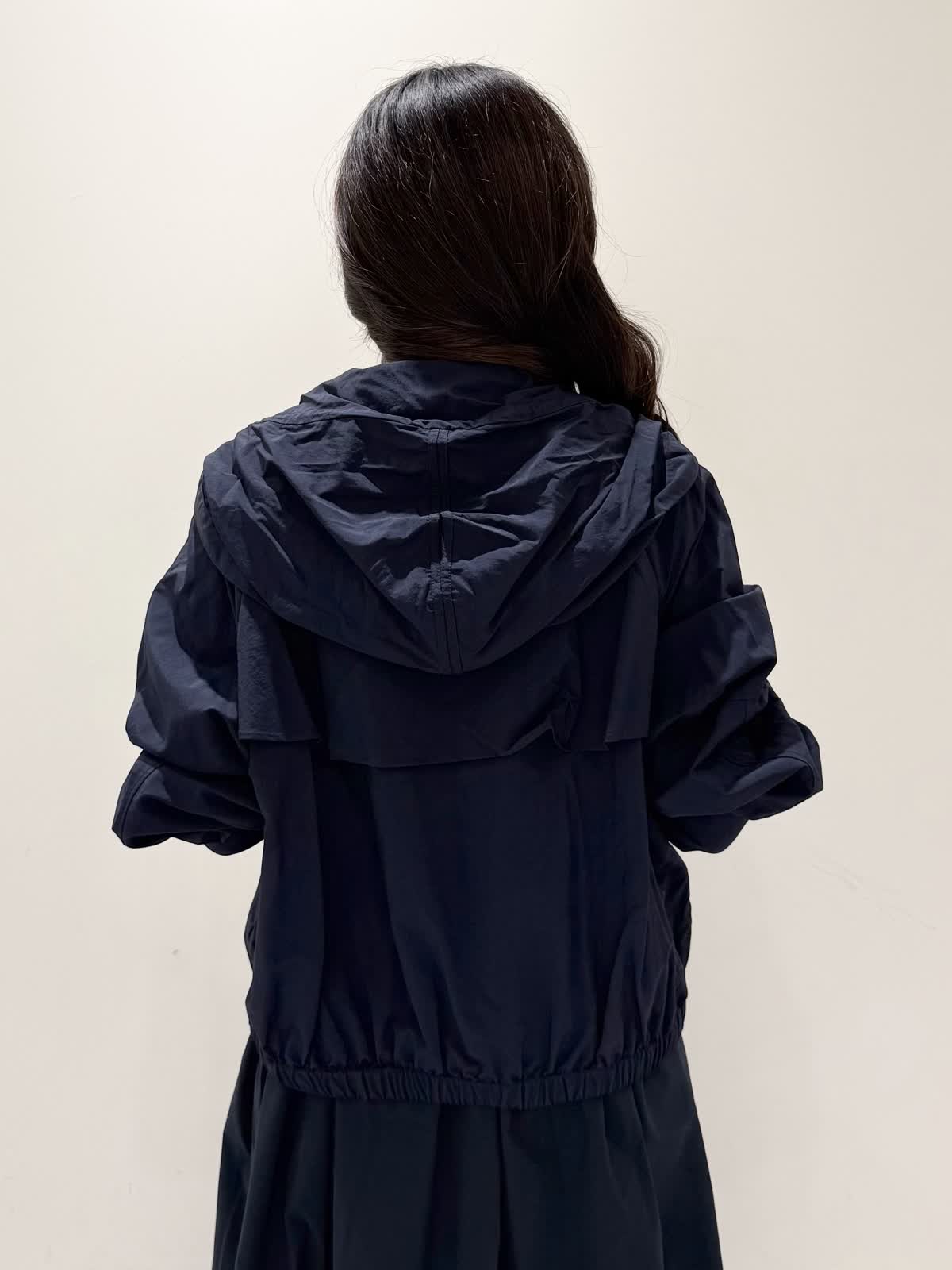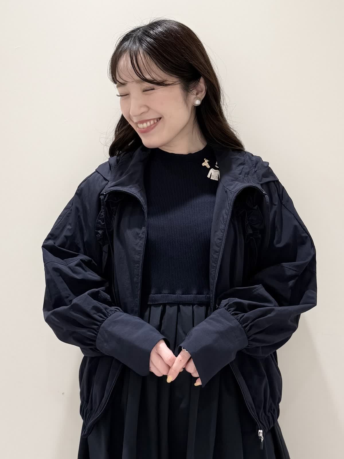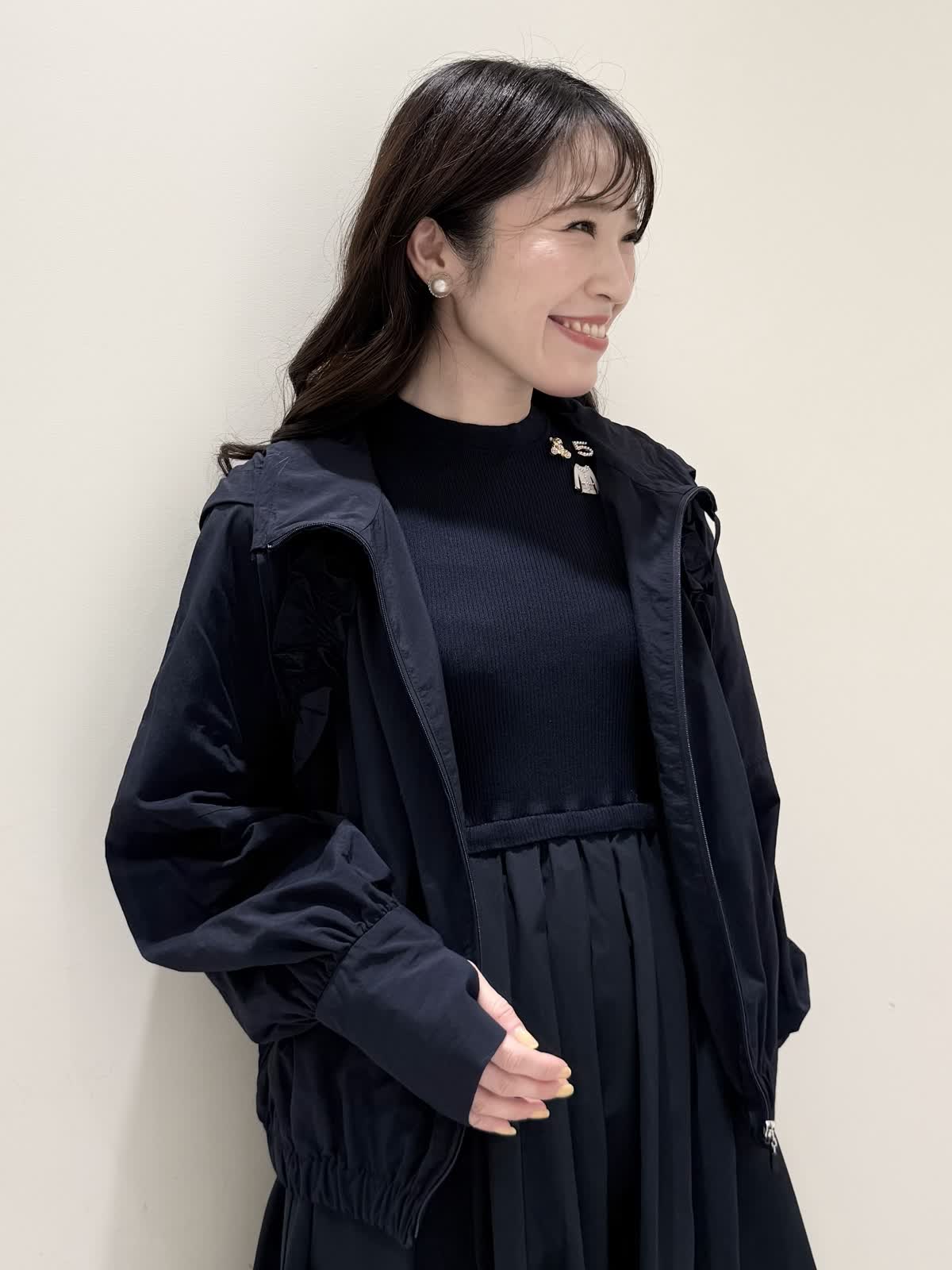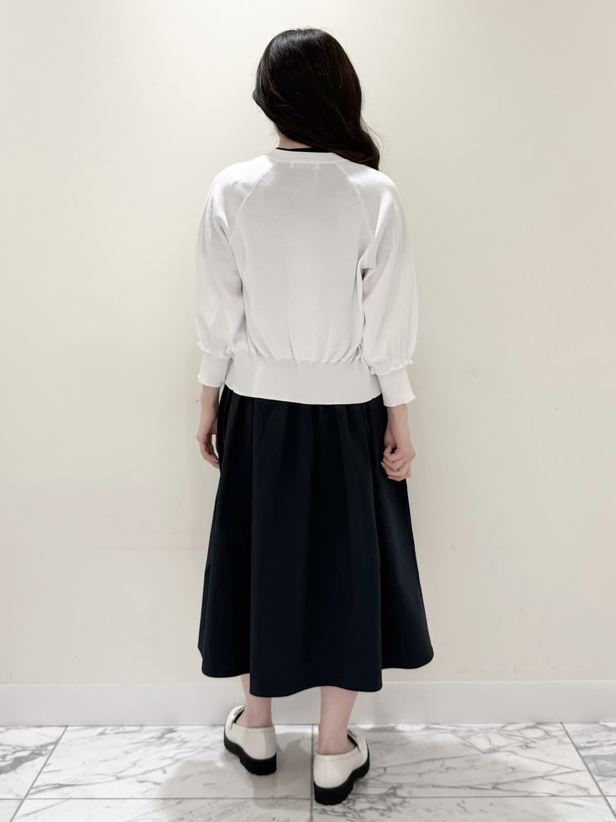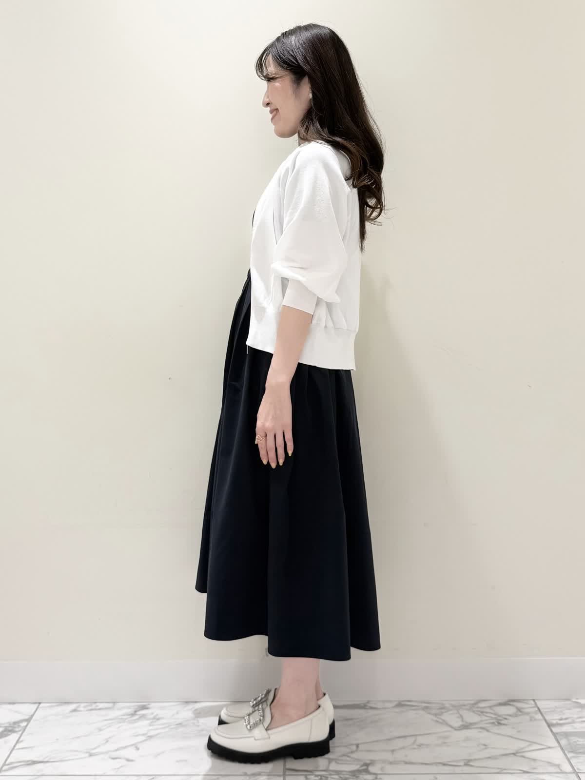 【着用サイズ/カラー】ワンピース:5号/ダークネイビー ブルゾン:7号/ネイビー カーディガン:7号/オフホワイト ローファー:24.0cm/オフホワイト WEB限定のドッキングワンピースのカジュアルコーディネート♪二の腕が隠れる嬉しい袖丈。リブニット部分がとってもサラサラと落ち感のある生地で伸縮性があるのでファスナーなしですが被りやすく、着やすいです。長い期間着られるドライタッチのリブニットなので、肌あたりも良く着心地抜群!ウエストの切り替え部分は今までにないくらい伸び感があり、食べ放題に行っても大丈夫なくらい身体のラインが出にくく窮屈感なく着られます。スカート部分は裏地なしでも透け感はなく、肌に纏わりつかないサラッとした生地。いつものサイズで大丈夫です。今回はカジュアルに大人気にラッシュガードブルゾンとローファーを合わせて可愛いカジュアルコーディネートにしました。羽織りを袖フリルのカーディガンすると綺麗めコーディネートで着ていただけます。
