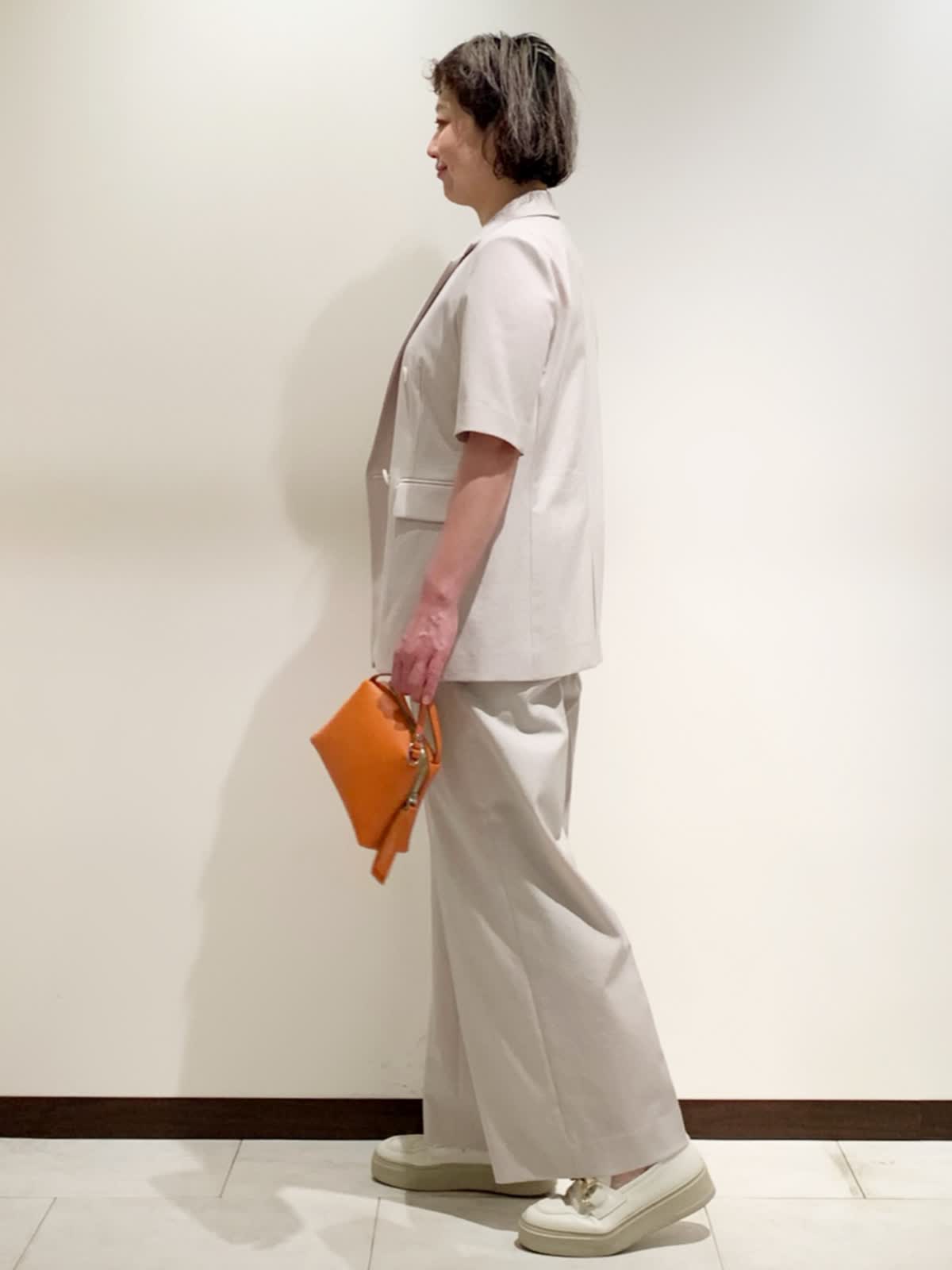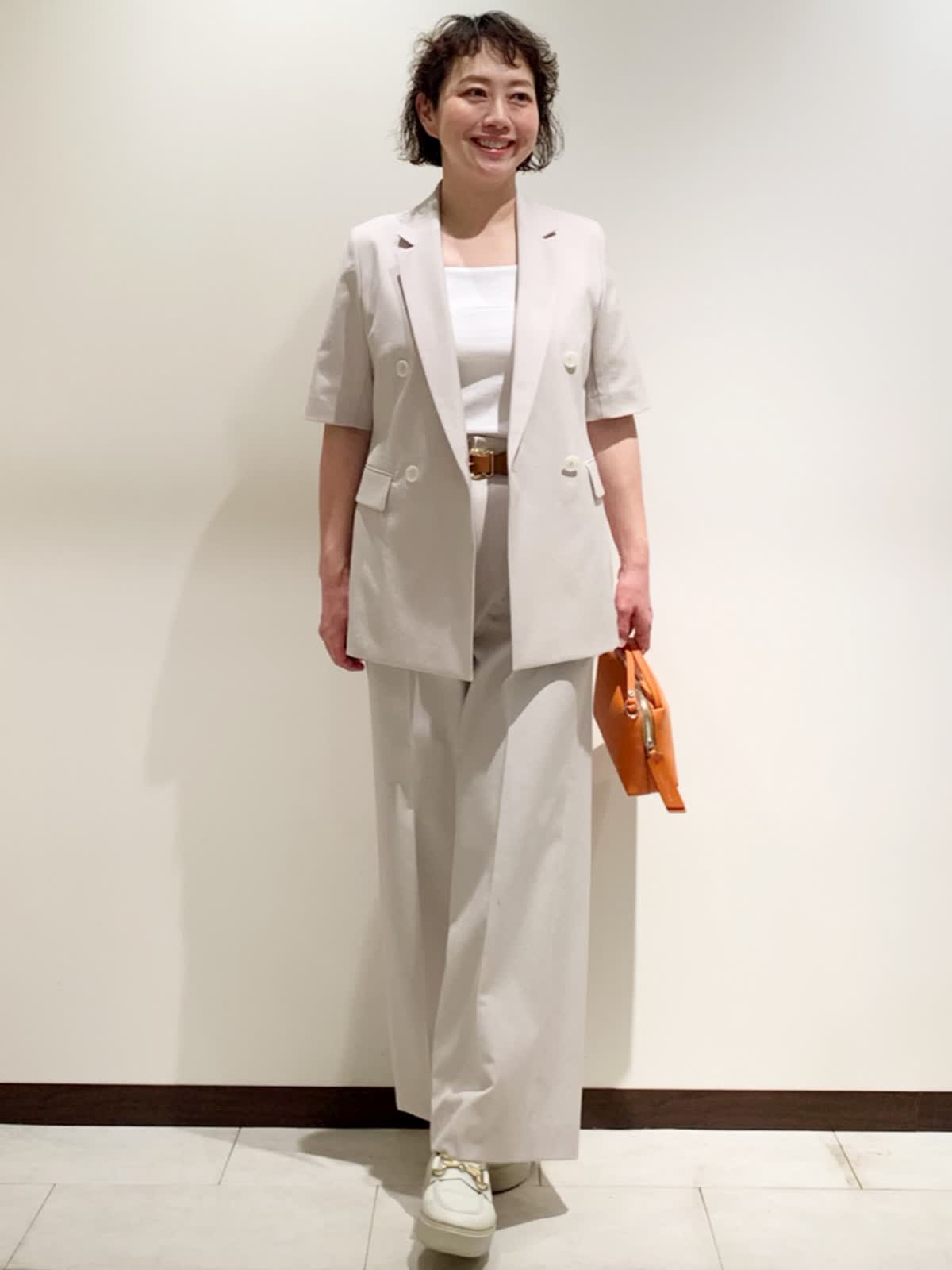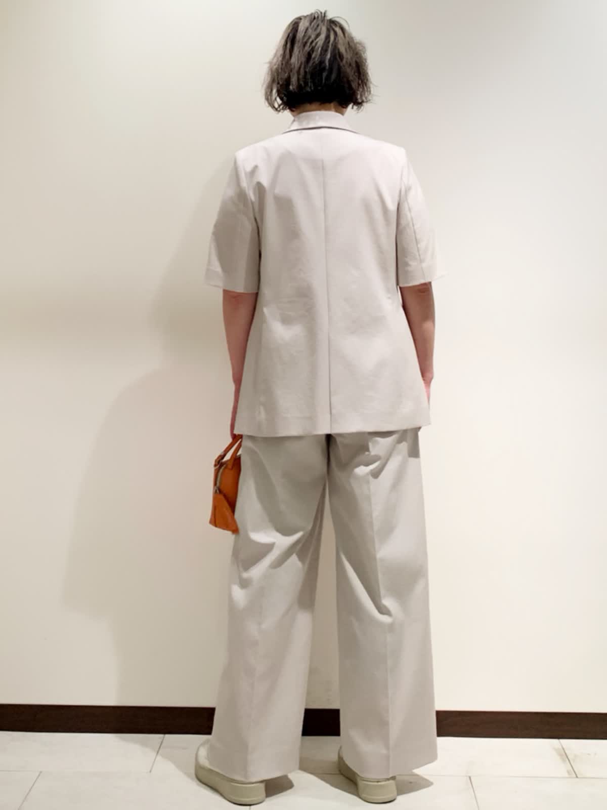 【着用サイズ】ジャケット・パンツ:9号サイズ キャミソール:11号サイズ 【着用カラー】ジャケット・パンツ:ベージュ キャミソール:ホワイト 二の腕を上手にカバーしてくれてドライタッチなので、これから暑くなる季節にピッタリのジャケット。 セットアップはもちろんですが、単品コーディネートにも使いやすい万能アイテムです。