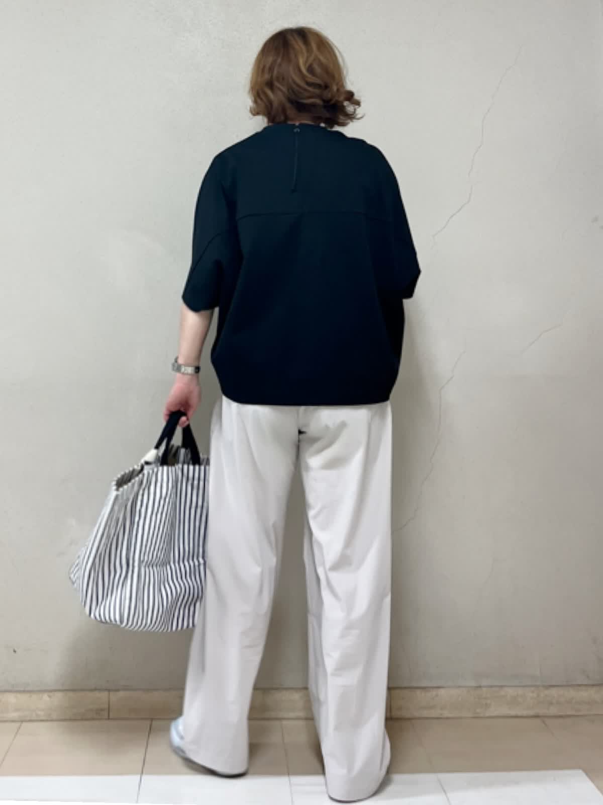 休日のショッピングにおすすめのコーディネートです。丸みのある立体的なシルエットがきれいなカットソーです。一枚で様になるデザインです。後ろのジップがポイントです。カジュアルにも着れてまたスカートを合わせたきれいめスタイリングでも素敵に着ていただくことが出来ます。パンツは程良い光沢があります。リラックスして穿けるワイドシルエットです。ワンピースなどと合わせたレイヤードスタイリングにも合わせやすいです。
