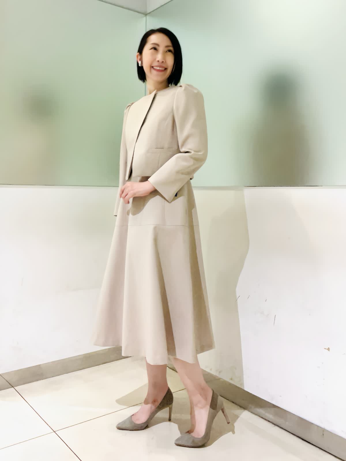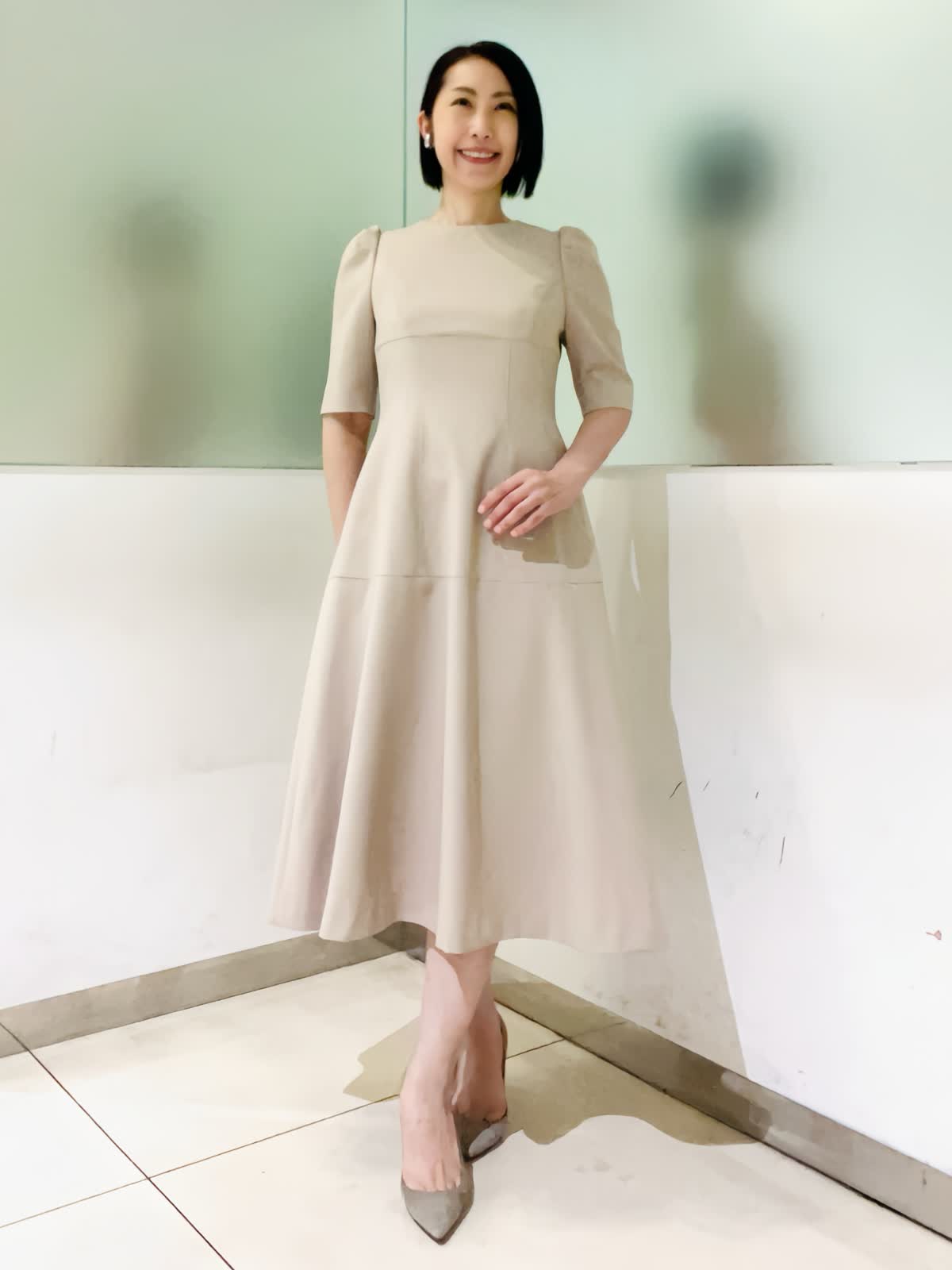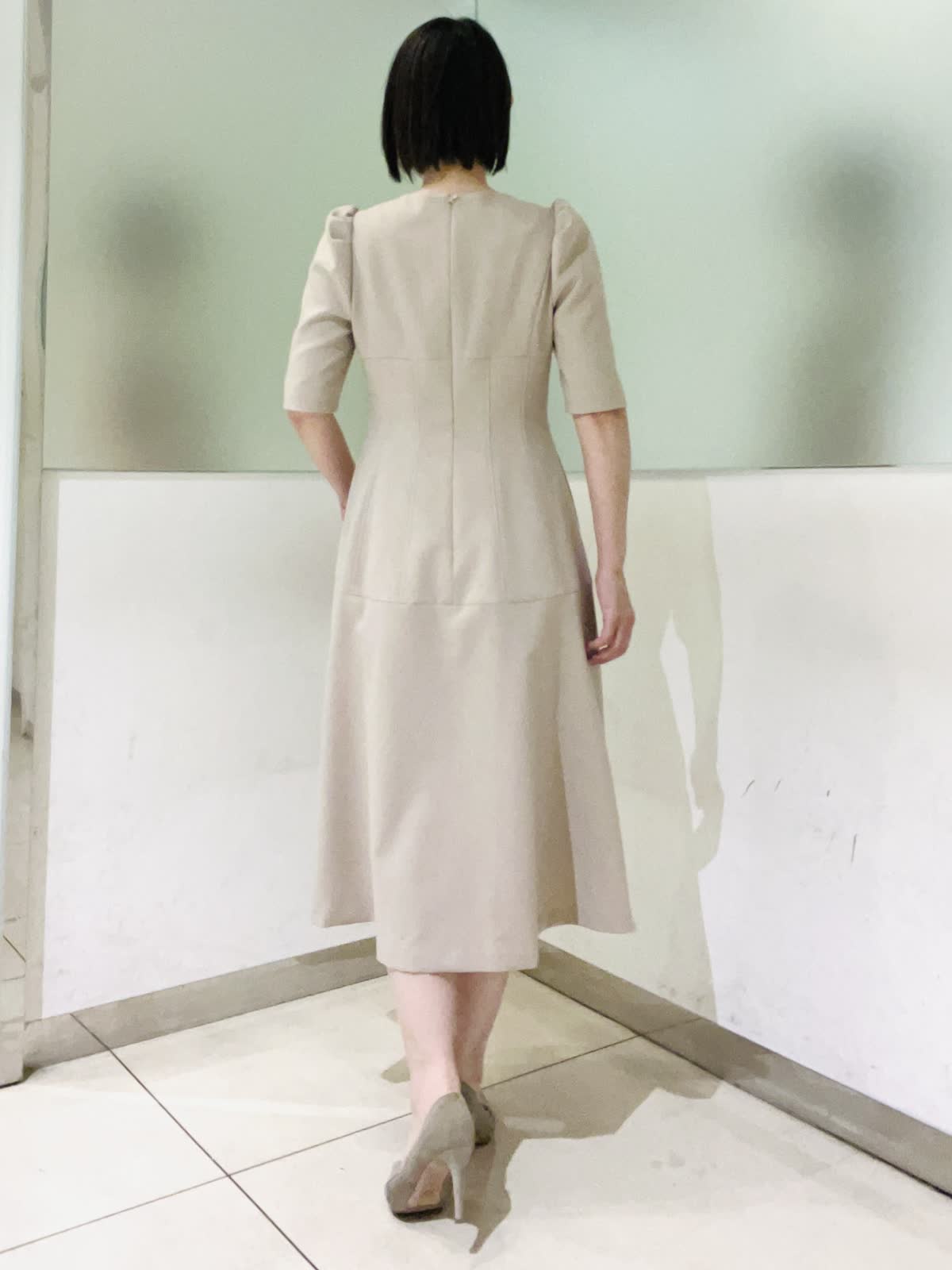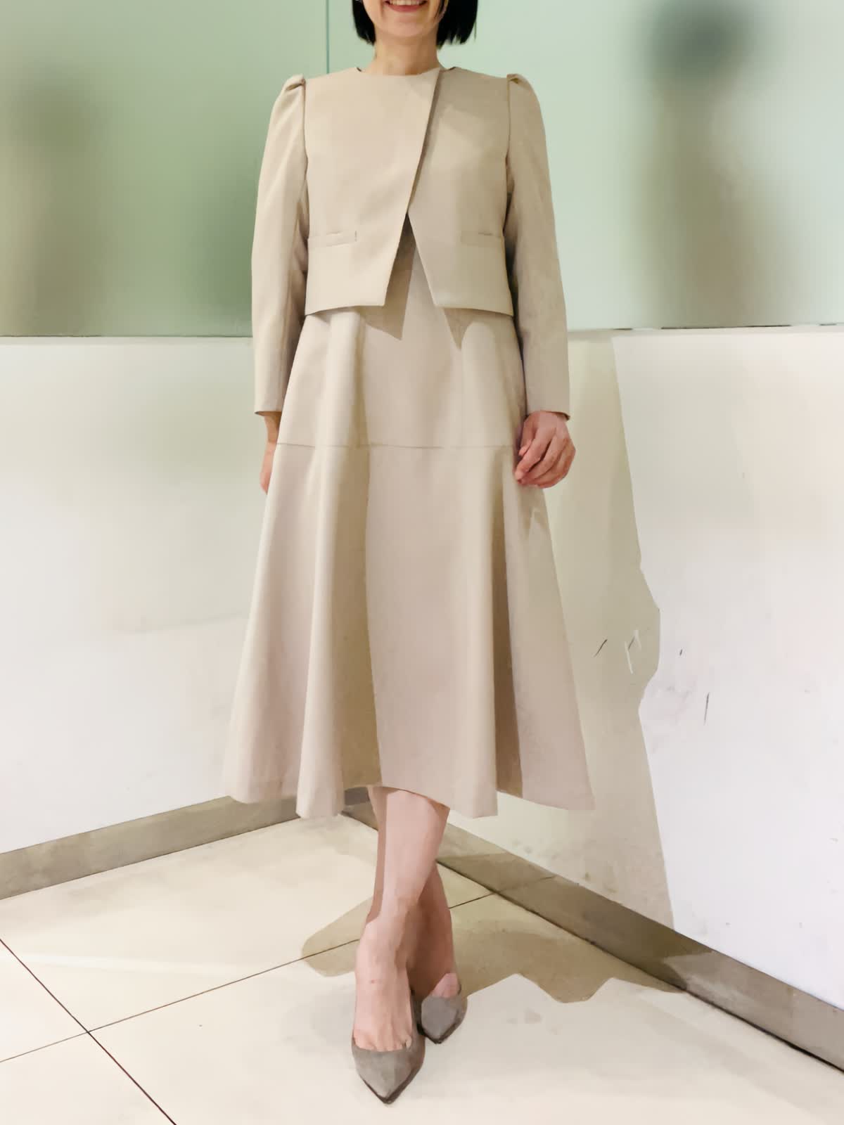【着用アイテム/カラー】ジャケット、ワンピース:9号/ベージュ フォーマルからちょっとしたお呼ばれまで着られるきちんと感のあるジャケットとワンピースのコーディネート。コンパクトなシルエットのジャケットは女性らしさもありながら、アシンメトリーなデザインがシャープな雰囲気もあるので、ワンピースはもちろんパンツ合わせにもおすすめ。ワンピースは二の腕が隠れる袖丈で、かつ華奢見えするシルエット。広がり過ぎないフレアラインが大人も安心して着られるデザインです。