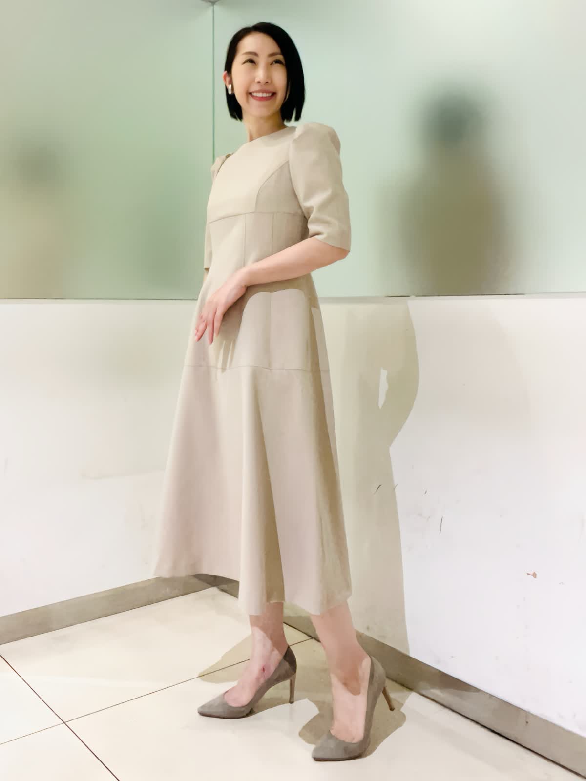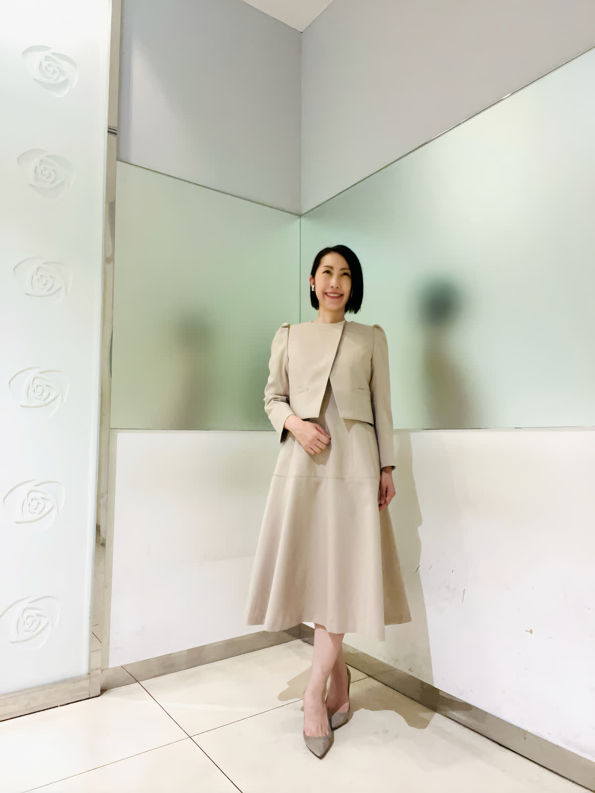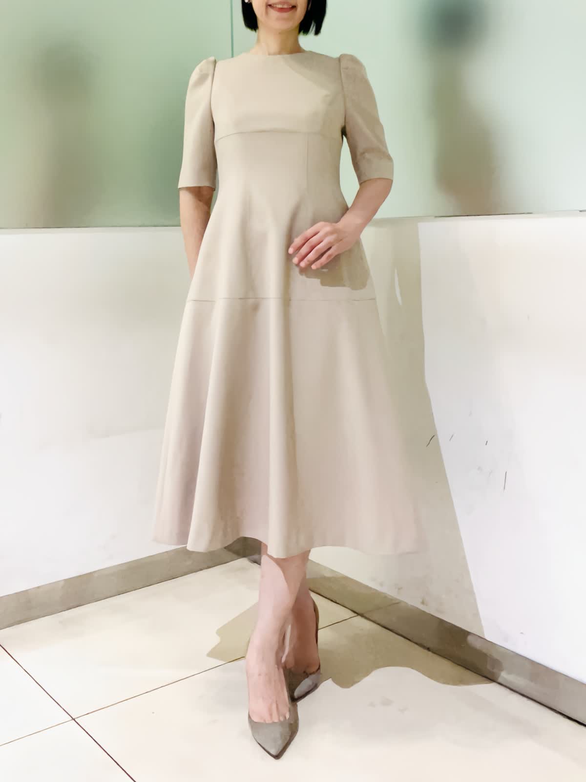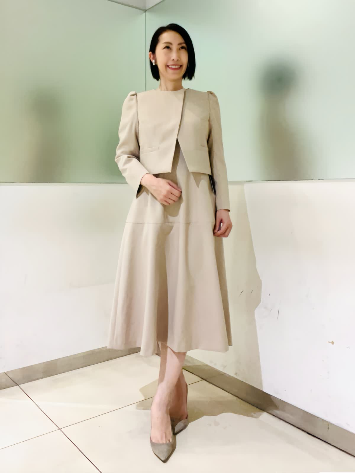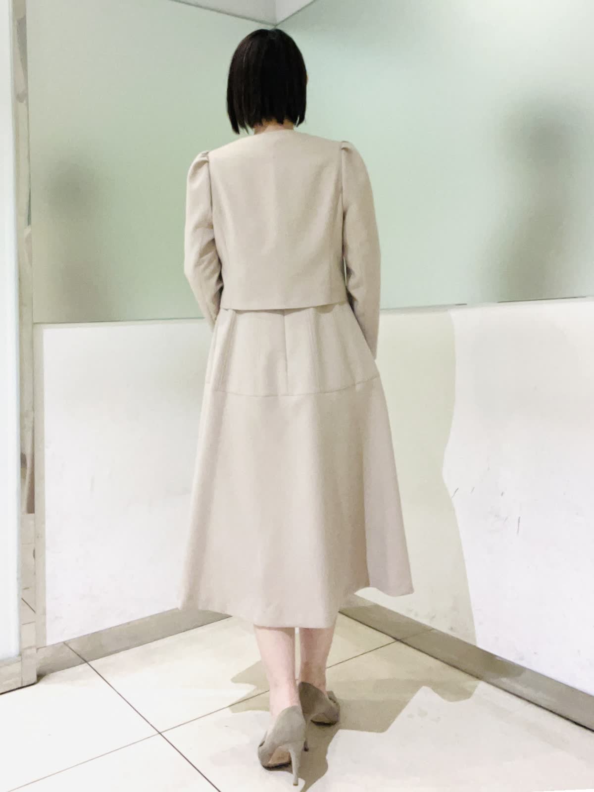【着用アイテム/カラー】ジャケット、ワンピース:9号/ベージュ フォーマルからちょっとしたお呼ばれまで着られるきちんと感のあるジャケットとワンピースのコーディネート。コンパクトなシルエットのジャケットは女性らしさもありながら、アシンメトリーなデザインがシャープな雰囲気もあるので、ワンピースはもちろんパンツ合わせにもおすすめ。ワンピースは二の腕が隠れる袖丈で、かつ華奢見えするシルエット。広がり過ぎないフレアラインが大人も安心して着られるデザインです。