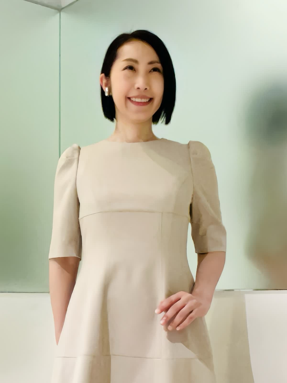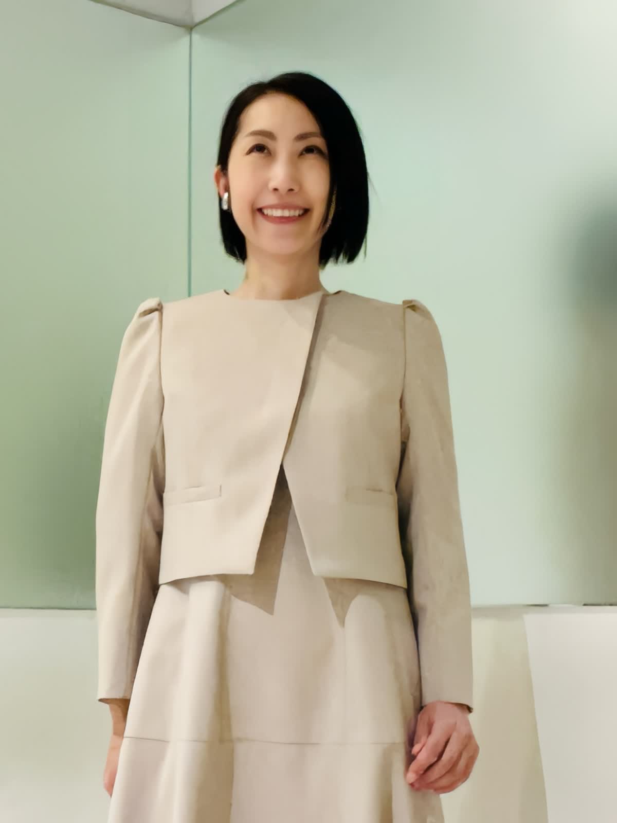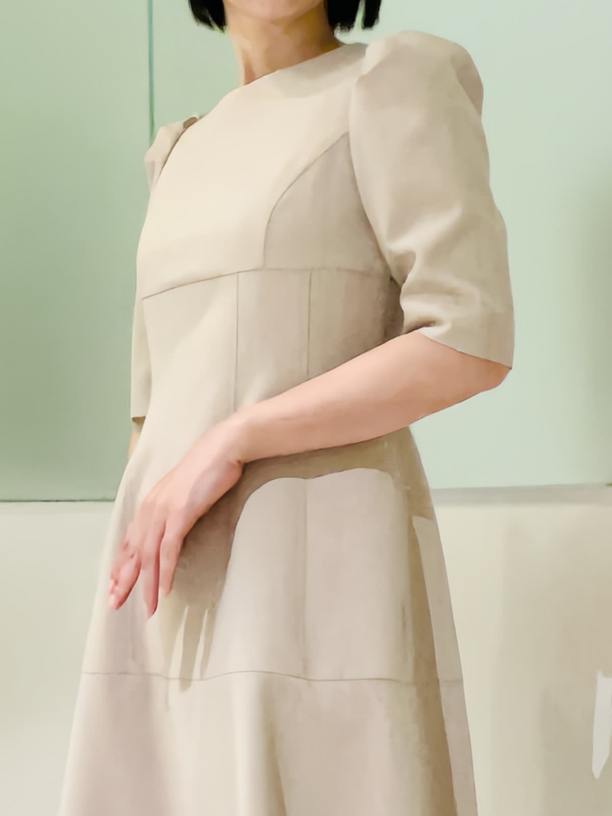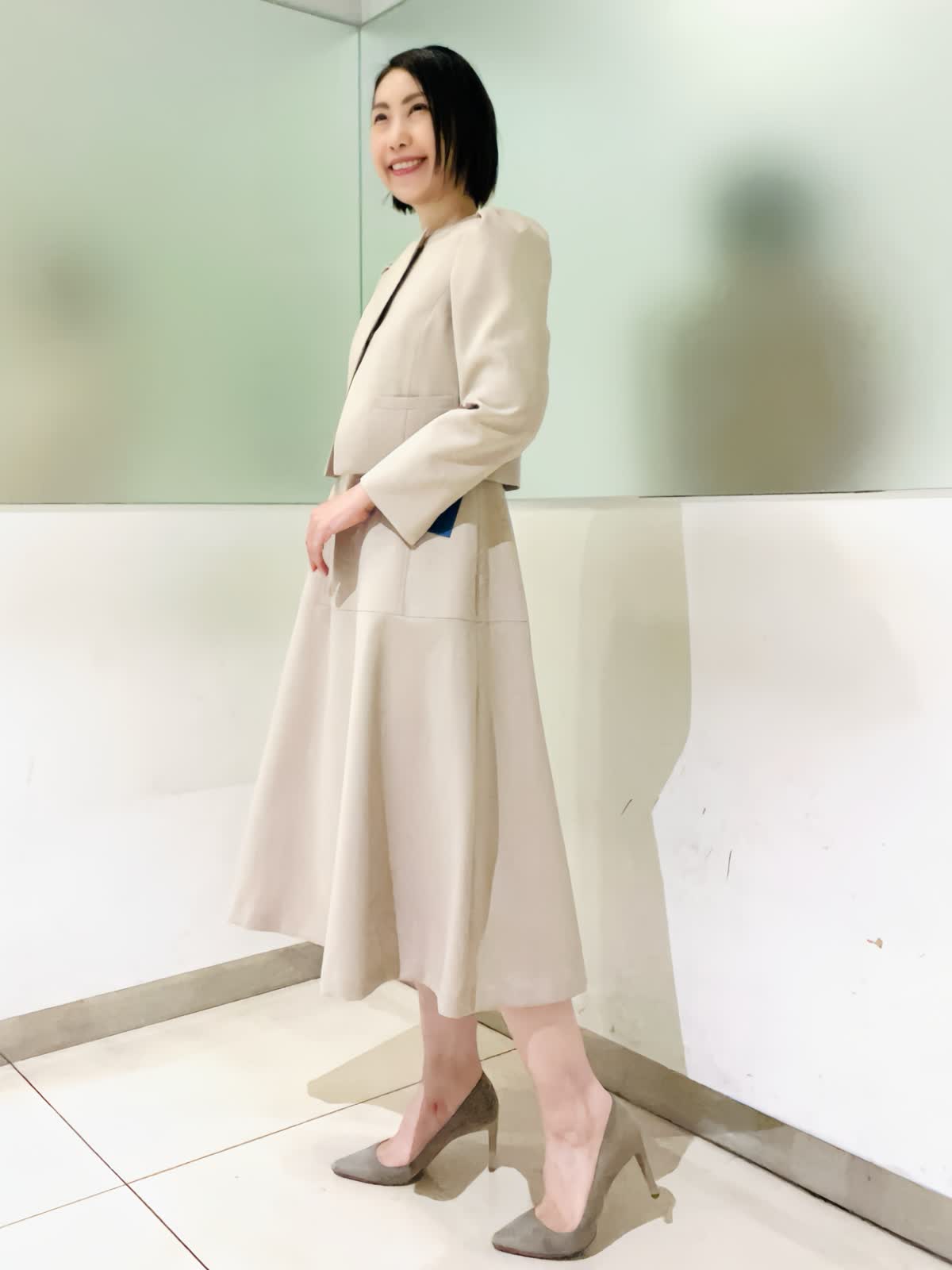 【着用アイテム/カラー】ジャケット、ワンピース:9号/ベージュ フォーマルからちょっとしたお呼ばれまで着られるきちんと感のあるジャケットとワンピースのコーディネート。コンパクトなシルエットのジャケットは女性らしさもありながら、アシンメトリーなデザインがシャープな雰囲気もあるので、ワンピースはもちろんパンツ合わせにもおすすめ。ワンピースは二の腕が隠れる袖丈で、かつ華奢見えするシルエット。広がり過ぎないフレアラインが大人も安心して着られるデザインです。