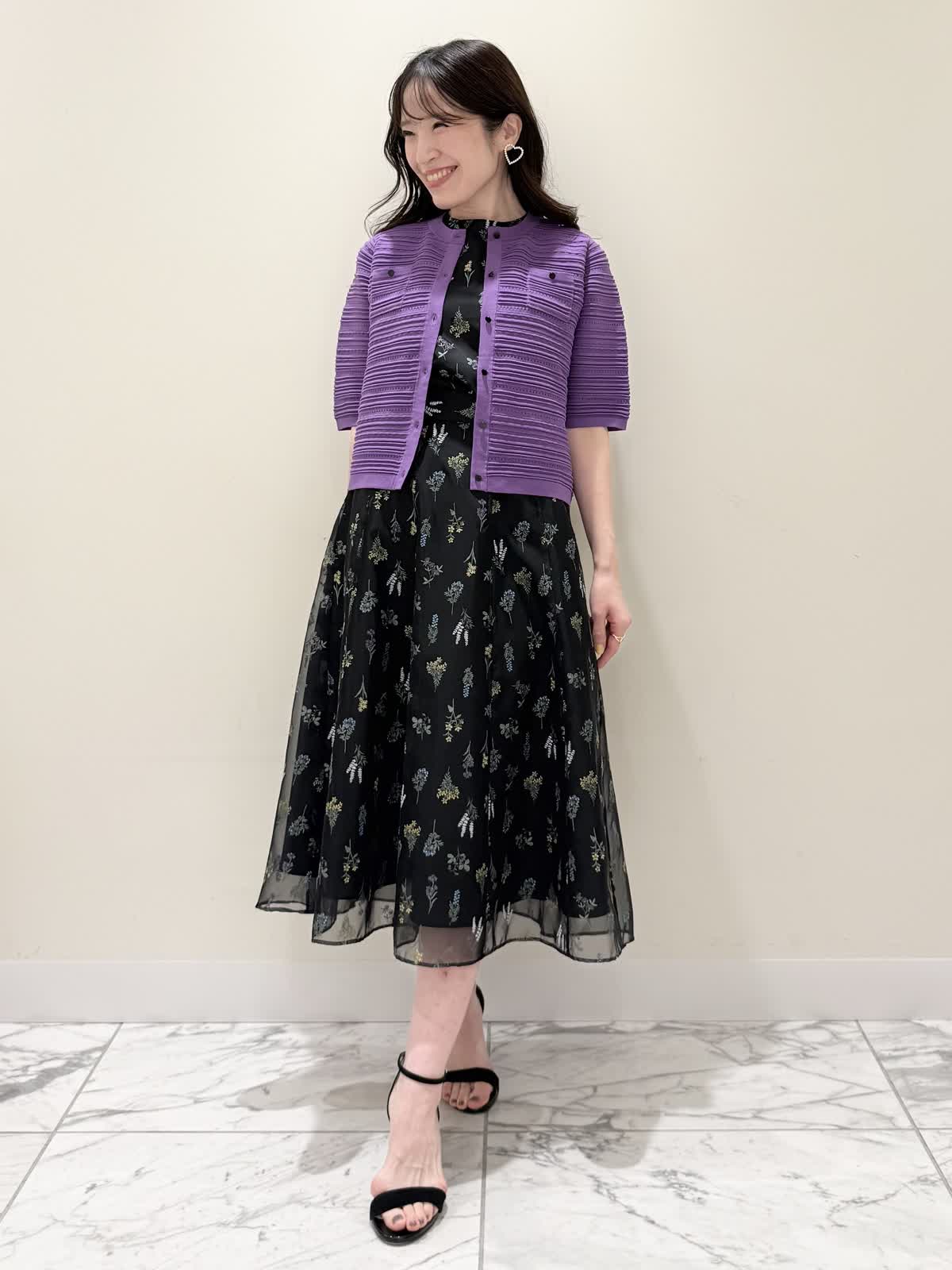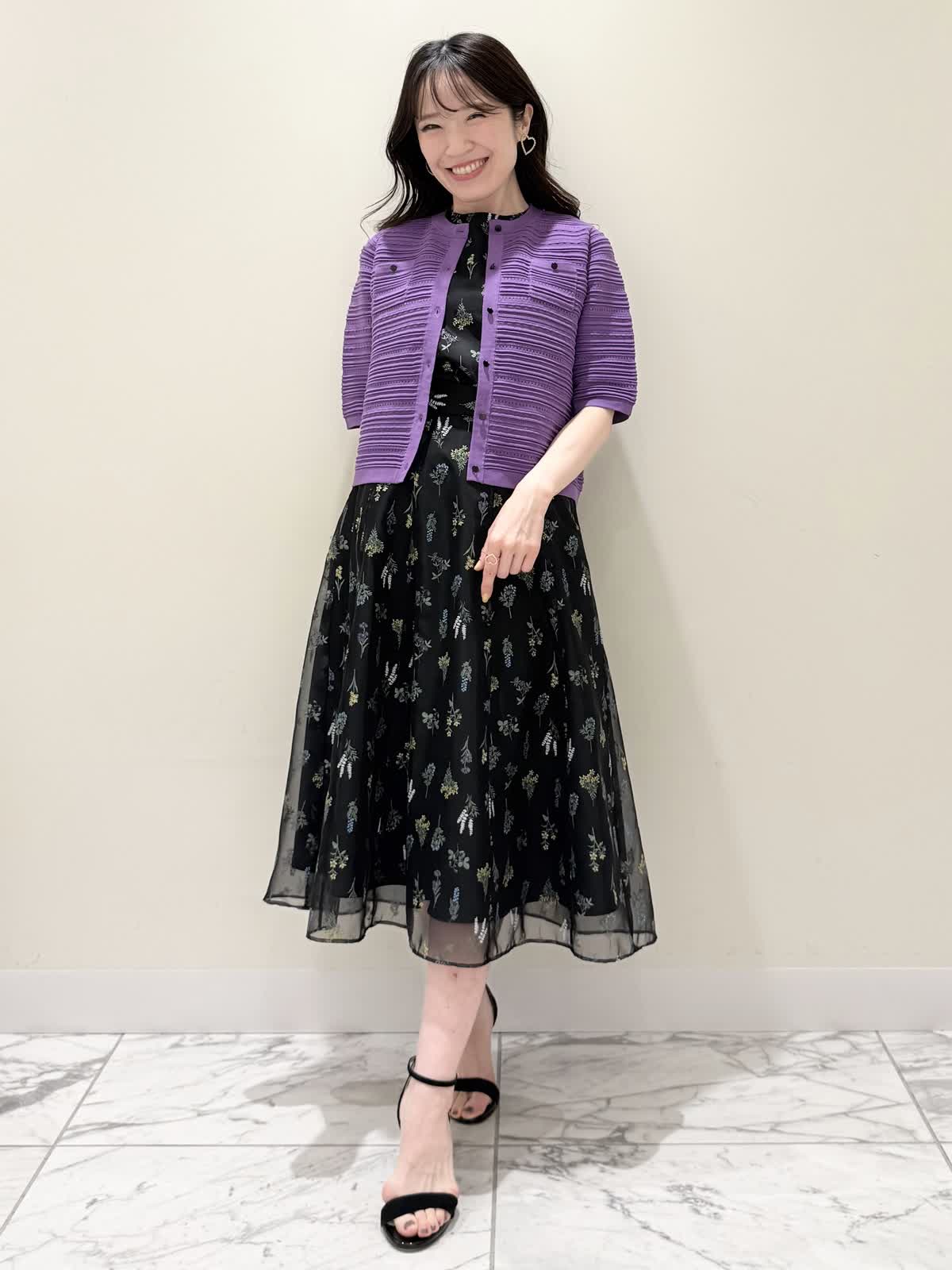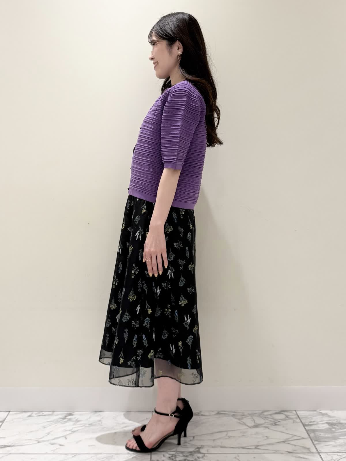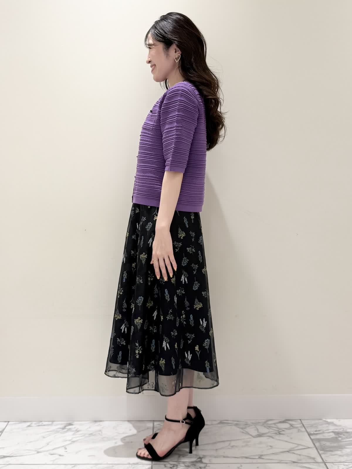 【着用サイズ/カラー】カーディガン:7号/パープル ブラウス:7号/ブラック スカート:5号/ブラック ニット:7号/パープル みんな大好き!着ると気分が上がるツーピースのおすすめコーディネート。ブラックカラーメインにラメでフラワーのプリントを施したmaglieオリジナルの生地。重い印象にならないブラックオーガンジーにブラウスも裏地付きなのでシアーが苦手な方におすすめです。ブラウスはアウトでも綺麗に着られるようにウエストをキュッと絞っており、インをするとワンピース風に着られます。スカートは後ろ柔らかいゴム仕様で履き心地良く、裾が程よい透け感があるので脚を綺麗に見せてくれます。上下共いつものサイズで大丈夫ですが、ブラウスはバストがあり、サラッと着たい方は1サイズ大きめでも良いかと思います。羽織りにパープルのカーディガンを合わせ、コーディネートのポイントしました。ブラウスではなく、パープルのカーディガン、ニットと合わせるのもおすすめです。