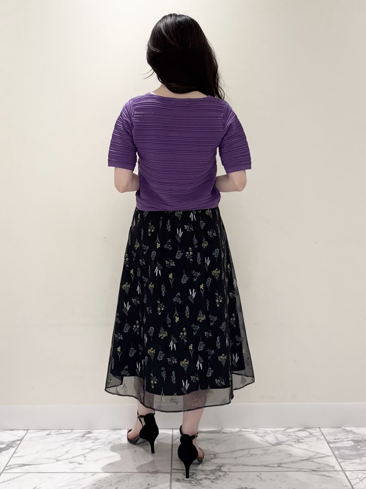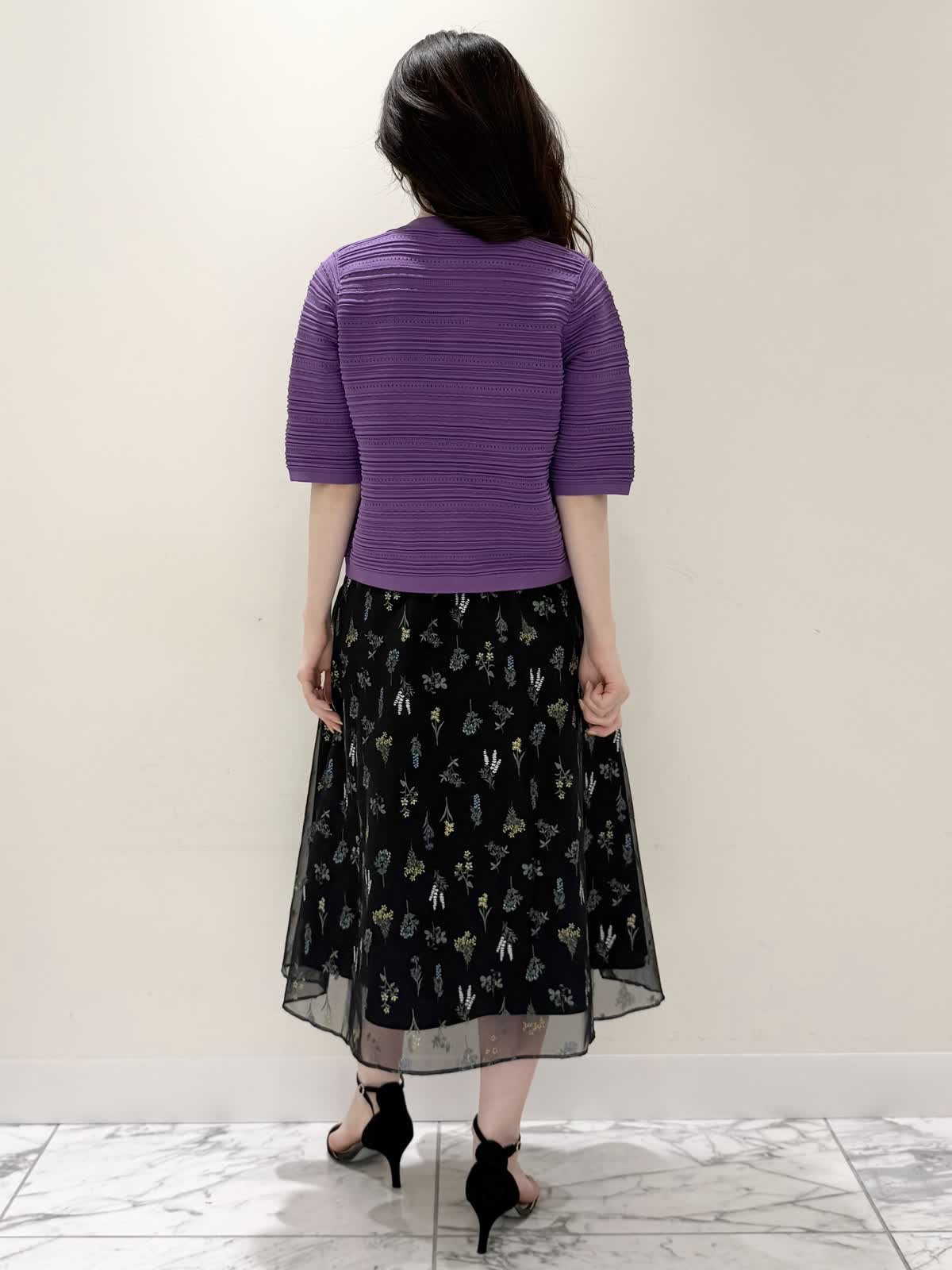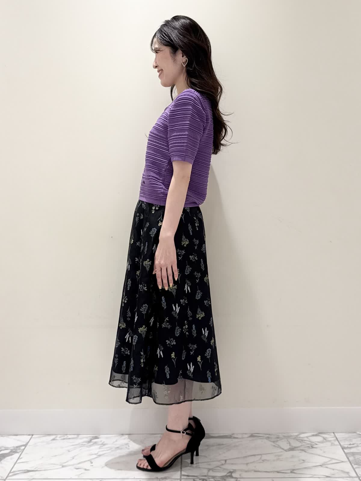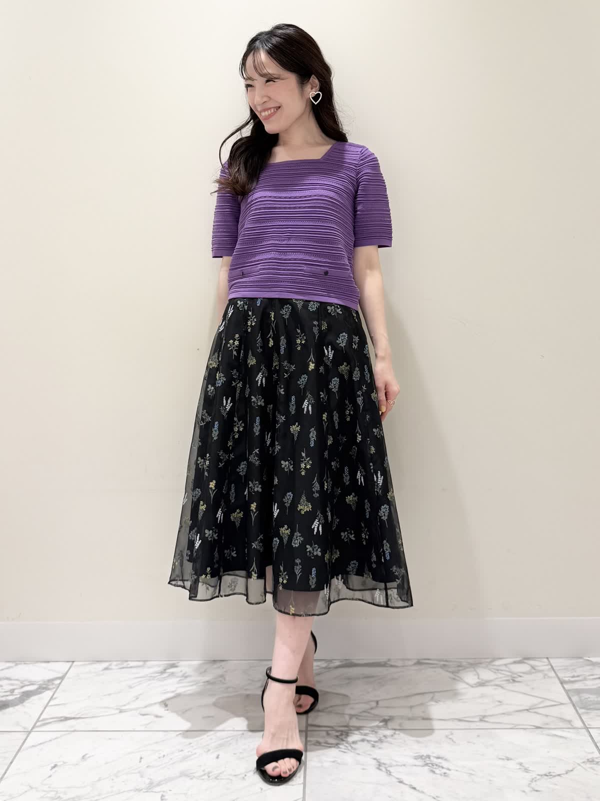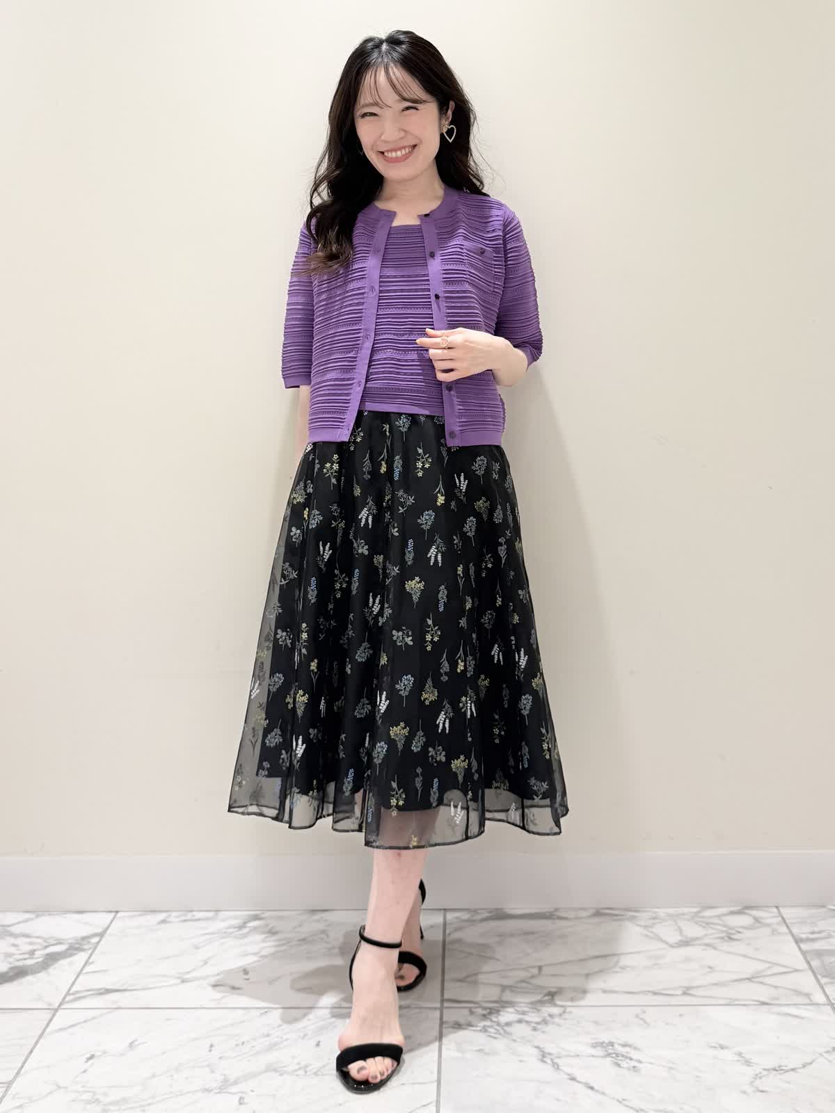 【着用サイズ/カラー】カーディガン:7号/パープル ブラウス:7号/ブラック スカート:5号/ブラック ニット:7号/パープル みんな大好き!着ると気分が上がるツーピースのおすすめコーディネート。ブラックカラーメインにラメでフラワーのプリントを施したmaglieオリジナルの生地。重い印象にならないブラックオーガンジーにブラウスも裏地付きなのでシアーが苦手な方におすすめです。ブラウスはアウトでも綺麗に着られるようにウエストをキュッと絞っており、インをするとワンピース風に着られます。スカートは後ろ柔らかいゴム仕様で履き心地良く、裾が程よい透け感があるので脚を綺麗に見せてくれます。上下共いつものサイズで大丈夫ですが、ブラウスはバストがあり、サラッと着たい方は1サイズ大きめでも良いかと思います。羽織りにパープルのカーディガンを合わせ、コーディネートのポイントしました。ブラウスではなく、パープルのカーディガン、ニットと合わせるのもおすすめです。