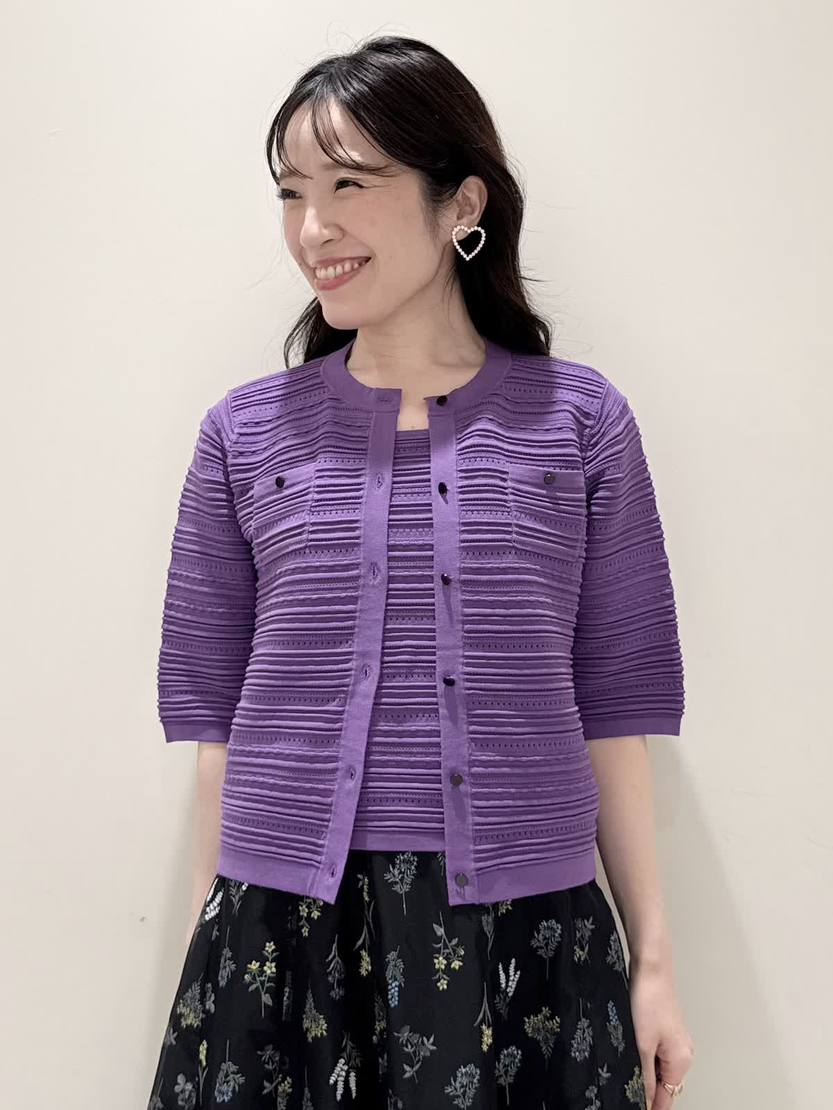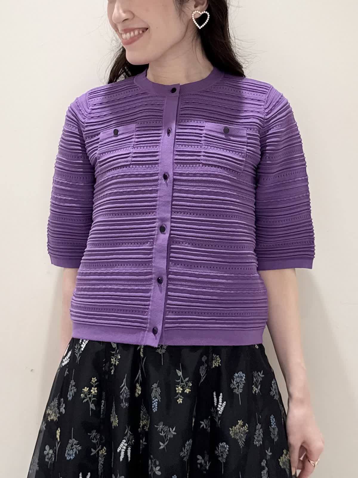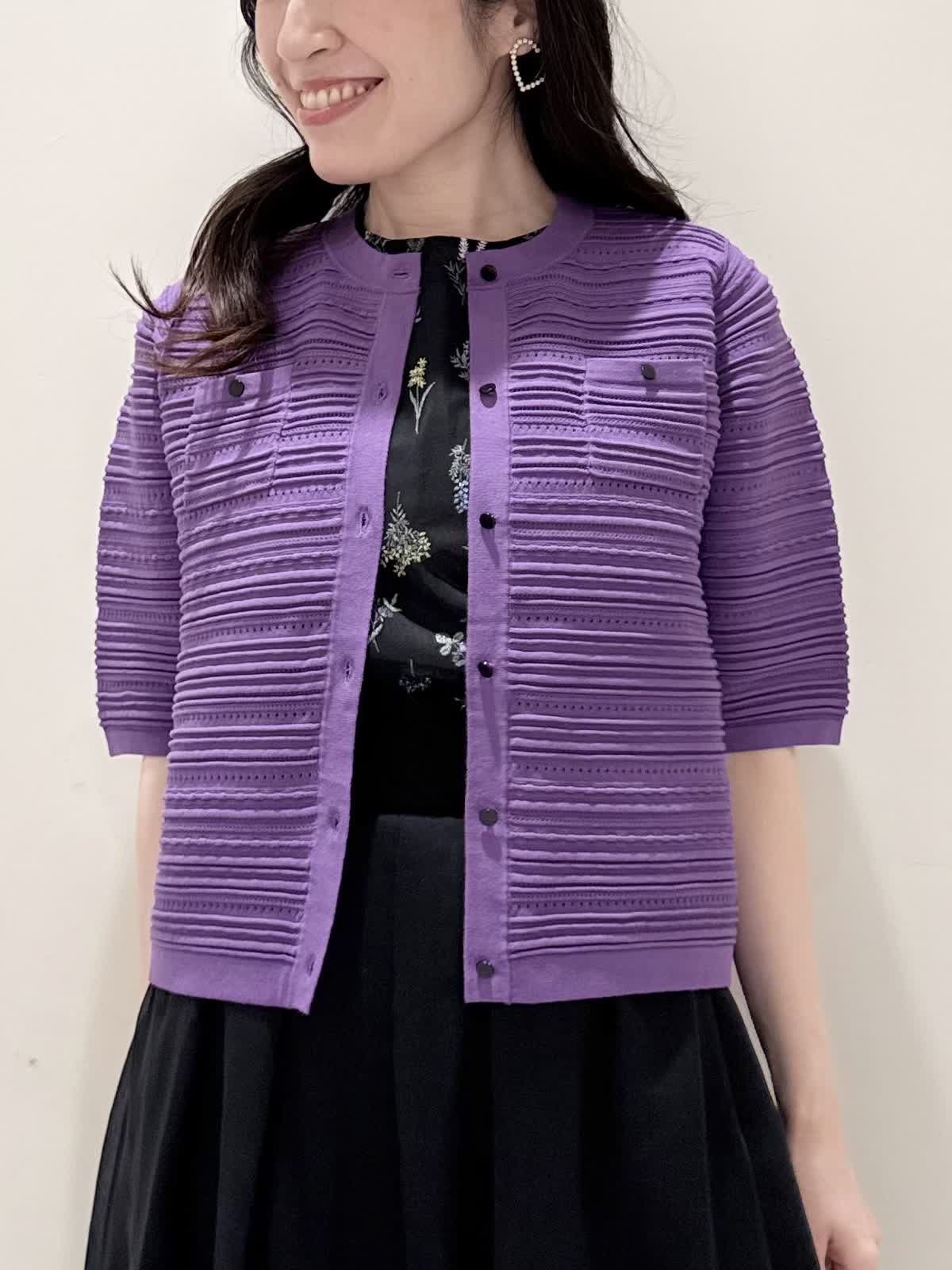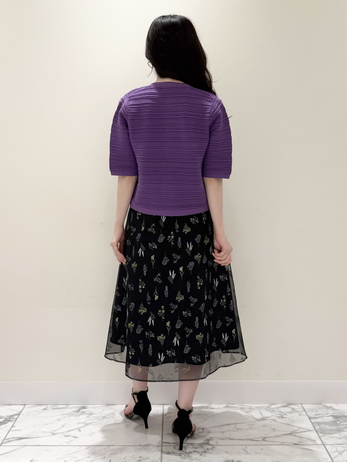 【着用サイズ/カラー】カーディガン:7号/パープル ブラウス:7号/ブラック スカート:5号/ブラック ニット:7号/パープル みんな大好き!着ると気分が上がるツーピースのおすすめコーディネート。ブラックカラーメインにラメでフラワーのプリントを施したmaglieオリジナルの生地。重い印象にならないブラックオーガンジーにブラウスも裏地付きなのでシアーが苦手な方におすすめです。ブラウスはアウトでも綺麗に着られるようにウエストをキュッと絞っており、インをするとワンピース風に着られます。スカートは後ろ柔らかいゴム仕様で履き心地良く、裾が程よい透け感があるので脚を綺麗に見せてくれます。上下共いつものサイズで大丈夫ですが、ブラウスはバストがあり、サラッと着たい方は1サイズ大きめでも良いかと思います。羽織りにパープルのカーディガンを合わせ、コーディネートのポイントしました。ブラウスではなく、パープルのカーディガン、ニットと合わせるのもおすすめです。