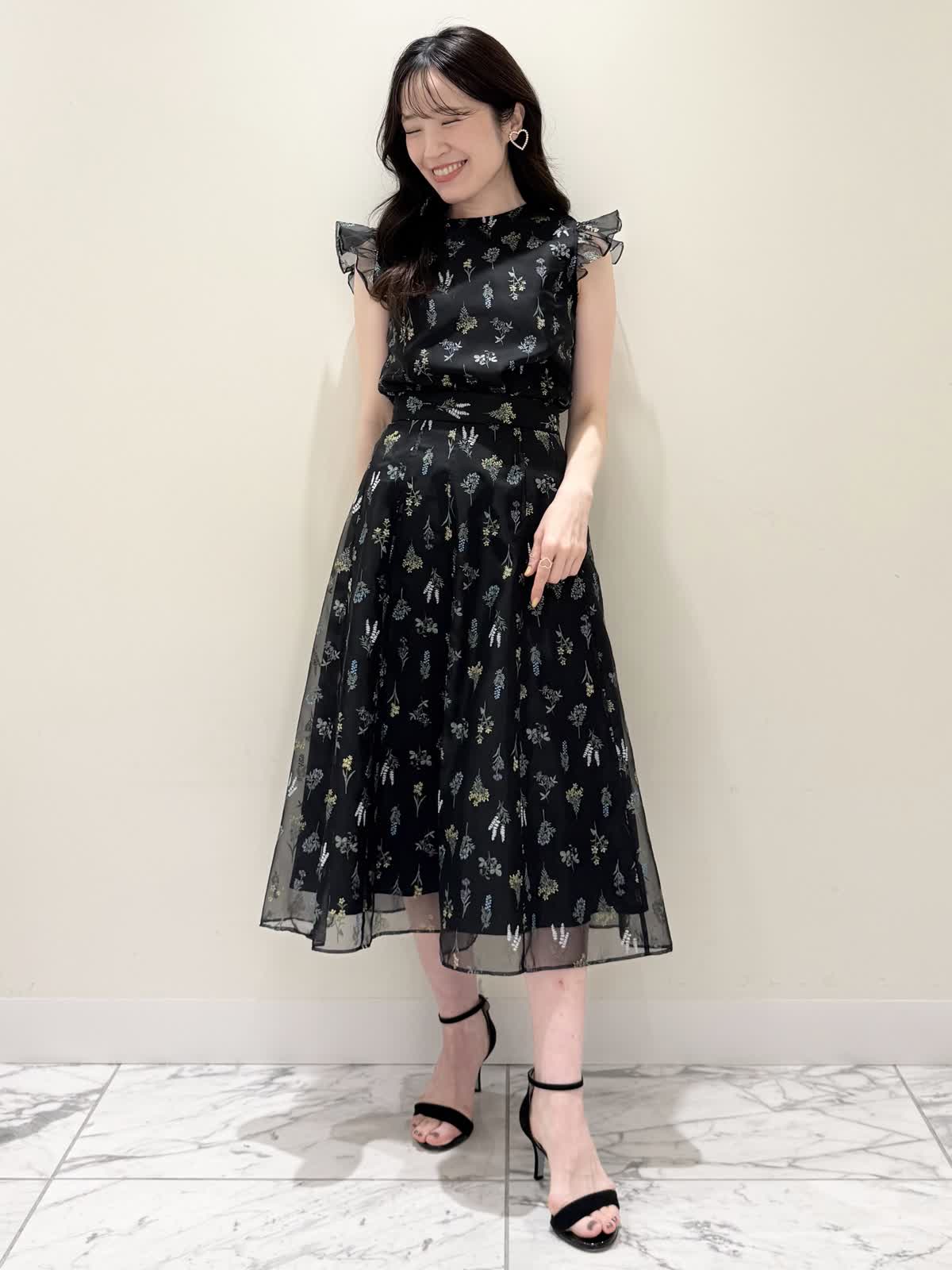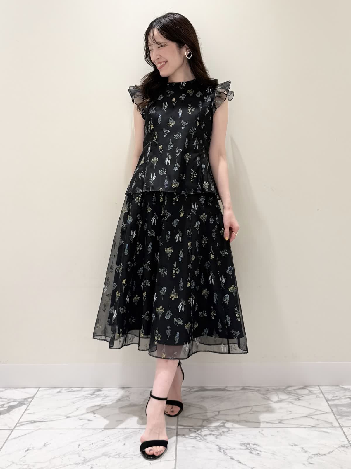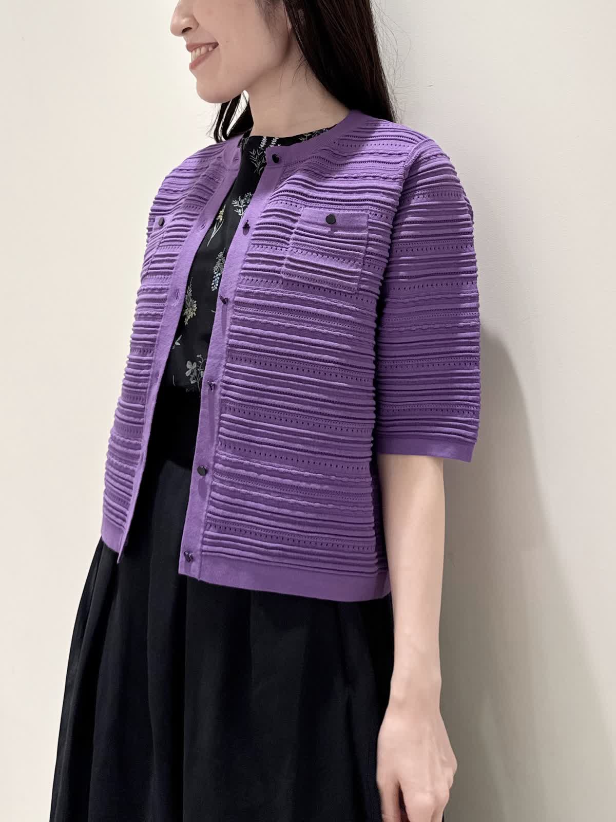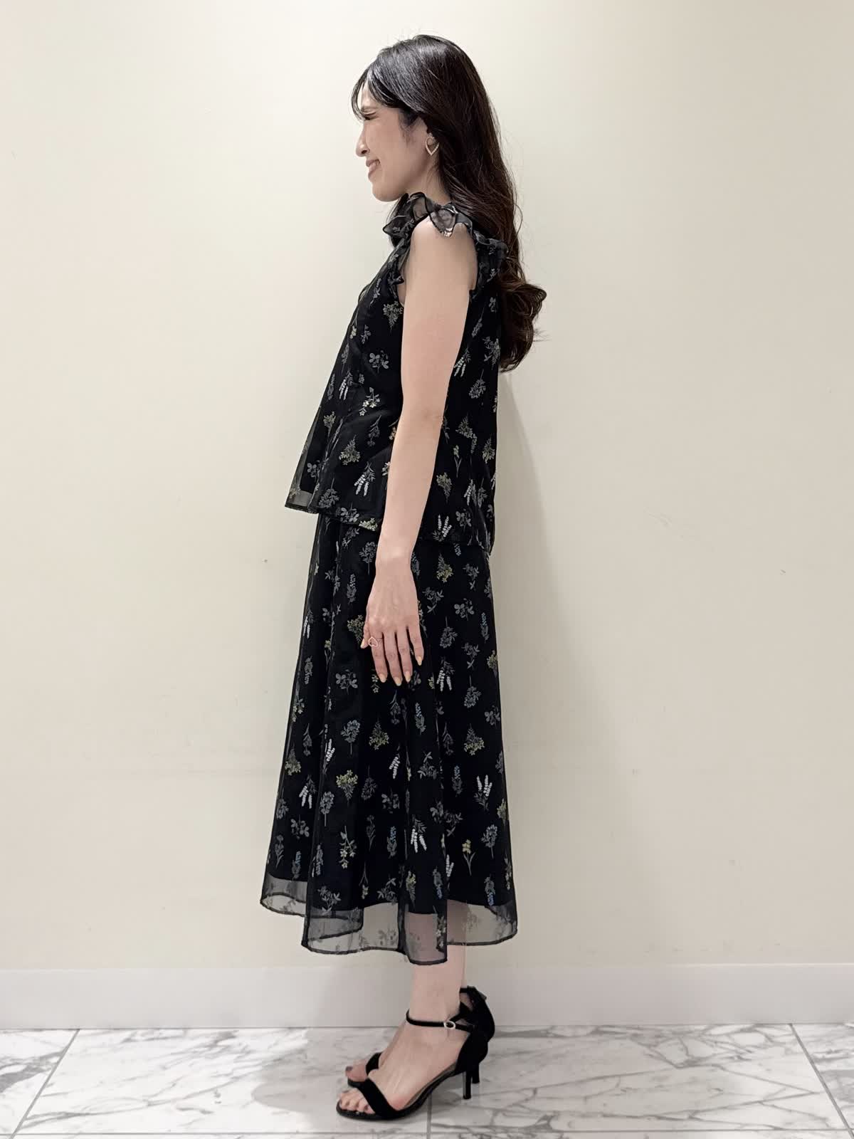 【着用サイズ/カラー】カーディガン:7号/パープル ブラウス:7号/ブラック スカート:5号/ブラック ニット:7号/パープル みんな大好き!着ると気分が上がるツーピースのおすすめコーディネート。ブラックカラーメインにラメでフラワーのプリントを施したmaglieオリジナルの生地。重い印象にならないブラックオーガンジーにブラウスも裏地付きなのでシアーが苦手な方におすすめです。ブラウスはアウトでも綺麗に着られるようにウエストをキュッと絞っており、インをするとワンピース風に着られます。スカートは後ろ柔らかいゴム仕様で履き心地良く、裾が程よい透け感があるので脚を綺麗に見せてくれます。上下共いつものサイズで大丈夫ですが、ブラウスはバストがあり、サラッと着たい方は1サイズ大きめでも良いかと思います。羽織りにパープルのカーディガンを合わせ、コーディネートのポイントしました。ブラウスではなく、パープルのカーディガン、ニットと合わせるのもおすすめです。
