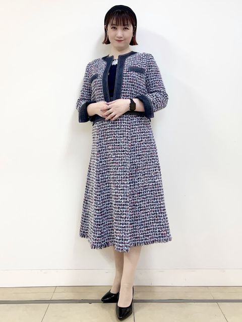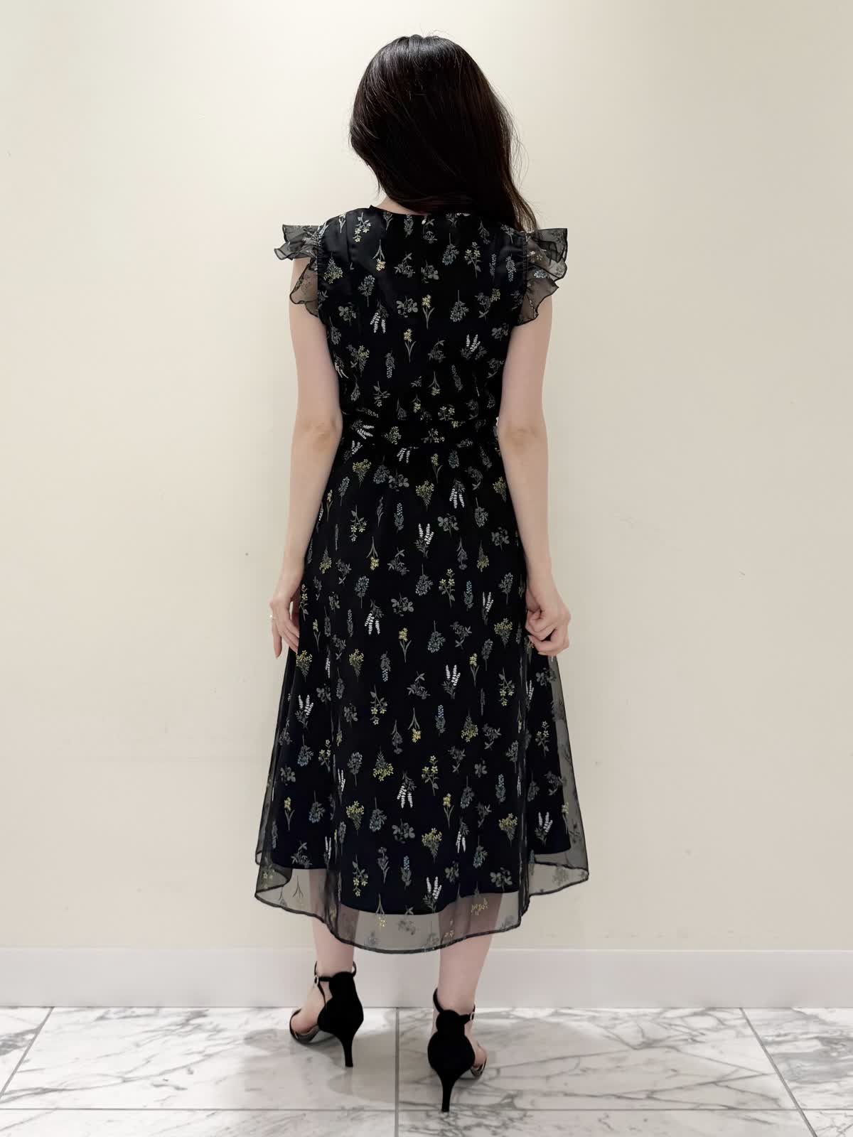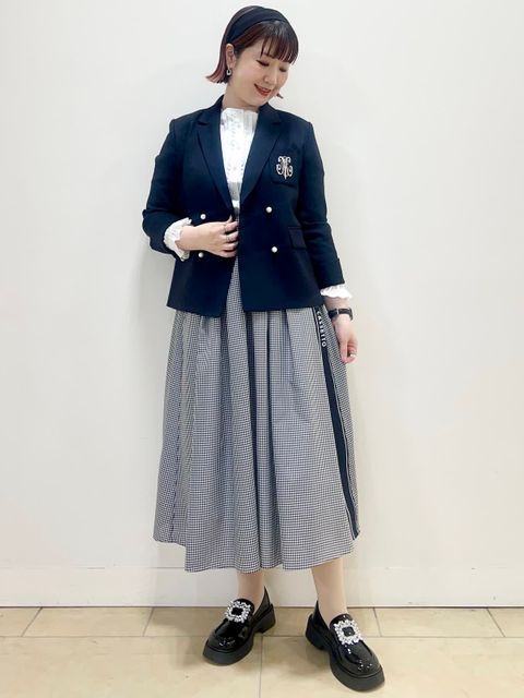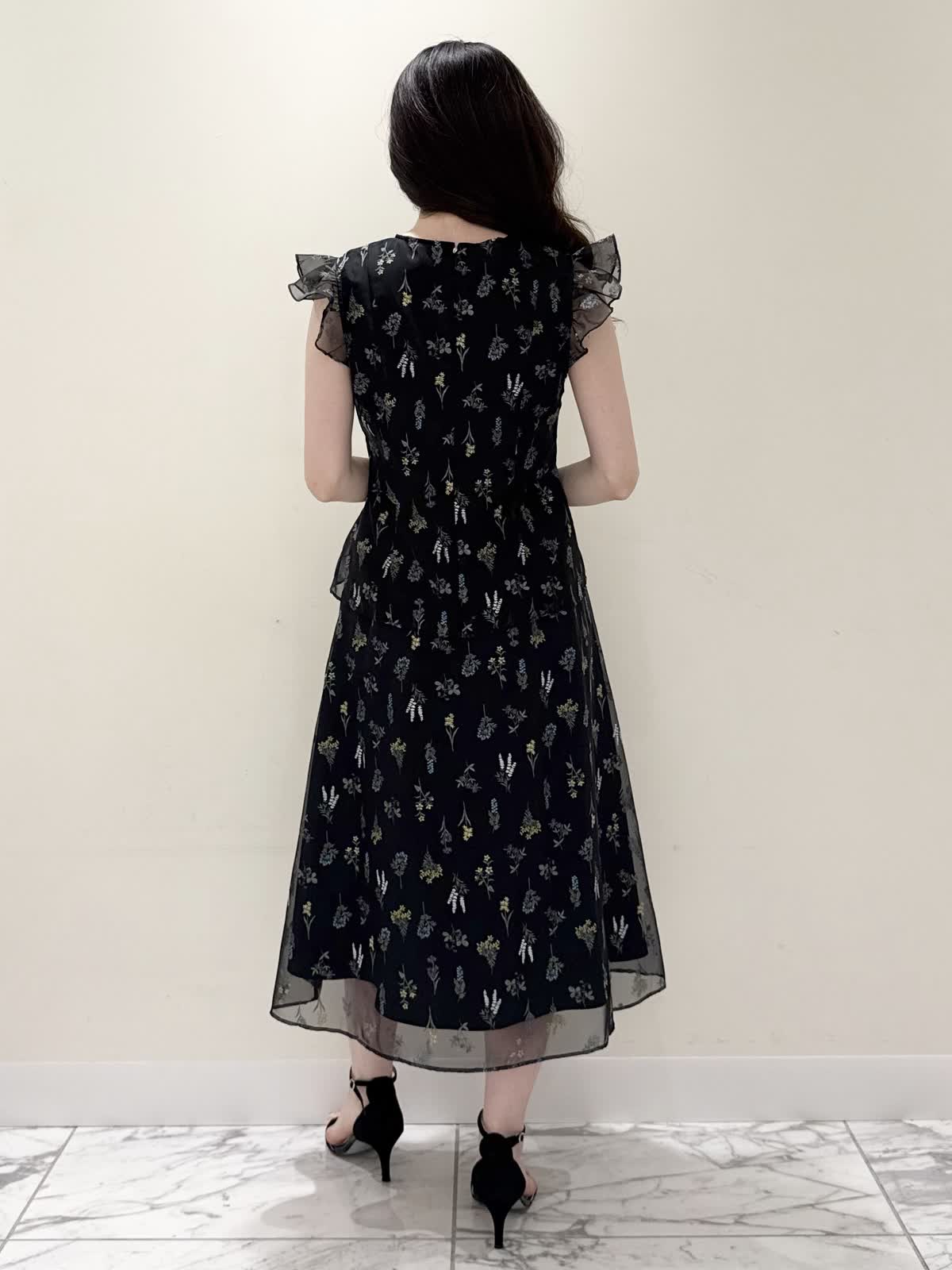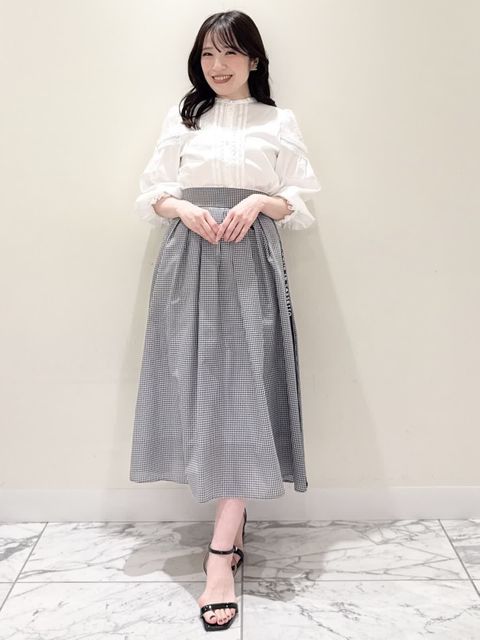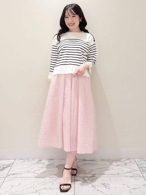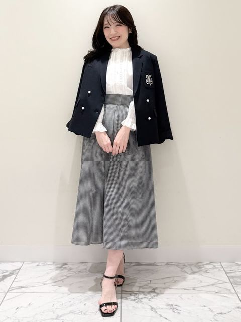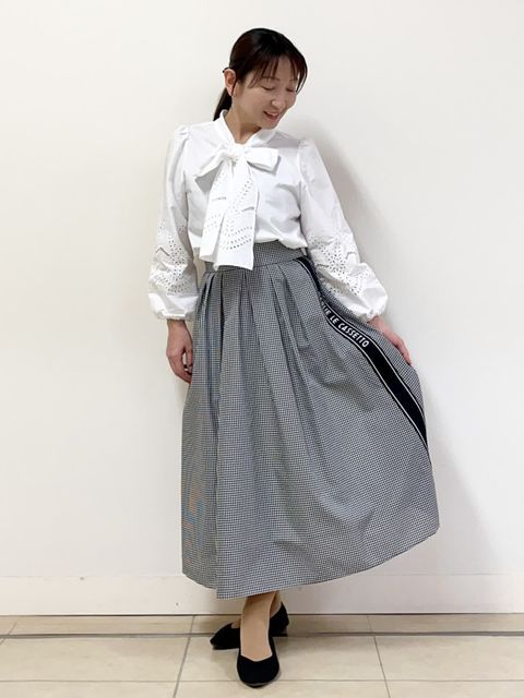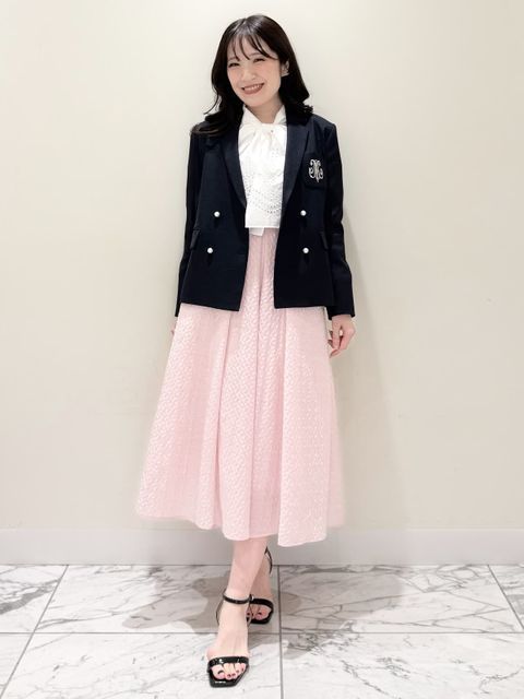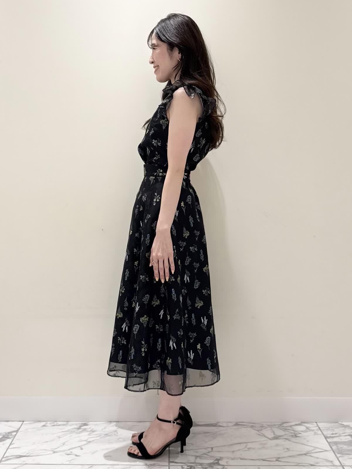【着用サイズ/カラー】カーディガン:7号/パープル ブラウス:7号/ブラック スカート:5号/ブラック ニット:7号/パープル みんな大好き!着ると気分が上がるツーピースのおすすめコーディネート。ブラックカラーメインにラメでフラワーのプリントを施したmaglieオリジナルの生地。重い印象にならないブラックオーガンジーにブラウスも裏地付きなのでシアーが苦手な方におすすめです。ブラウスはアウトでも綺麗に着られるようにウエストをキュッと絞っており、インをするとワンピース風に着られます。スカートは後ろ柔らかいゴム仕様で履き心地良く、裾が程よい透け感があるので脚を綺麗に見せてくれます。上下共いつものサイズで大丈夫ですが、ブラウスはバストがあり、サラッと着たい方は1サイズ大きめでも良いかと思います。羽織りにパープルのカーディガンを合わせ、コーディネートのポイントしました。ブラウスではなく、パープルのカーディガン、ニットと合わせるのもおすすめです。