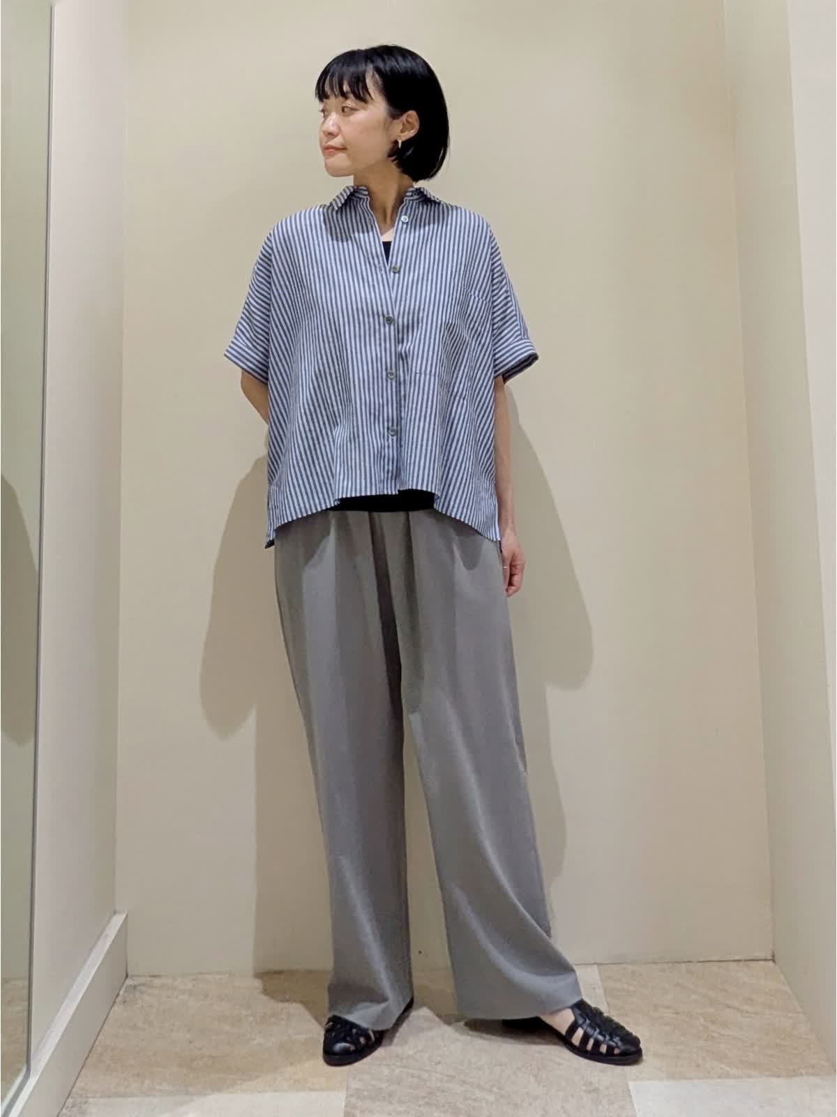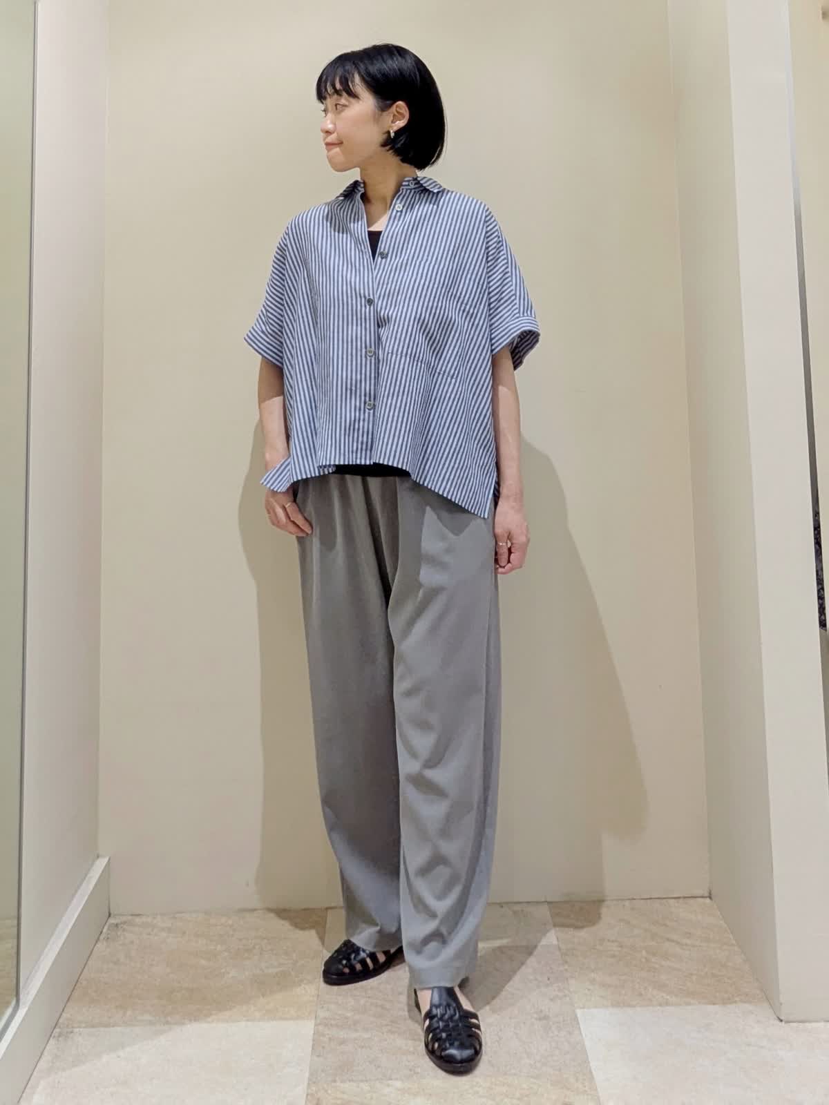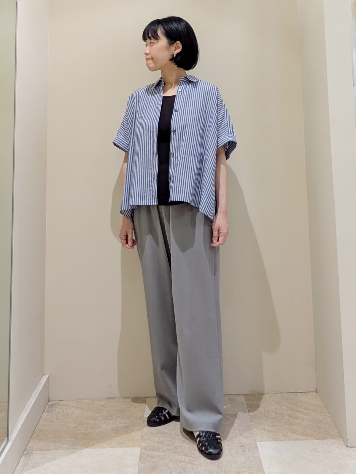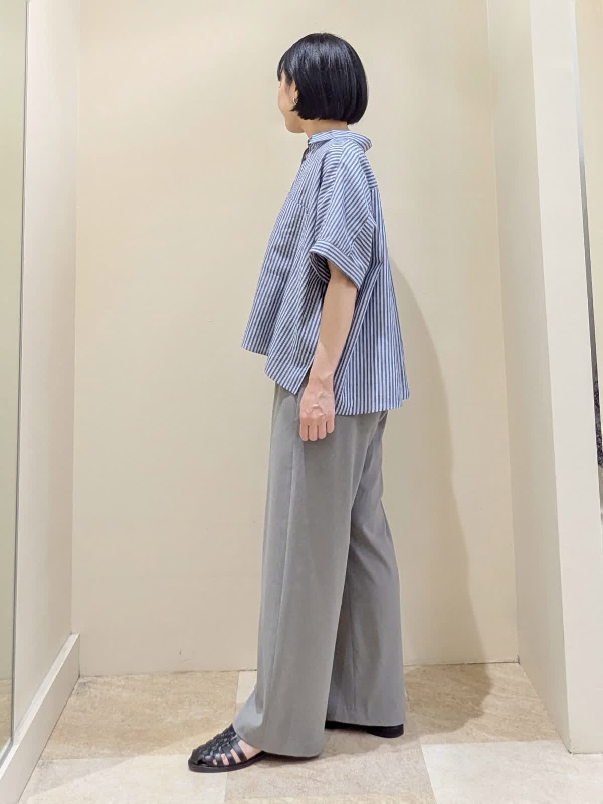 【着用サイズ】全てフリー 【着用カラー】ブラウス/ブルー、パンツ/グレー 『ストライプシャツのマニッシュスタイル』定番ストライプシャツもワイドシルエットが今っぽい。軽く羽織る着方もおすすめです。ボトムスにきちんと感のあるグレーを選ぶと、マニッシュな雰囲気に。