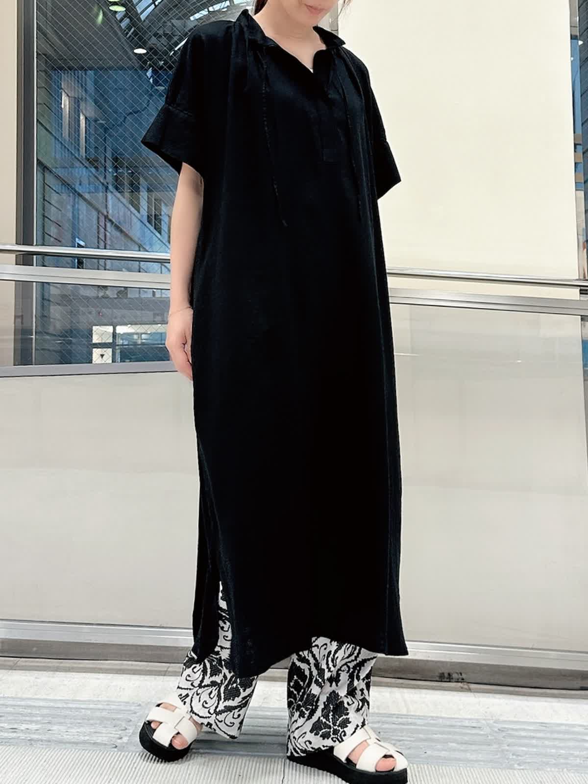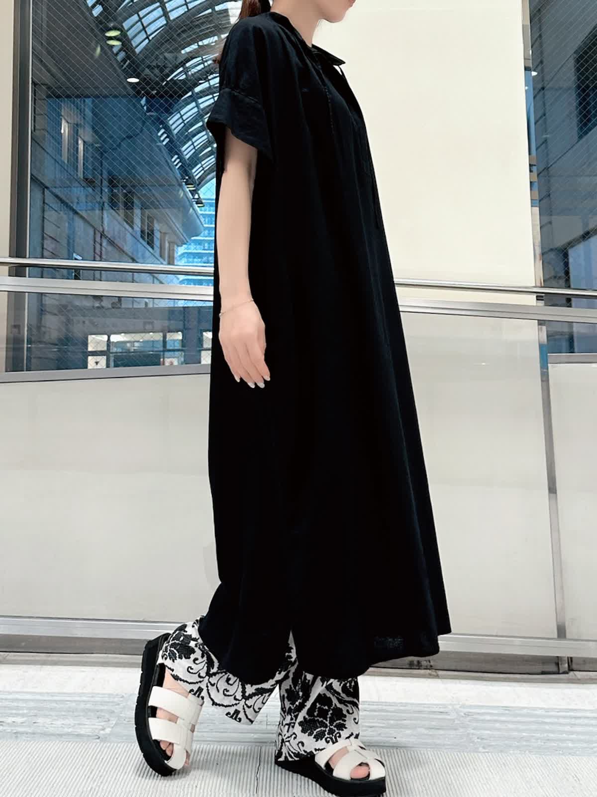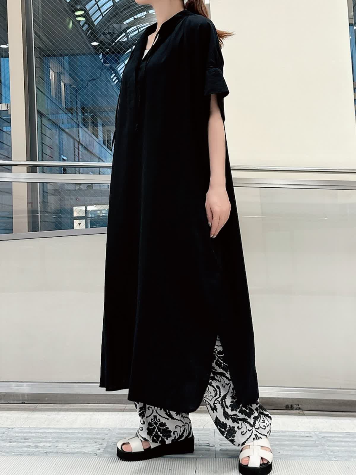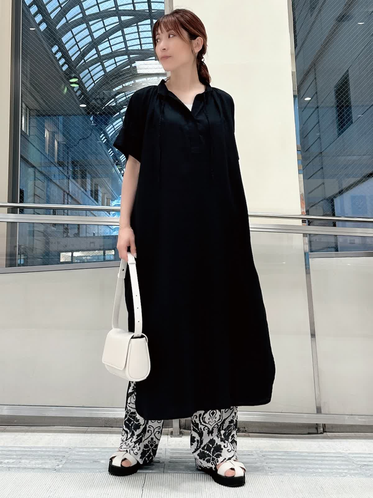 【着用サイズ/カラー】 ワンピース:9号/ブラック パンツ:9号/ベージュ タンクトップ:7号/グレー 1枚でサマになる黒のワンピースも柄のパンツとレイヤードで軽やかさとこなれ感アップ。 チュニックのような感覚でパンツをレイヤードすれば気になる体型カバーも◎ サイドにスリットが入っているので足さばきよく着て頂けます。