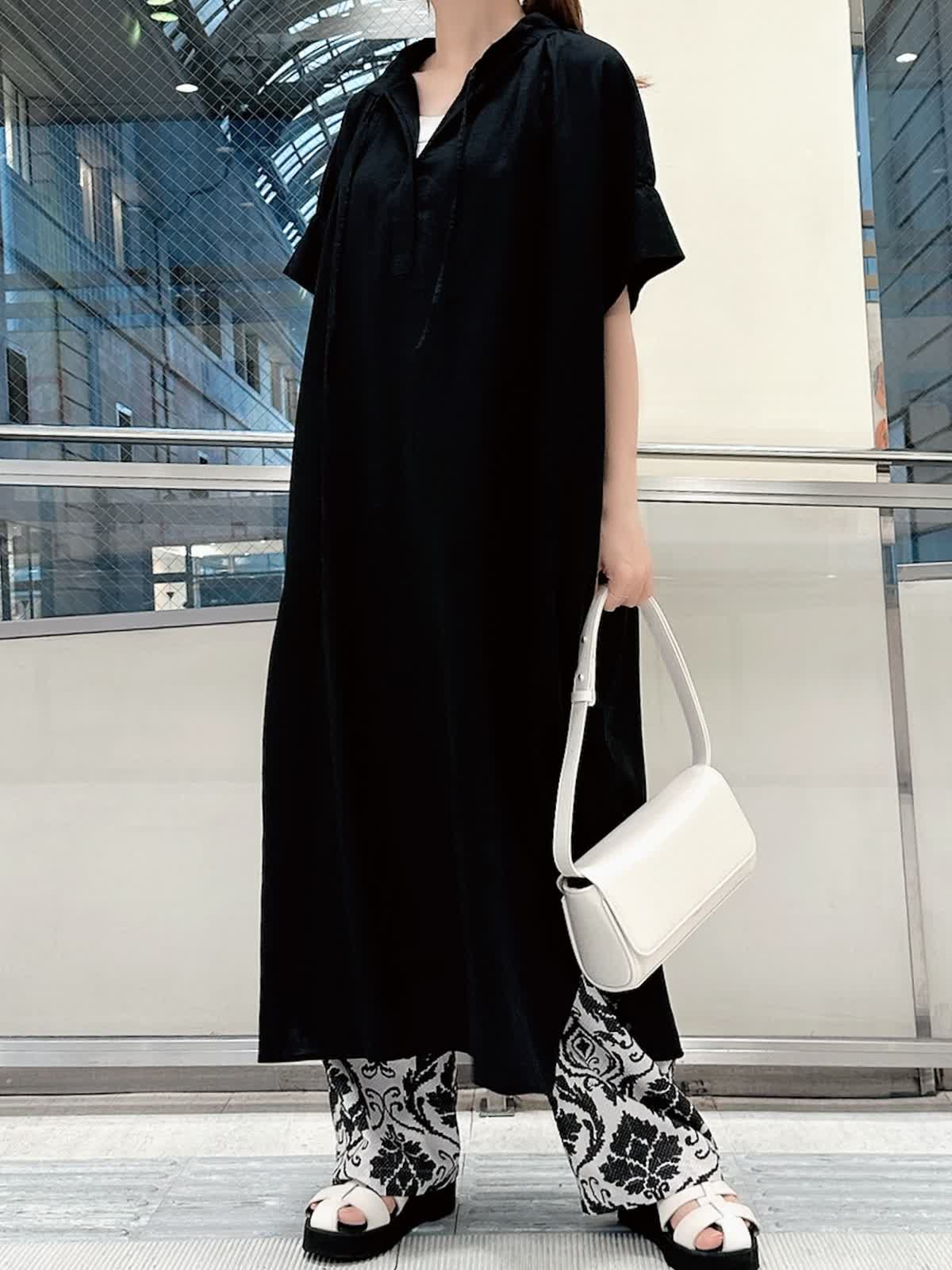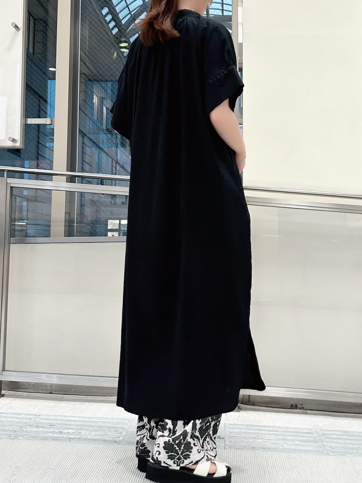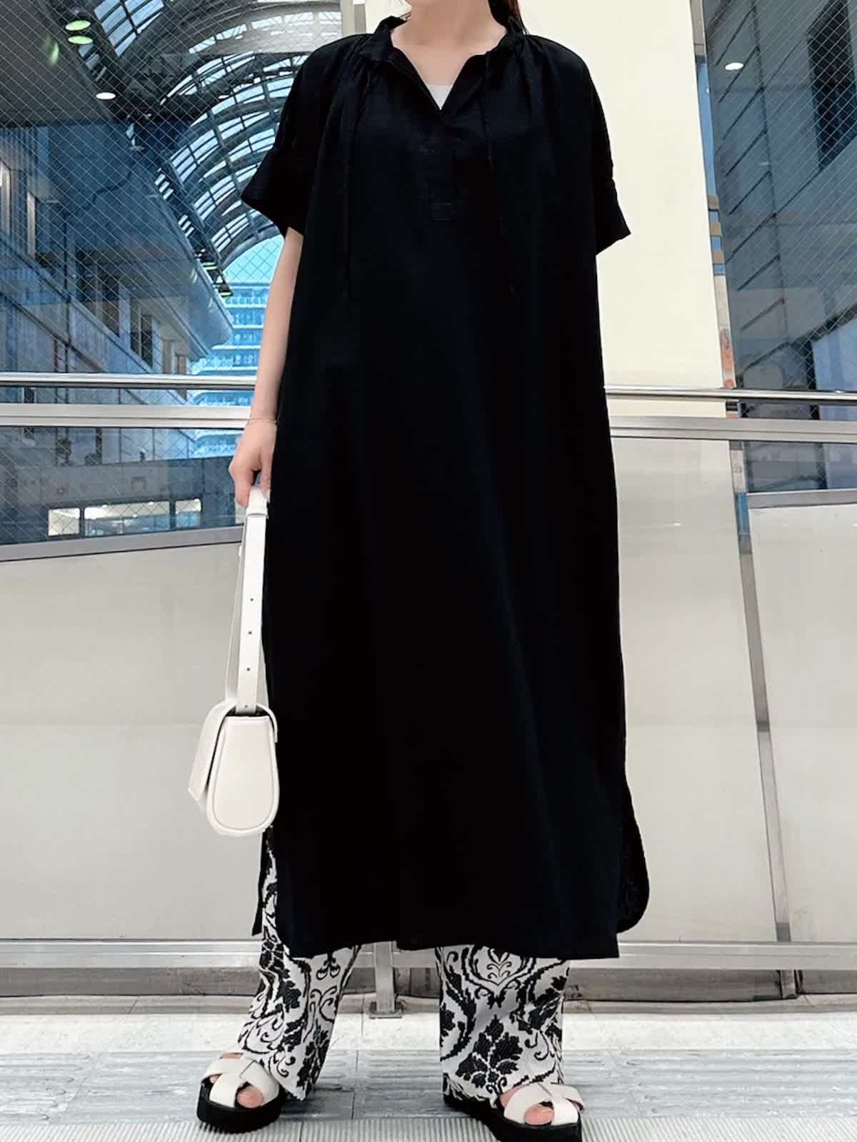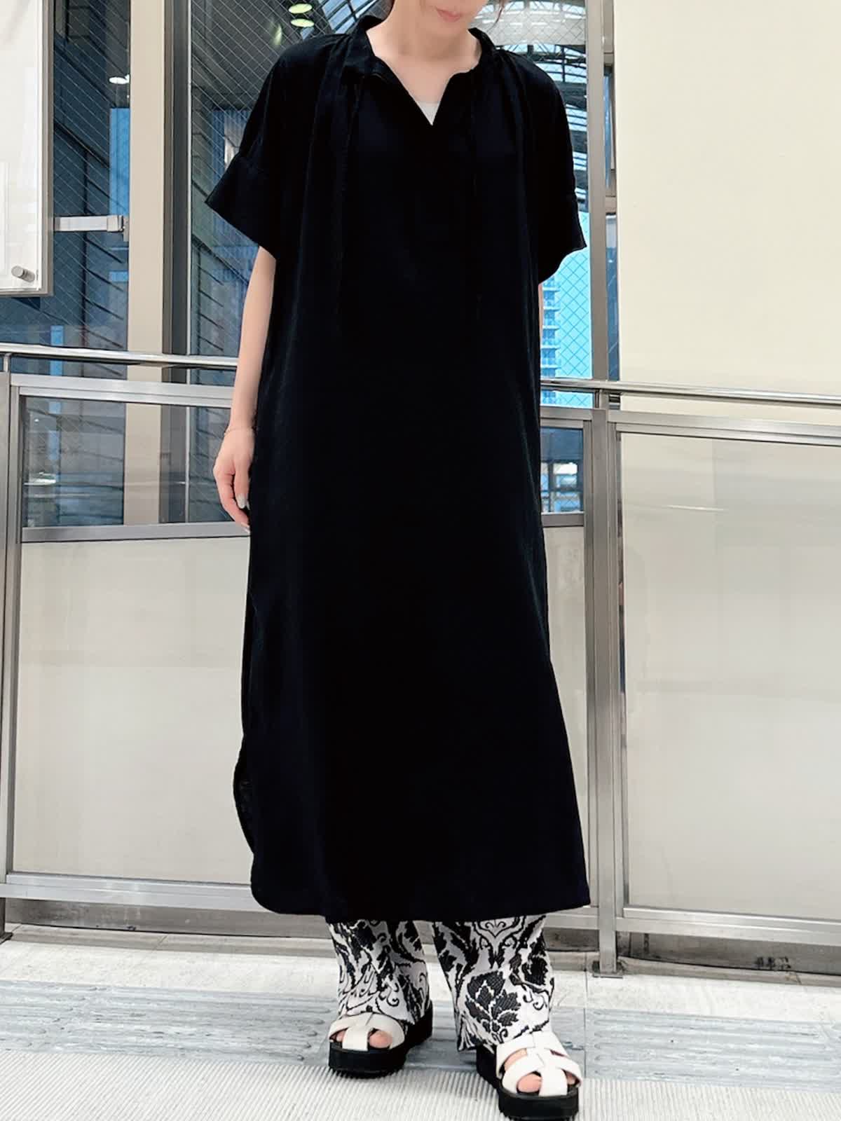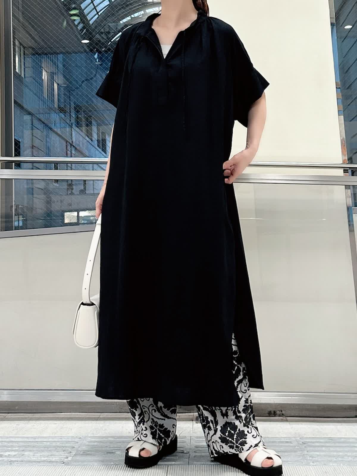 【着用サイズ/カラー】 ワンピース:9号/ブラック パンツ:9号/ベージュ タンクトップ:7号/グレー 1枚でサマになる黒のワンピースも柄のパンツとレイヤードで軽やかさとこなれ感アップ。 チュニックのような感覚でパンツをレイヤードすれば気になる体型カバーも◎ サイドにスリットが入っているので足さばきよく着て頂けます。
