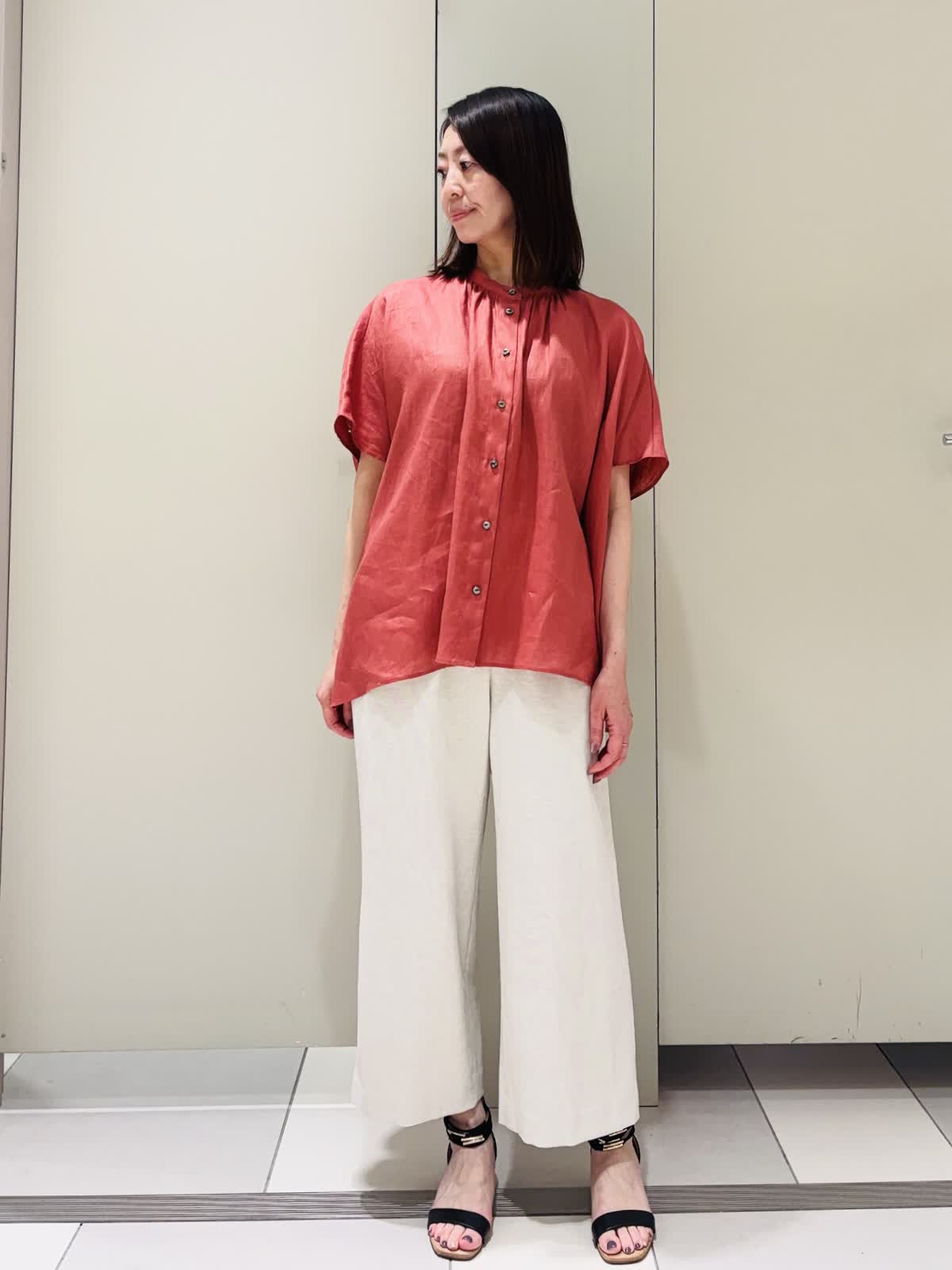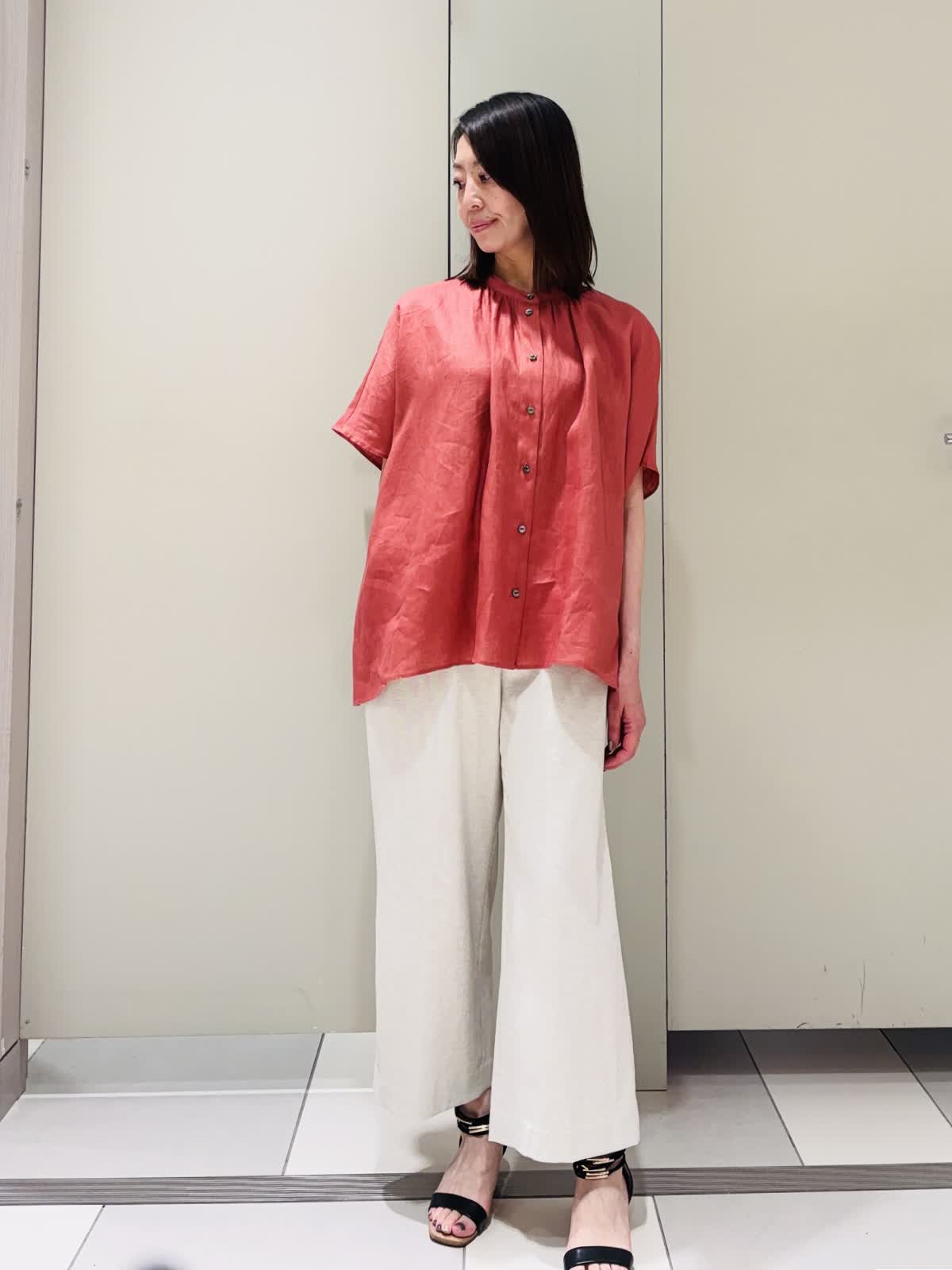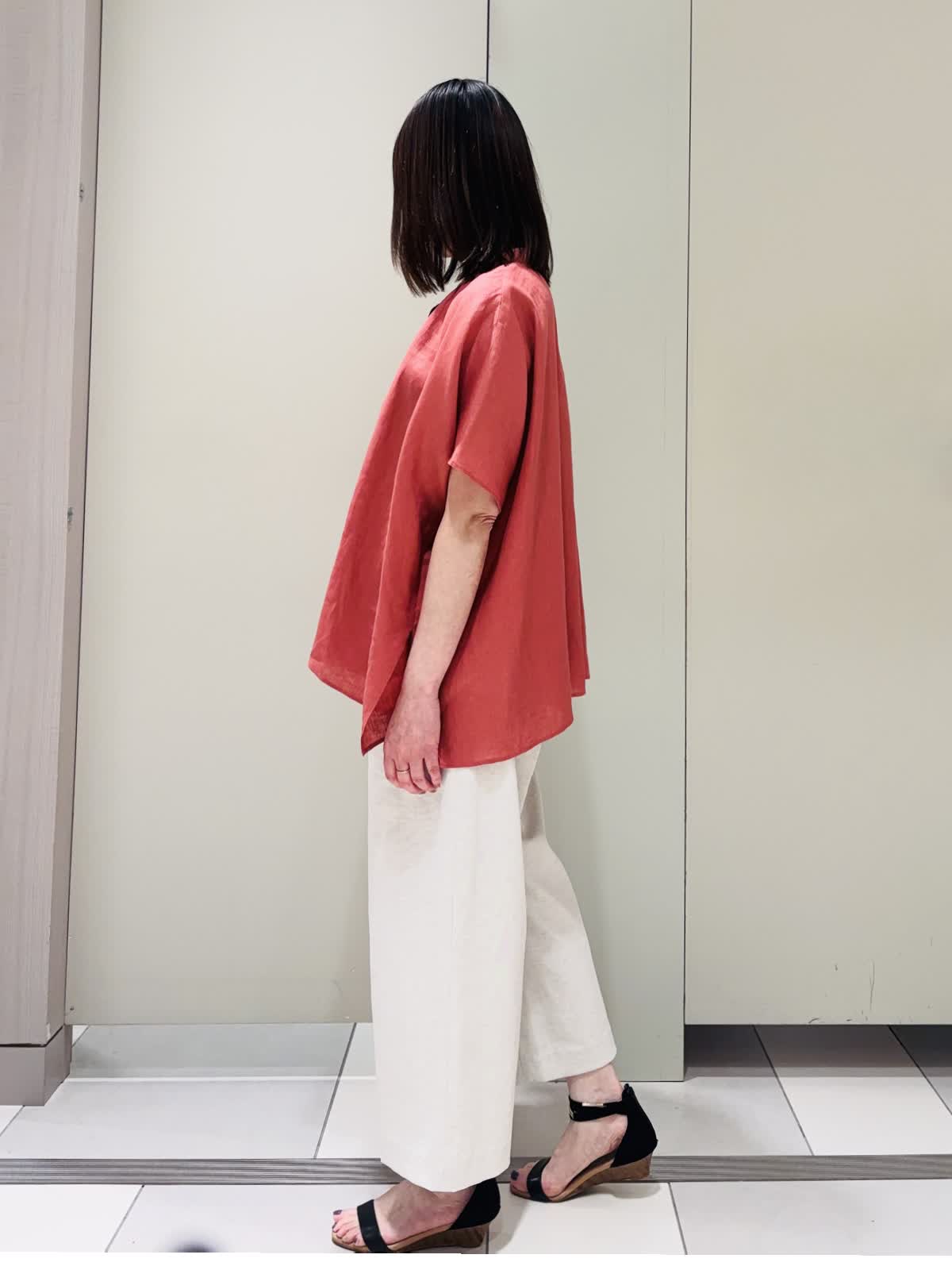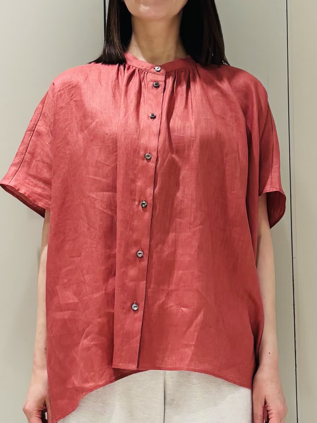 【着用サイズ】ブラウス:フリー パンツ:9号【着用カラー】ブラウス:ピンク パンツ:ベージュ ポンチョ風のシルエットが特徴のバンドカラーブラウス。麻100%で身体を締め付けないデザインなので涼しく着用できる。柔らかくて軽く動きが出るのでこれからの時期にぴったりです。