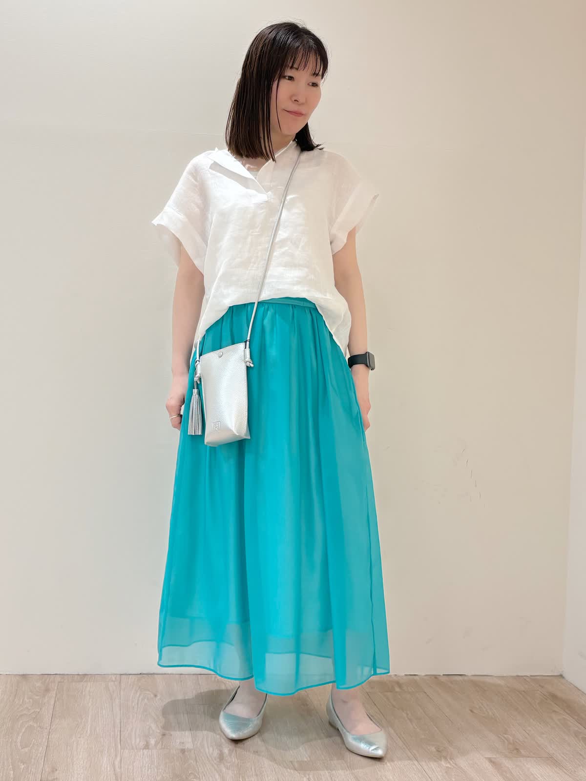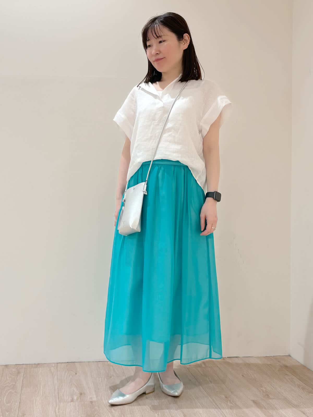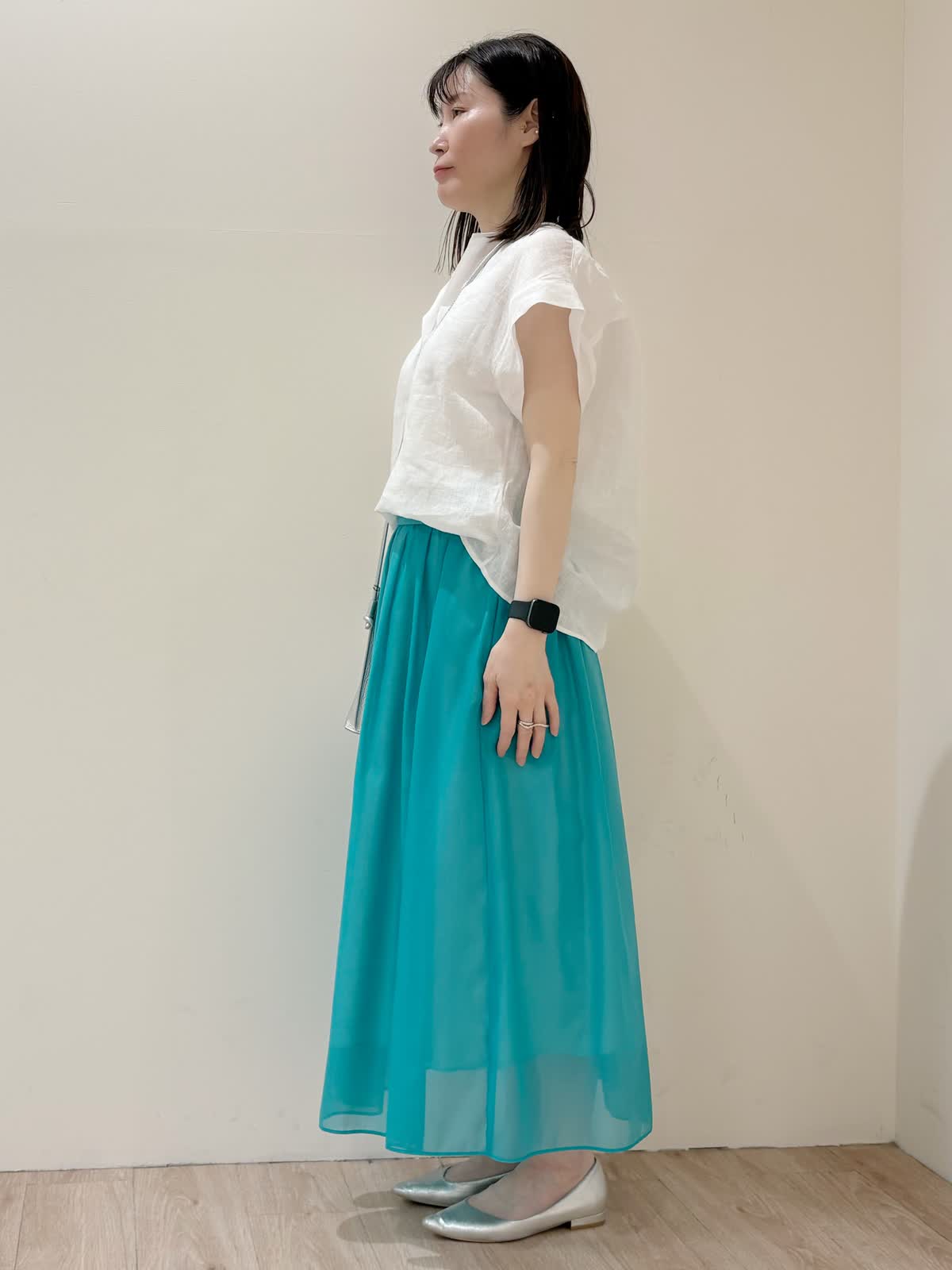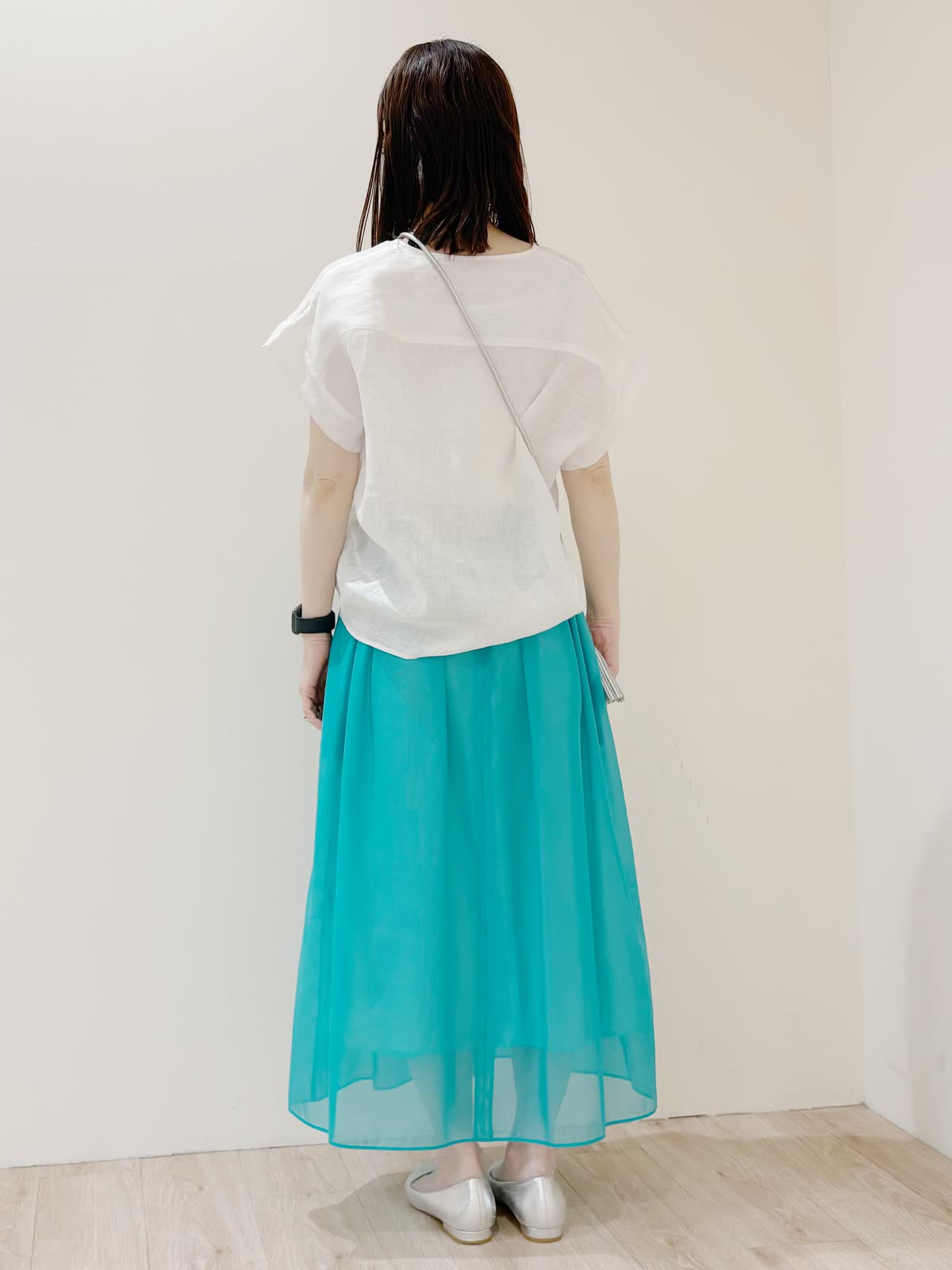 【着用サイズ】ブラウス:9号スカート:9号【着用カラー】ブラウス:オフホワイト スカート:ペールグリーン 初夏のお散歩コーディネート。 リネン100%のブラウスは涼しく初夏のお出かけにピッタリ。洗えるしすぐ乾くので取り扱いも便利です。スカートは裏地が少し短くなっていて軽い雰囲気になります。